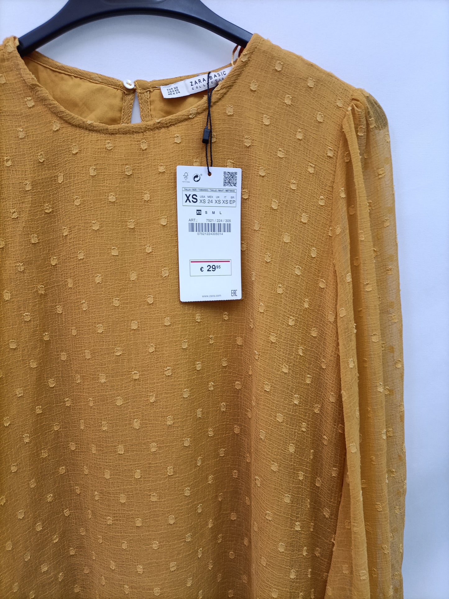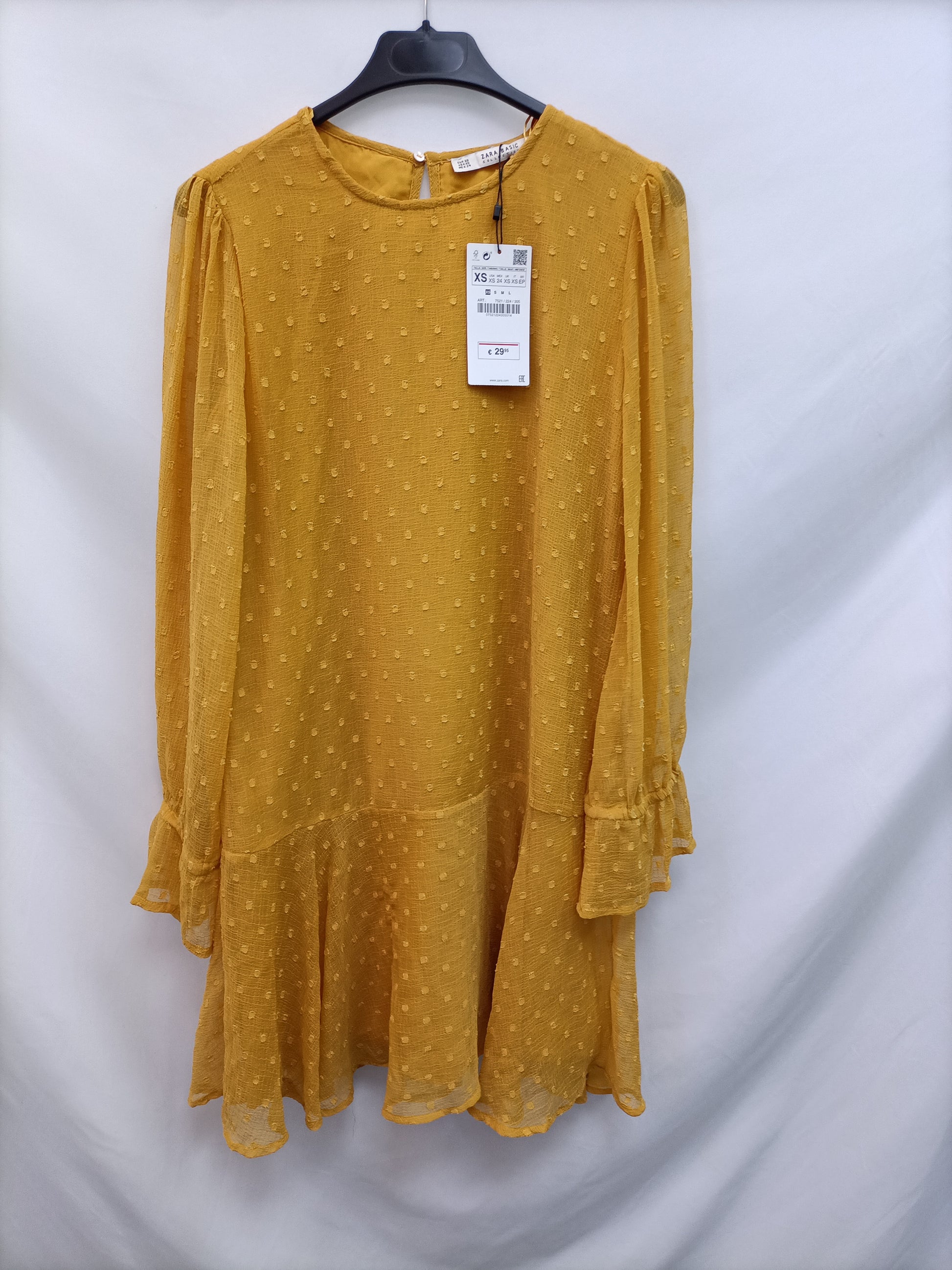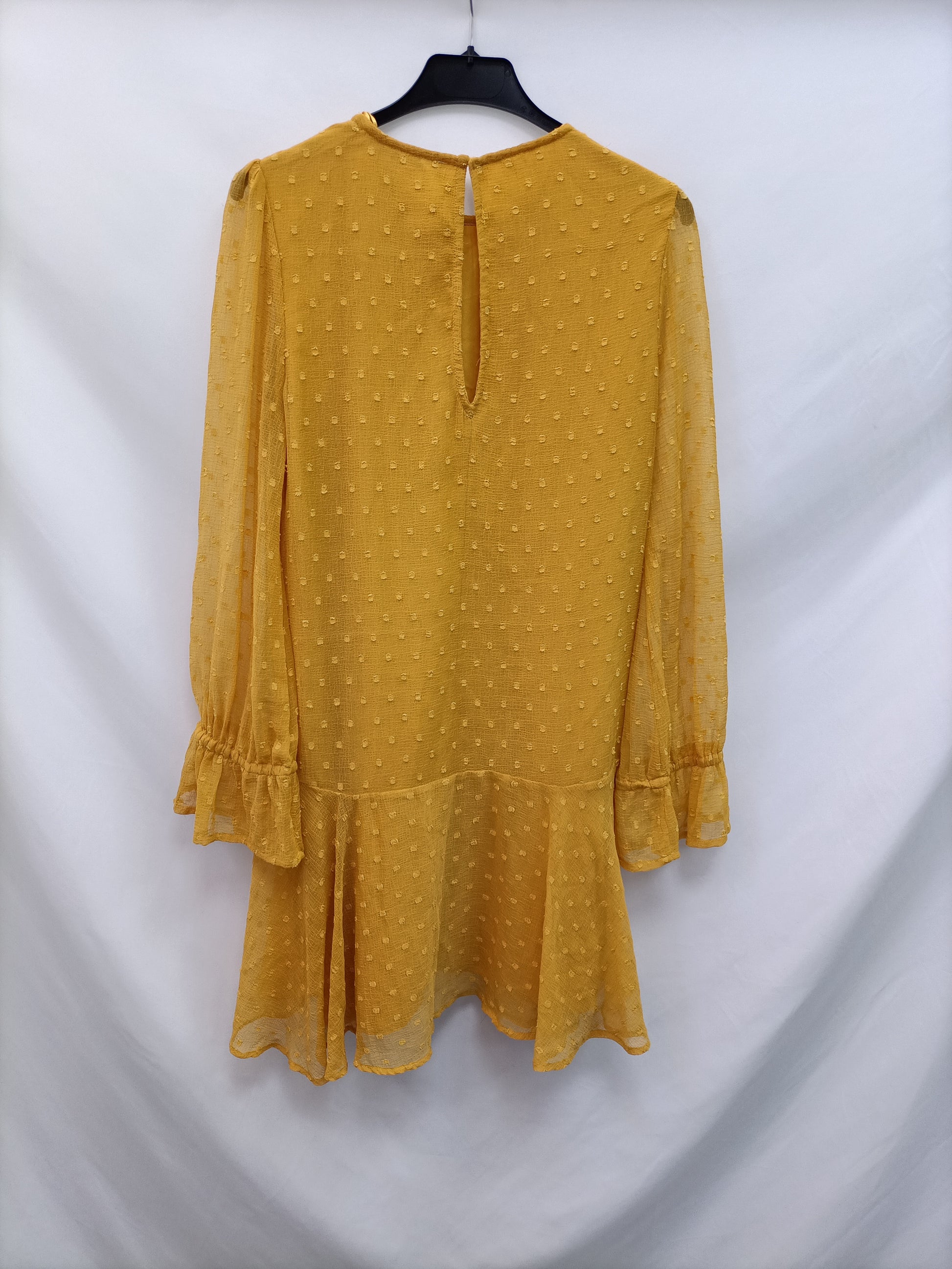 NUEVO CON ETIQUETA. vestido fluido mostaza de plumeti. Mangas semitransparentes. De sisa a sisa 45 cm Largo 85 cm