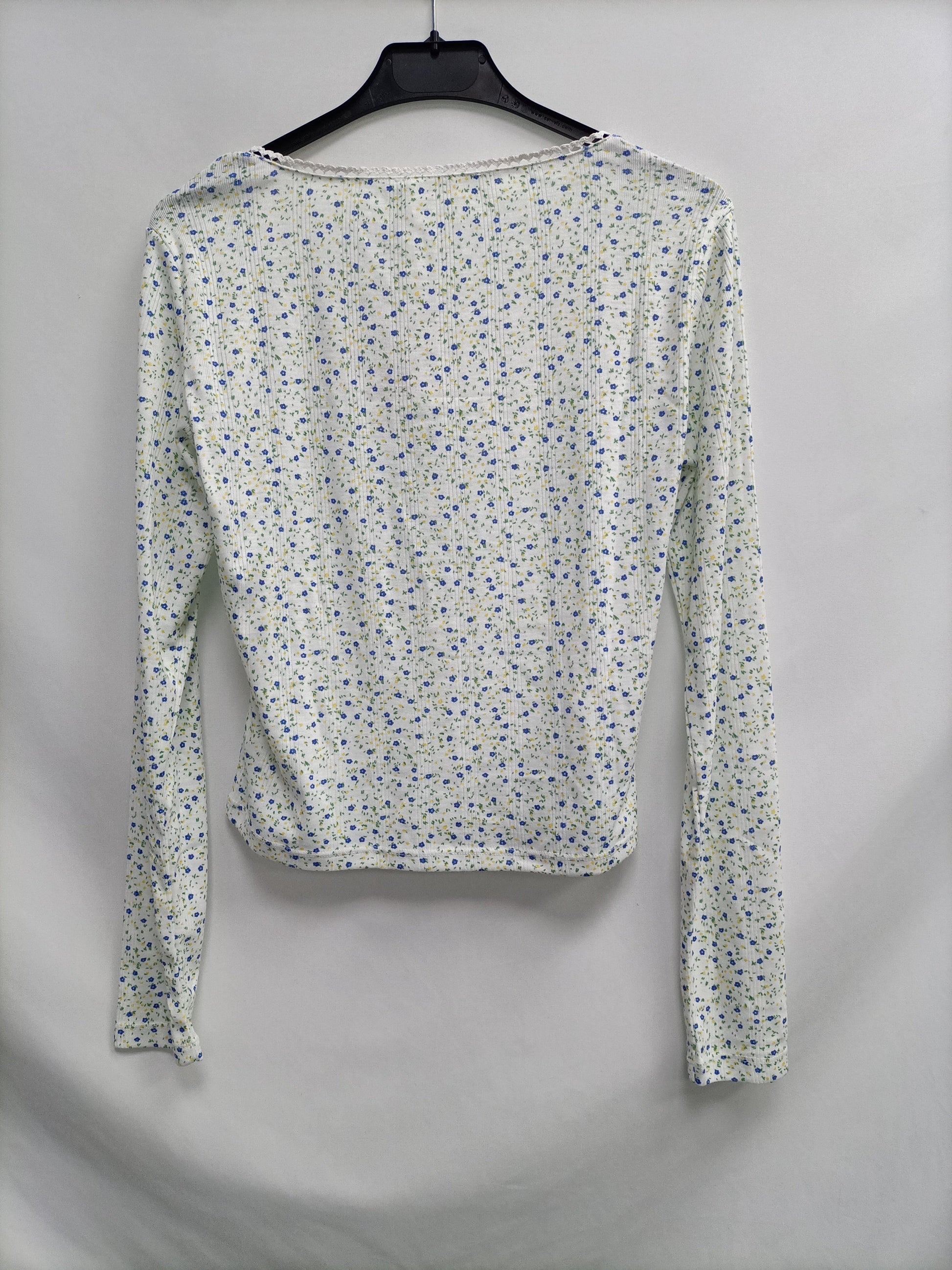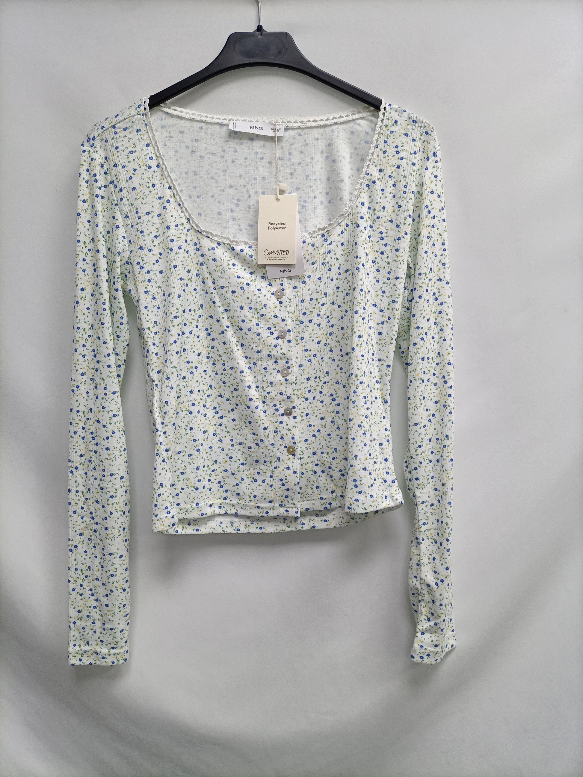 NUEVO CON ETIQUETA. Camiseta blanca canalé flores. largo 48 cm