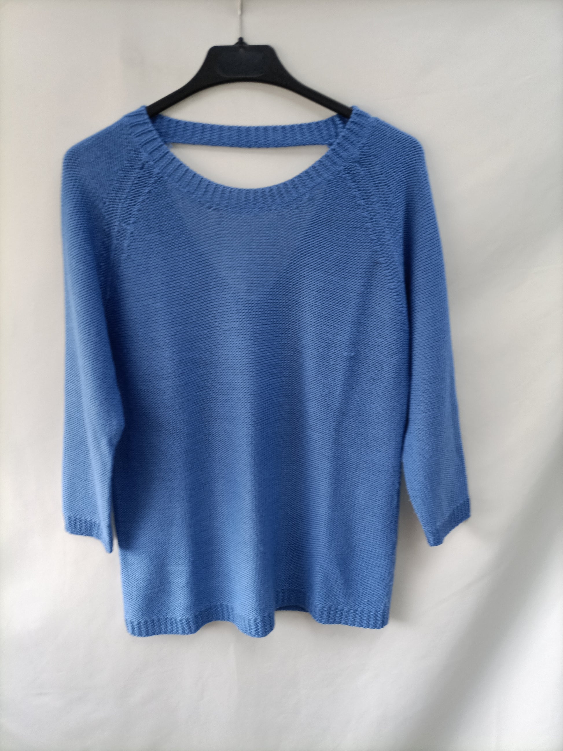 Jersey finito azul con detalle de la espalda un poco baja. elástico. Largo 64 cm