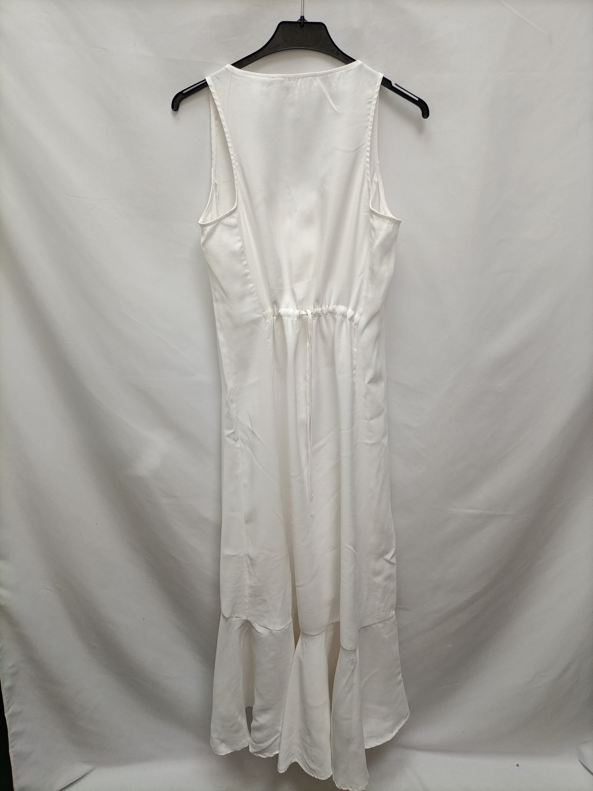 Vestido blanco largo Abotonado con volante en la parte de abajo. No elástico. Ajustable por la espalda. De sisa a sisa 45 cm largo 138 cm.