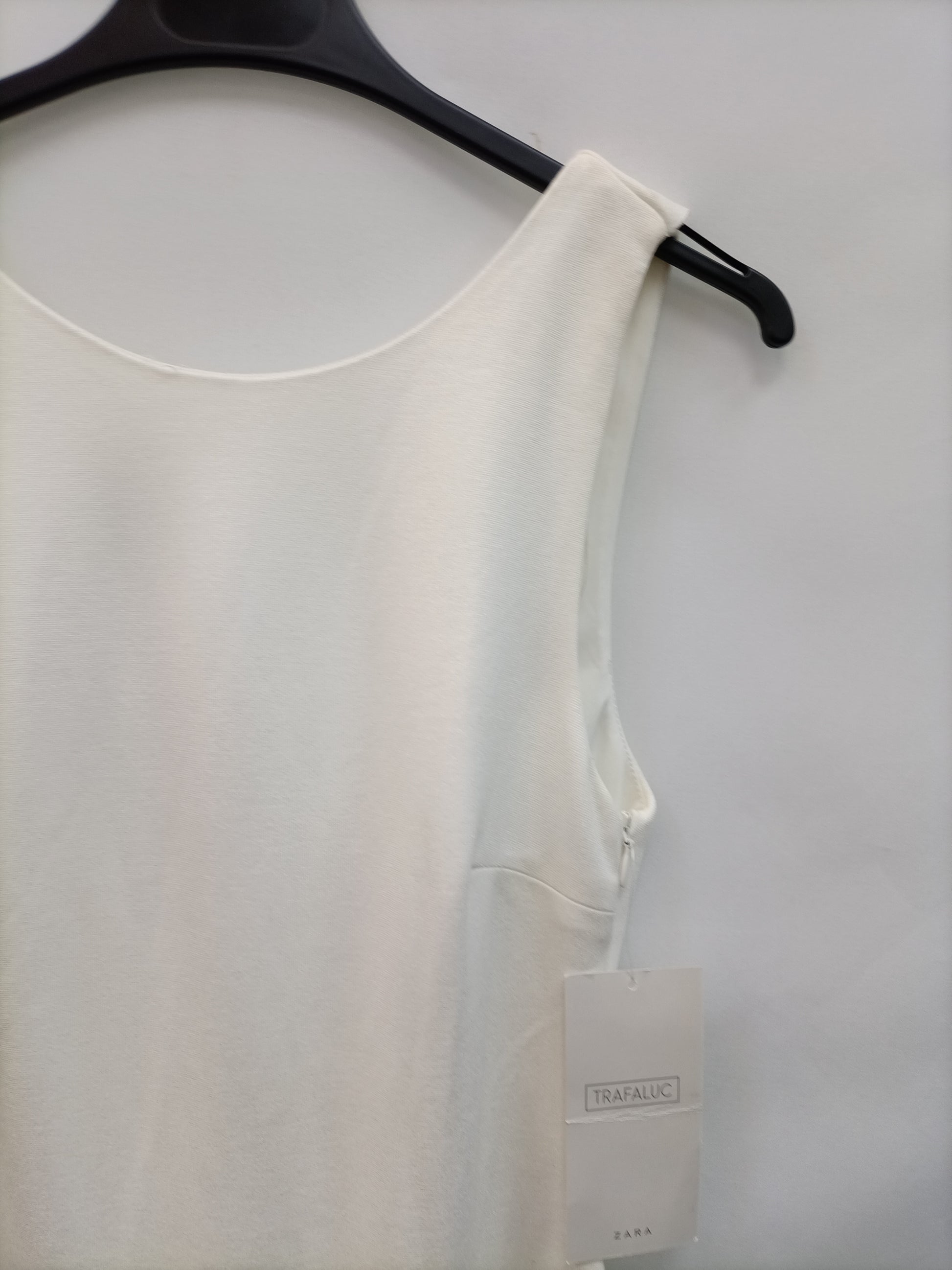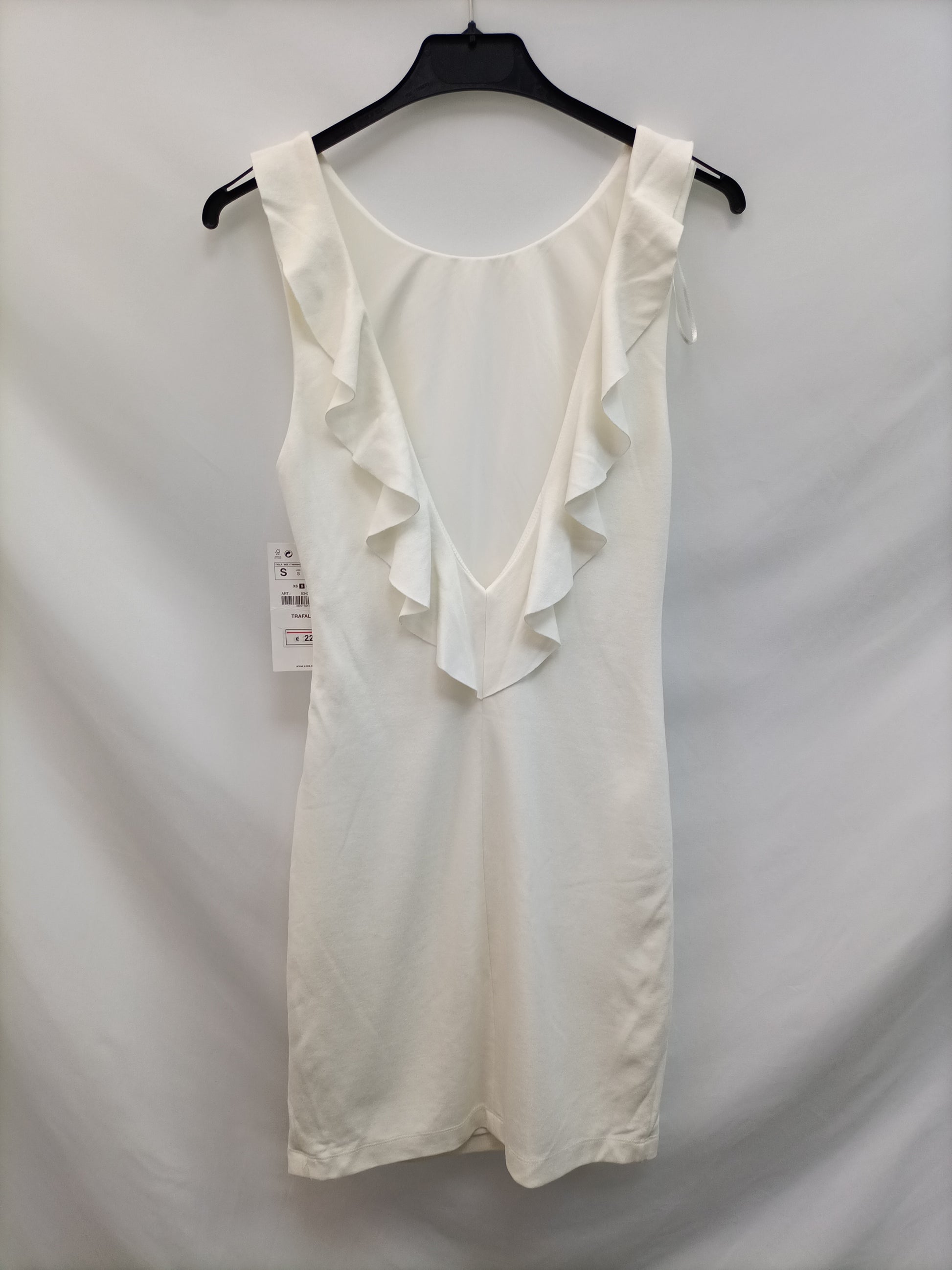 NUEVO CON ETIQUETA. Vestido blanco ajustado con la espalda abierta con volante. elástica. Largo 83 cm