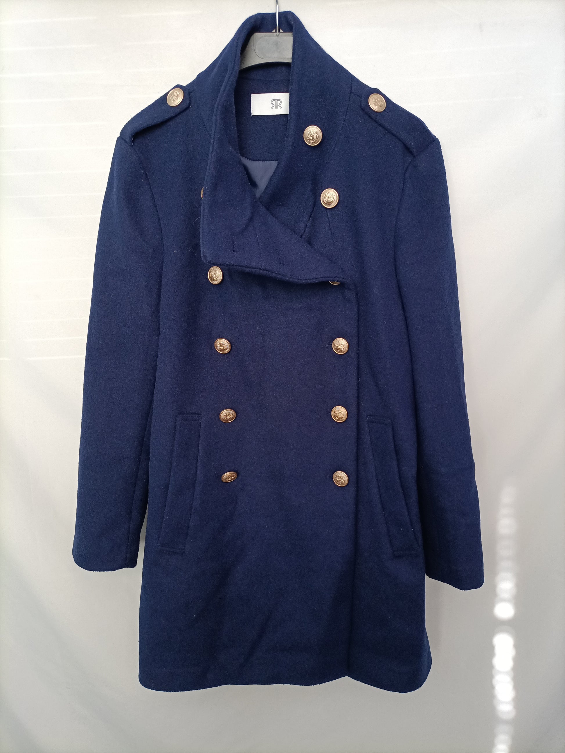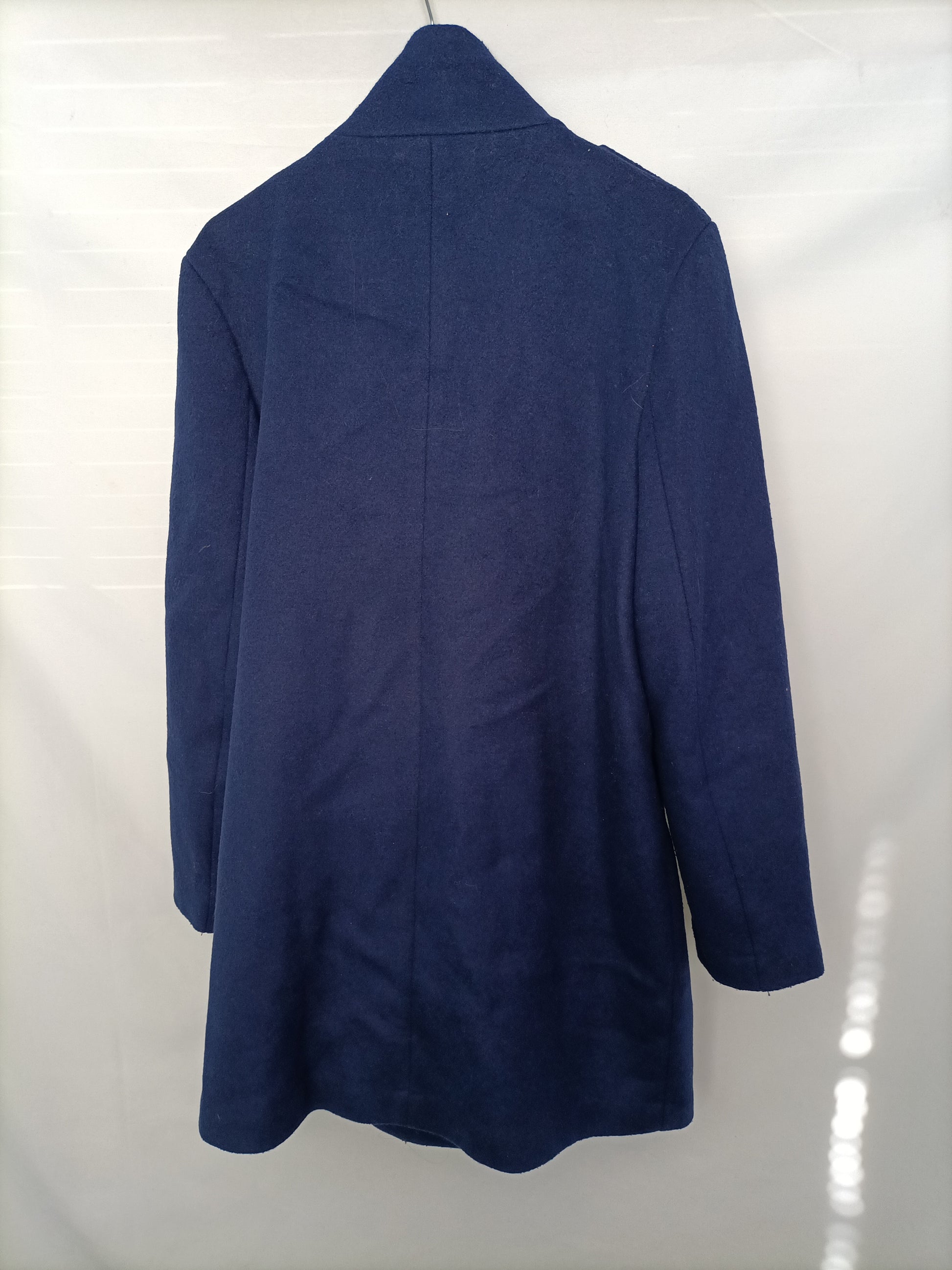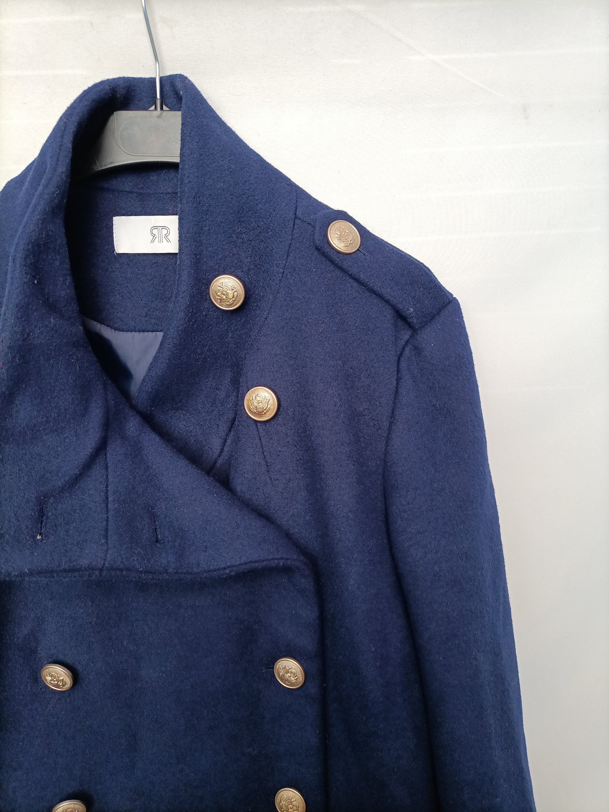 Abrigo de paño de azul cruzado con detalle de de botones dorados. De sisa a sisa 51 m largo 96 cm