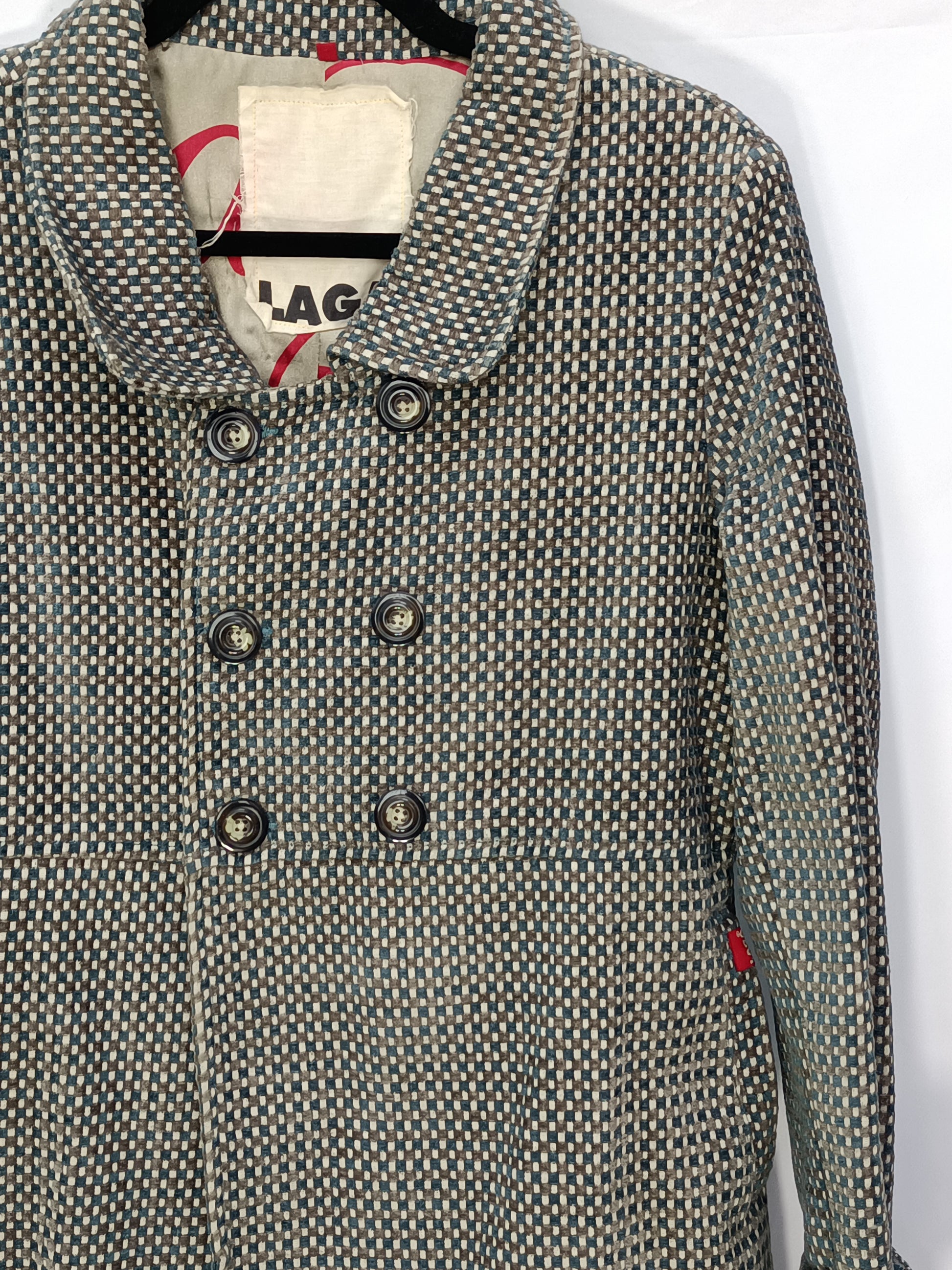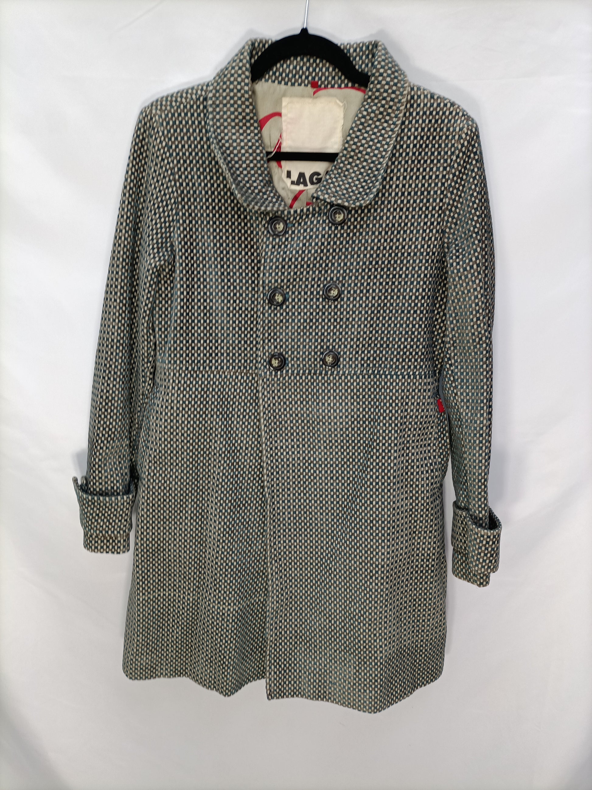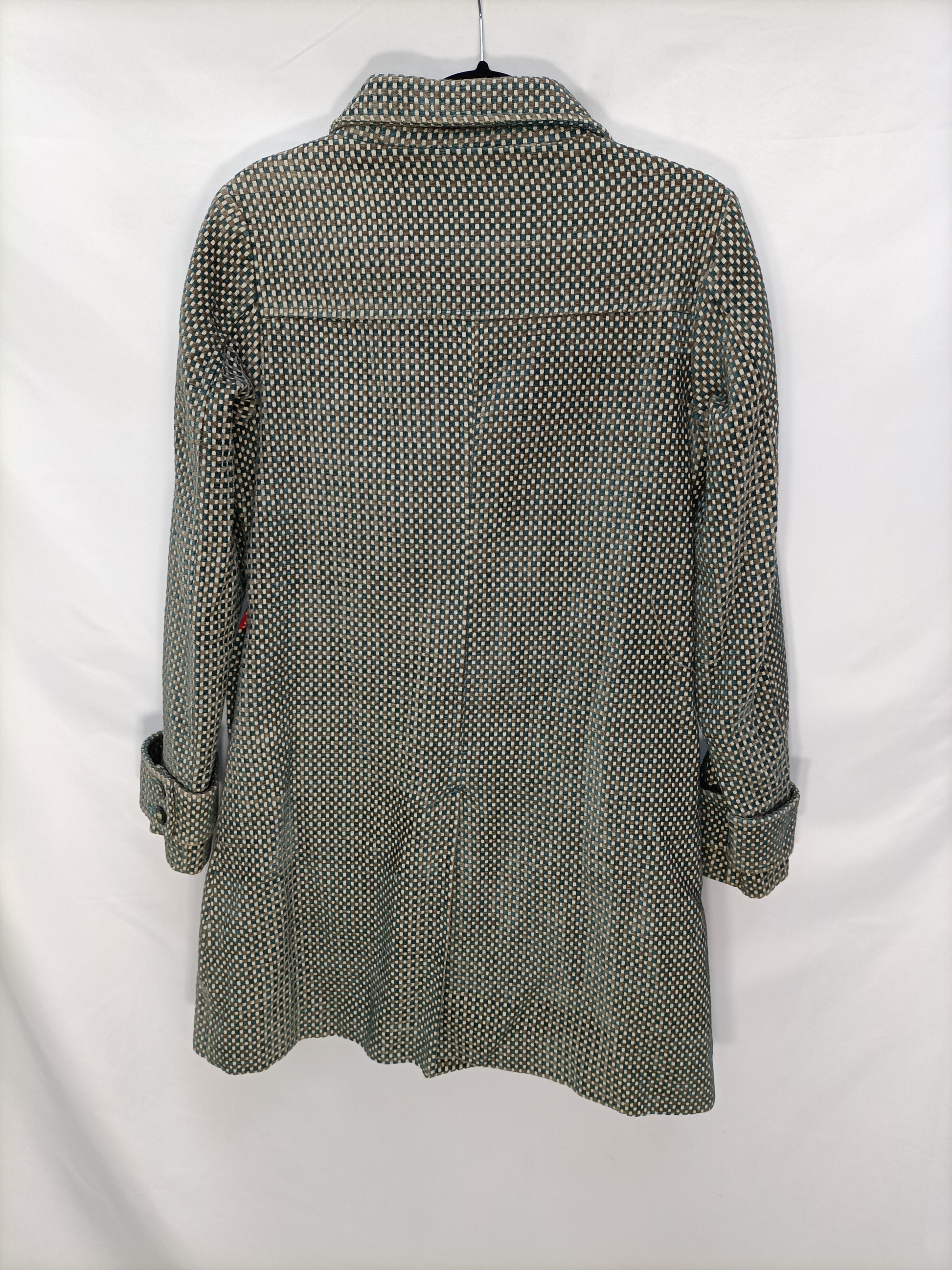 Abrigo de cuadros gris, azul. Y beige de tejido estilo terciopelo. Gordito y cruzado. No elástico. De sisa a sisa 48 cm largo 94 cm