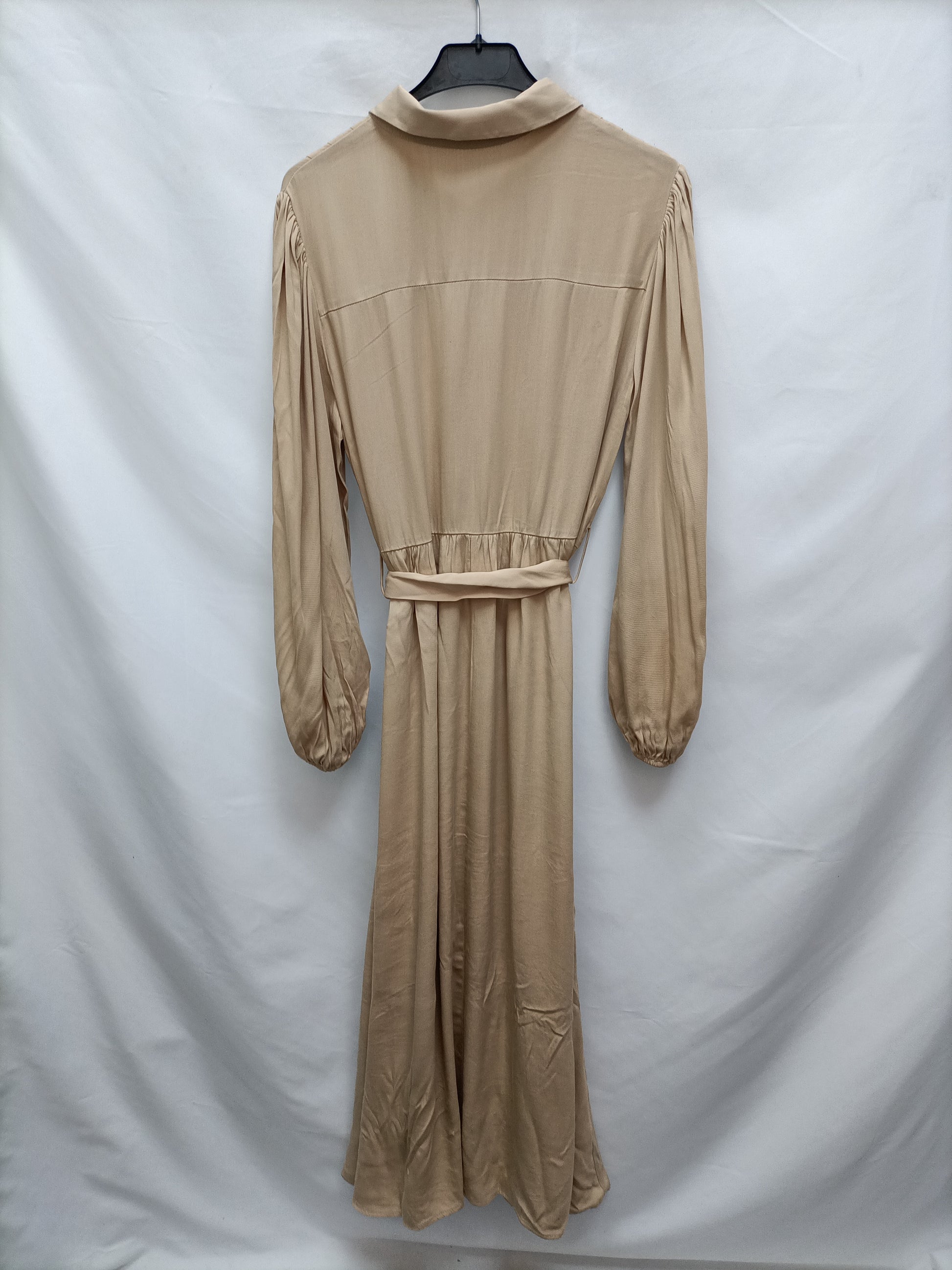 Vestido beige largo con detalle plisado en la parte de arribae. Estilo camisero y Abotonado. No elástico. De sisa a sisa 47 cm largo 127 cm.