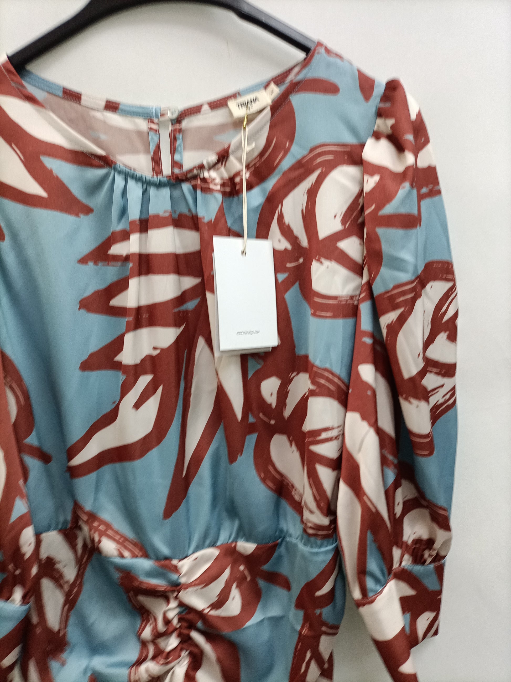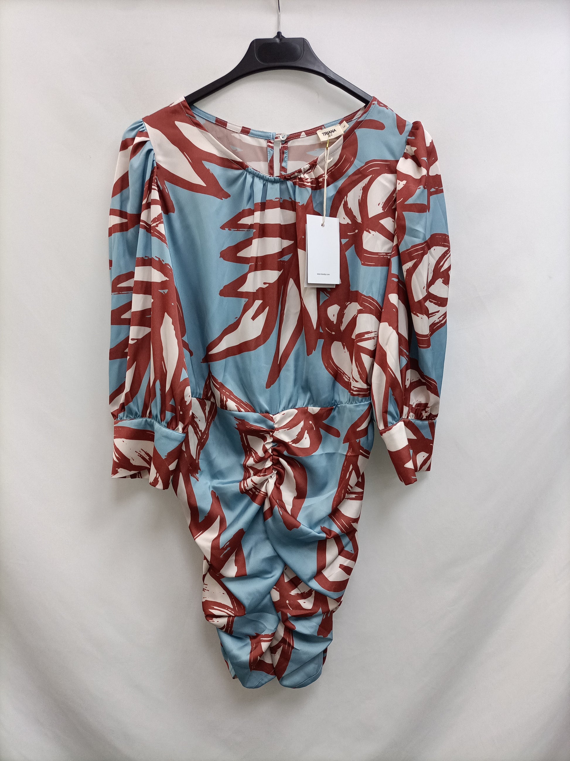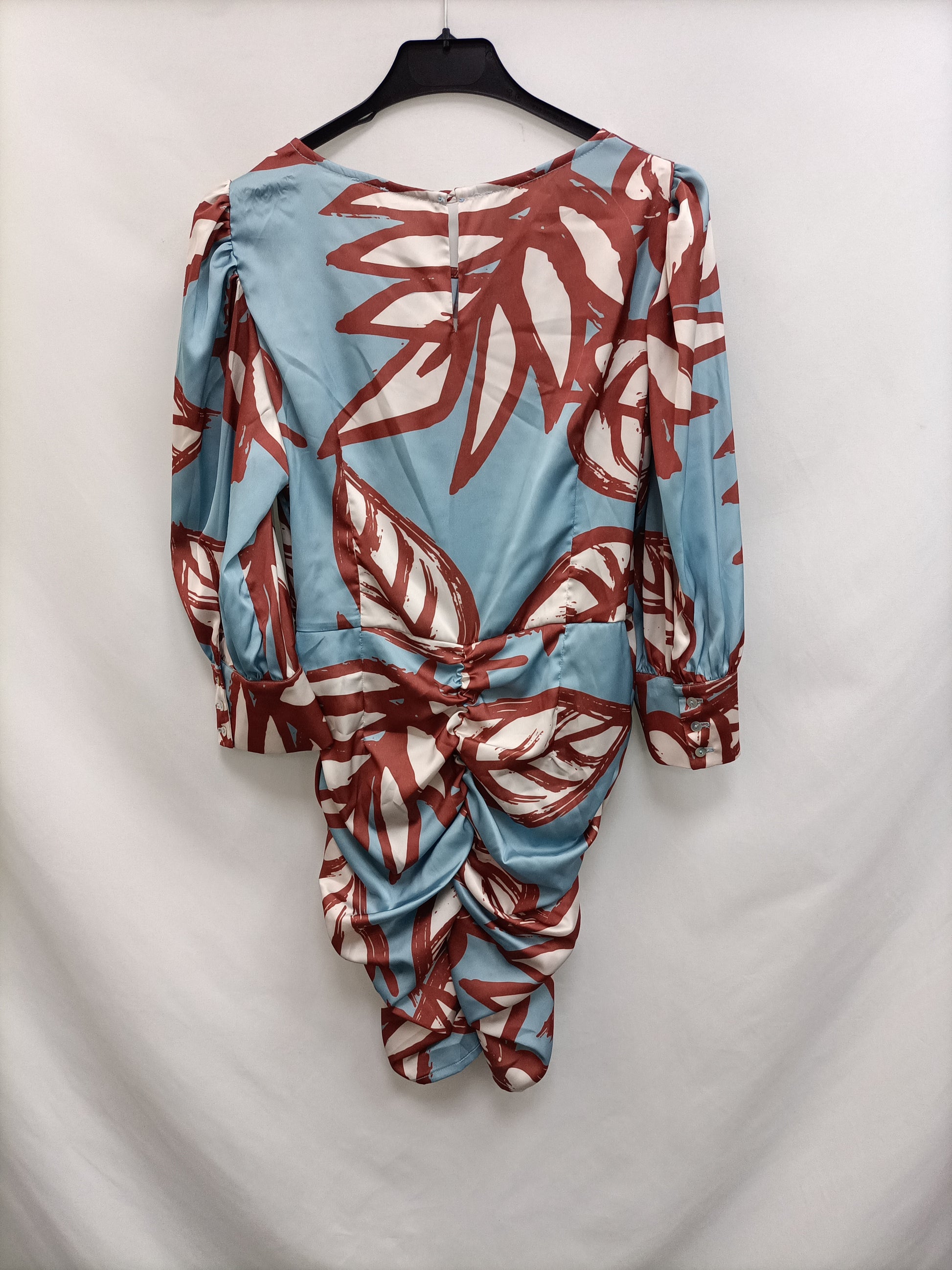 NUEVO CON ETIQUETA. Vestido corto azul con estampado de hojas. Falda Fruncida. No elástico. De sisa a sisa 46 cm largo 78 cm