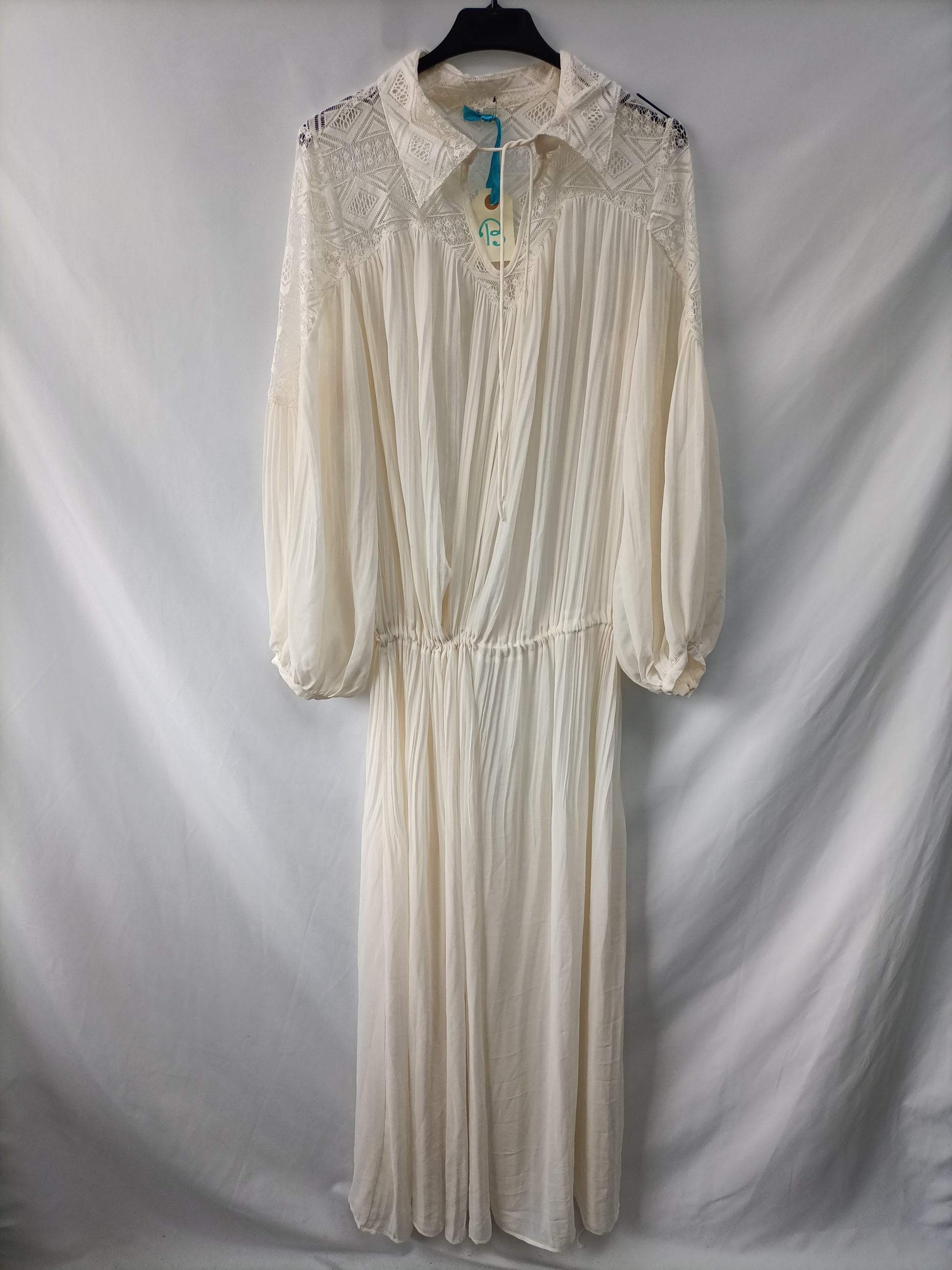 NUEVO CON ETIQUETA. Vestido largo estilo oversized plisado con detalle de hombros de encaje. Ajustable en la cintura. Largo 153 cm