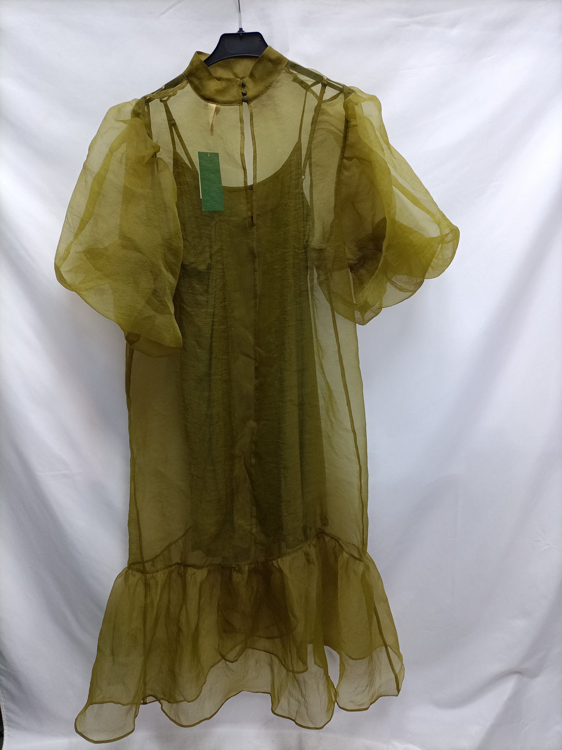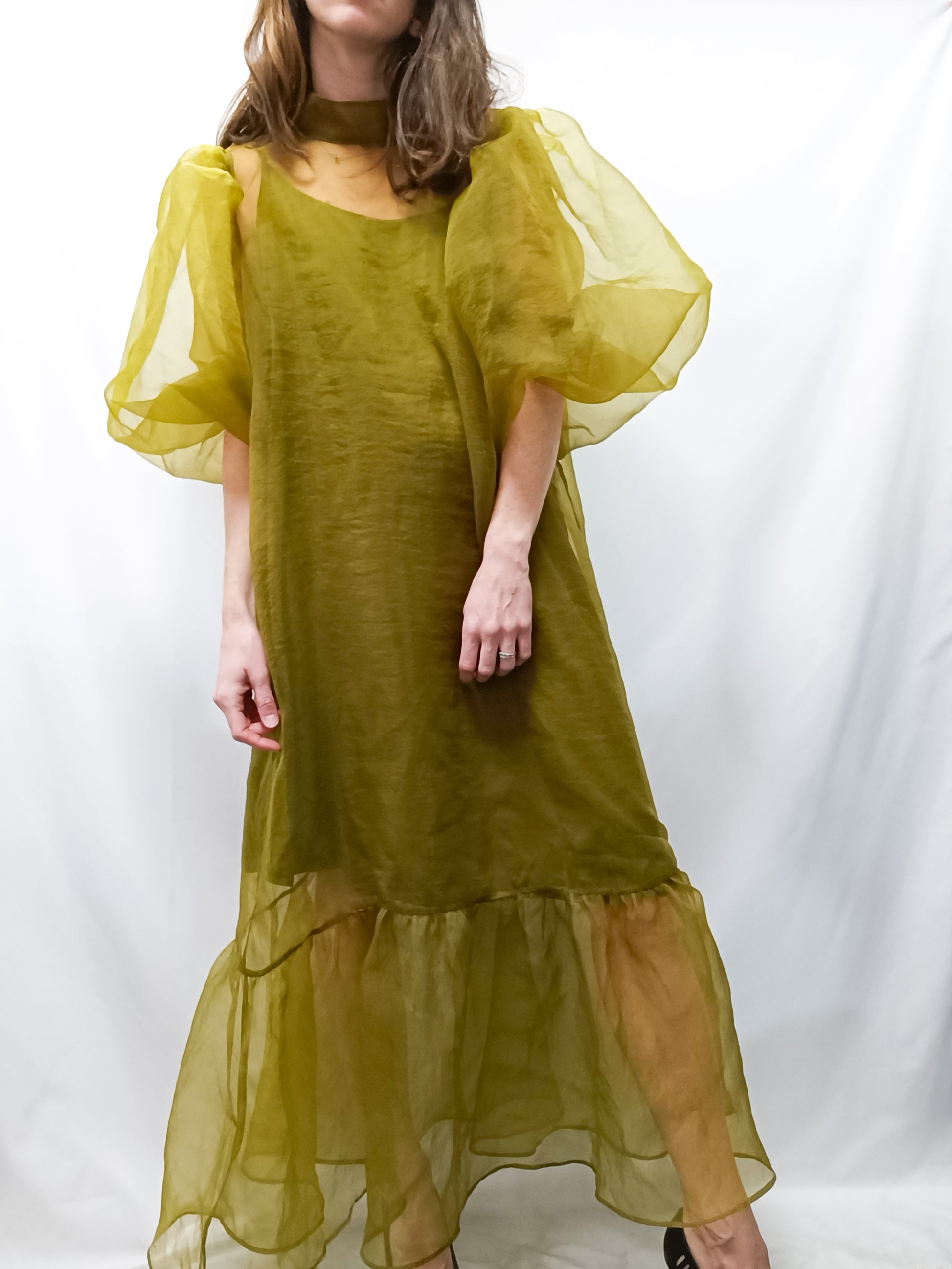 Vestido largo de gasa verde semientransparente con las mangas Abullonadas y volante. Oversized. Forro interior con tirantes ajustables. Medias forro De sisa a sisa 48 cm Largo 96 cm
