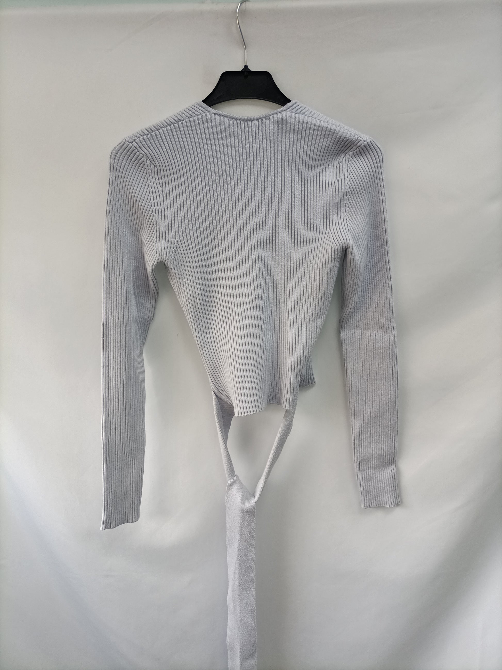 Top de punto de canalé celeste cruzado con lazada. Elastico. largo 43 cm