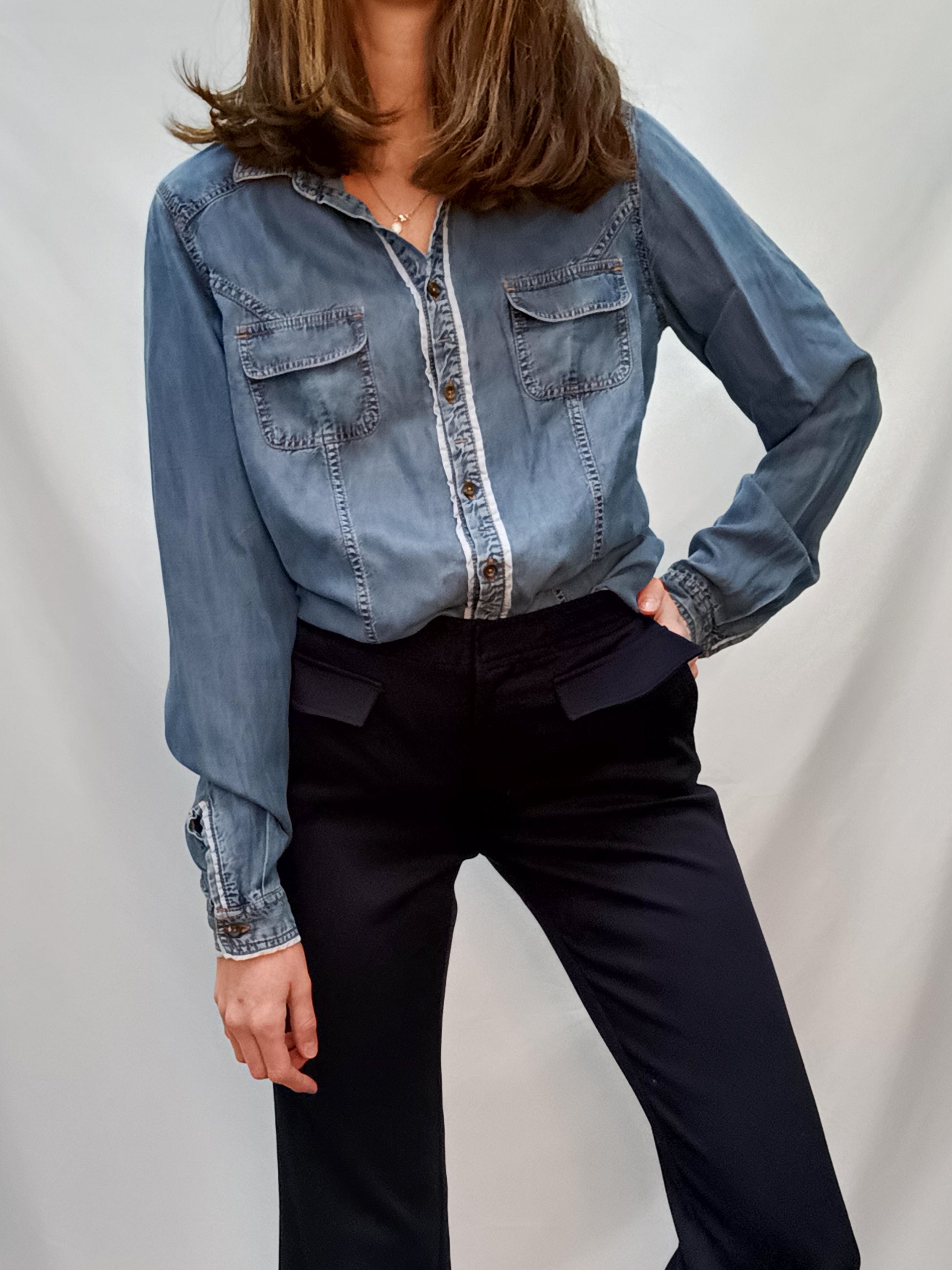 Camisa vaquera fluida. Abotonada. No elástica. De sisa a sisa 49 cm largo 69 cm (talla más pequeña)