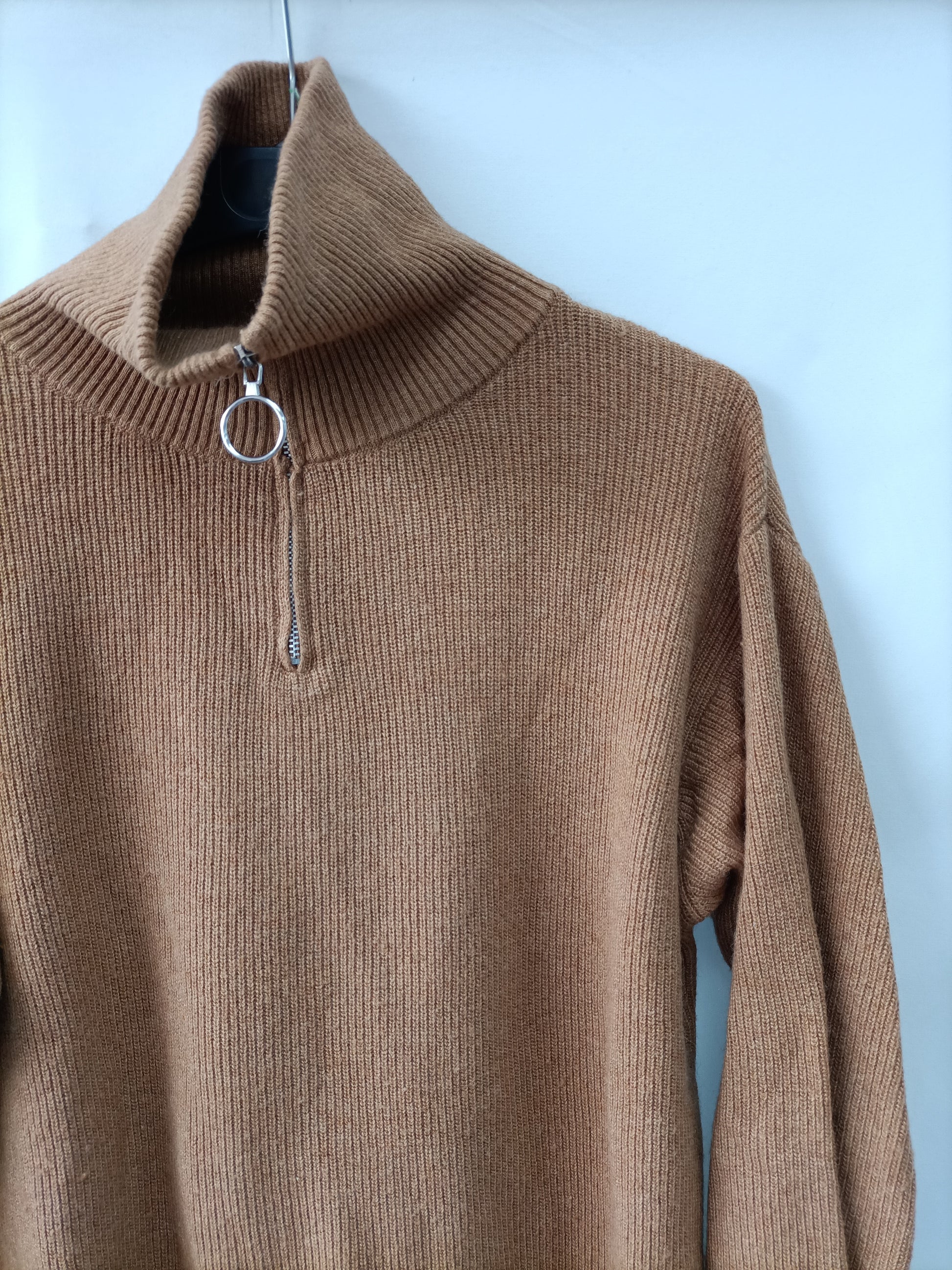 Jersey de punto camel con el cuello perkin con cremallera. largo 58 cm