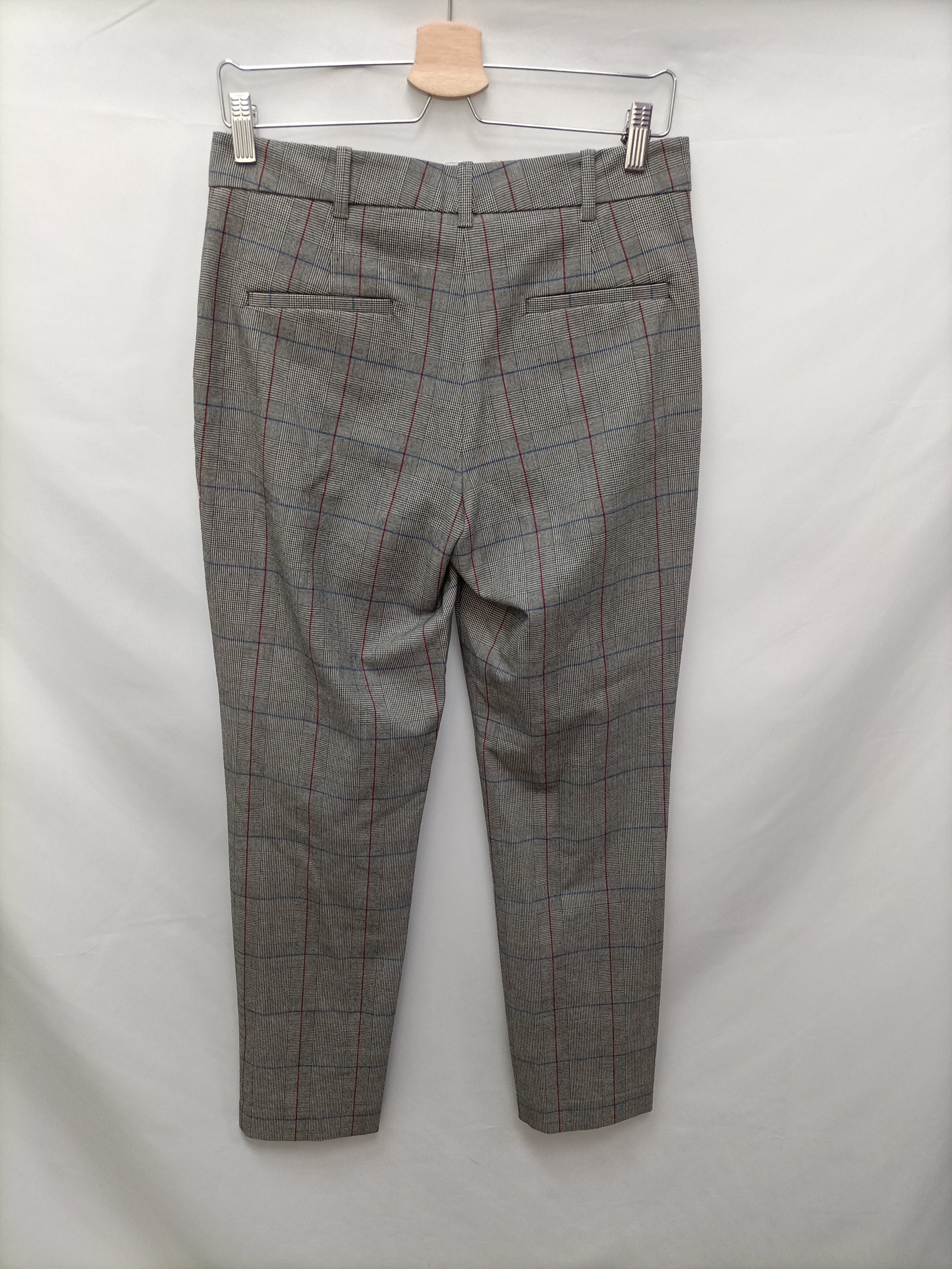 Pantalón de vestir gris con cuadros en tonos azules y burdoes. No elástico. Cintura 36ñ9 cm largo 98 cm