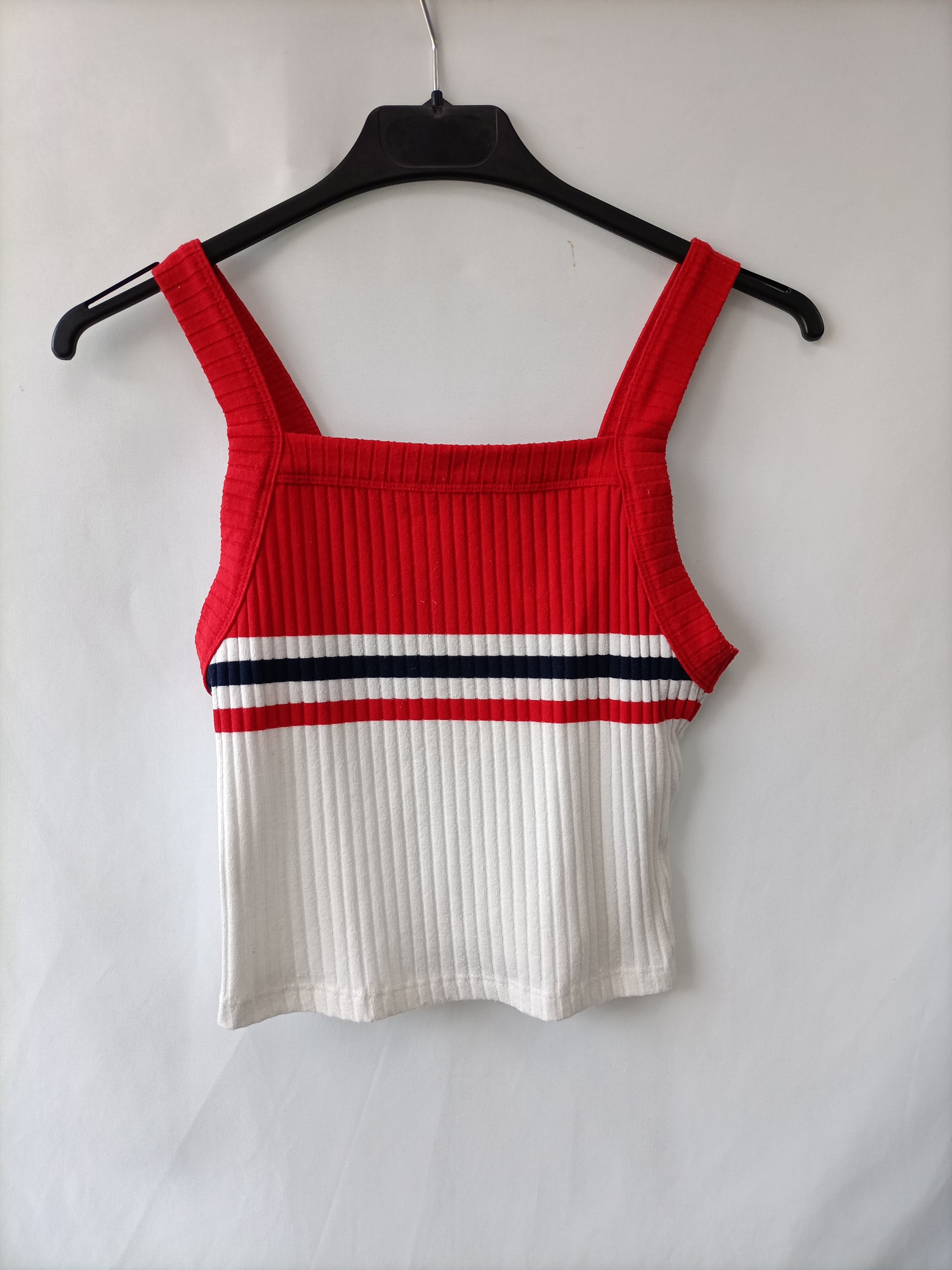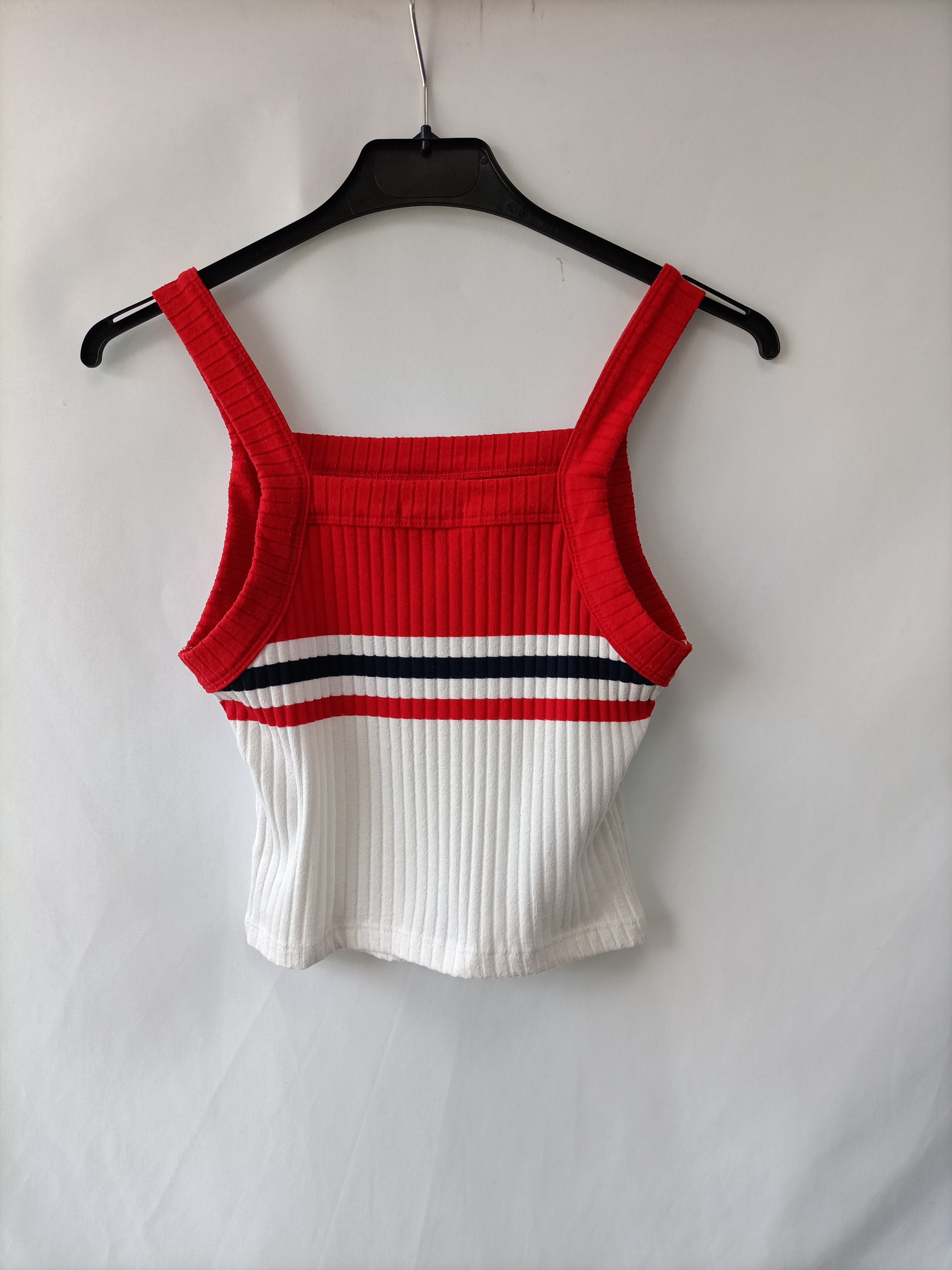 Too rojo y blanco con rayas azul corto y elastico. Largo 40 cm
