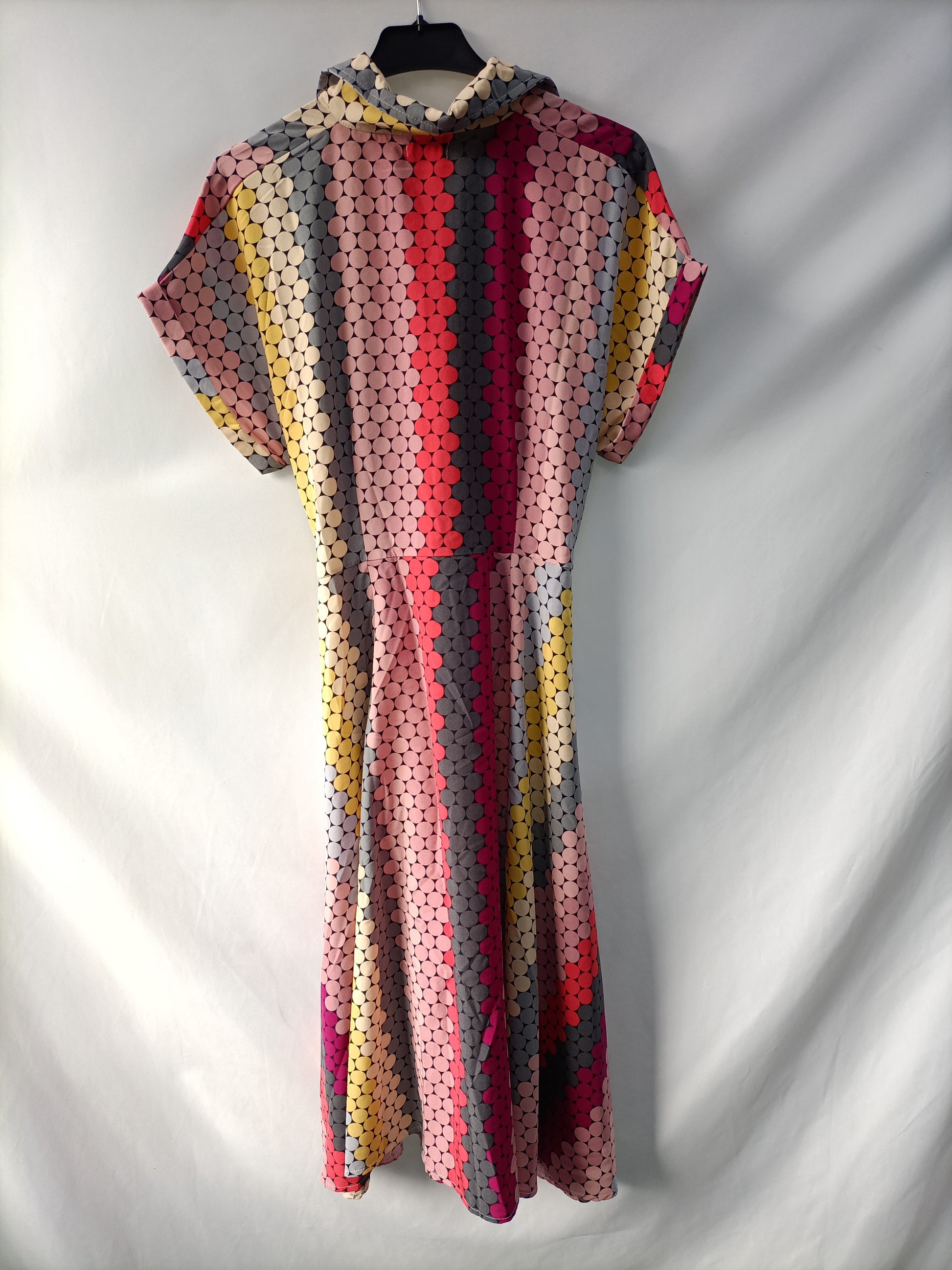 Vestido midi de lunares con la parte delantera cruzada y con botones. De sisa a sisa 45 cm Largo 110 cm
