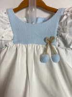 Vestido blanco mangas azules detalle pompón y culetín blanco.