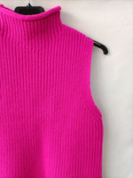Chaleco de punto rosa fucsia con el cuello perkins y mini aperturas laterales. Largo 58 cm