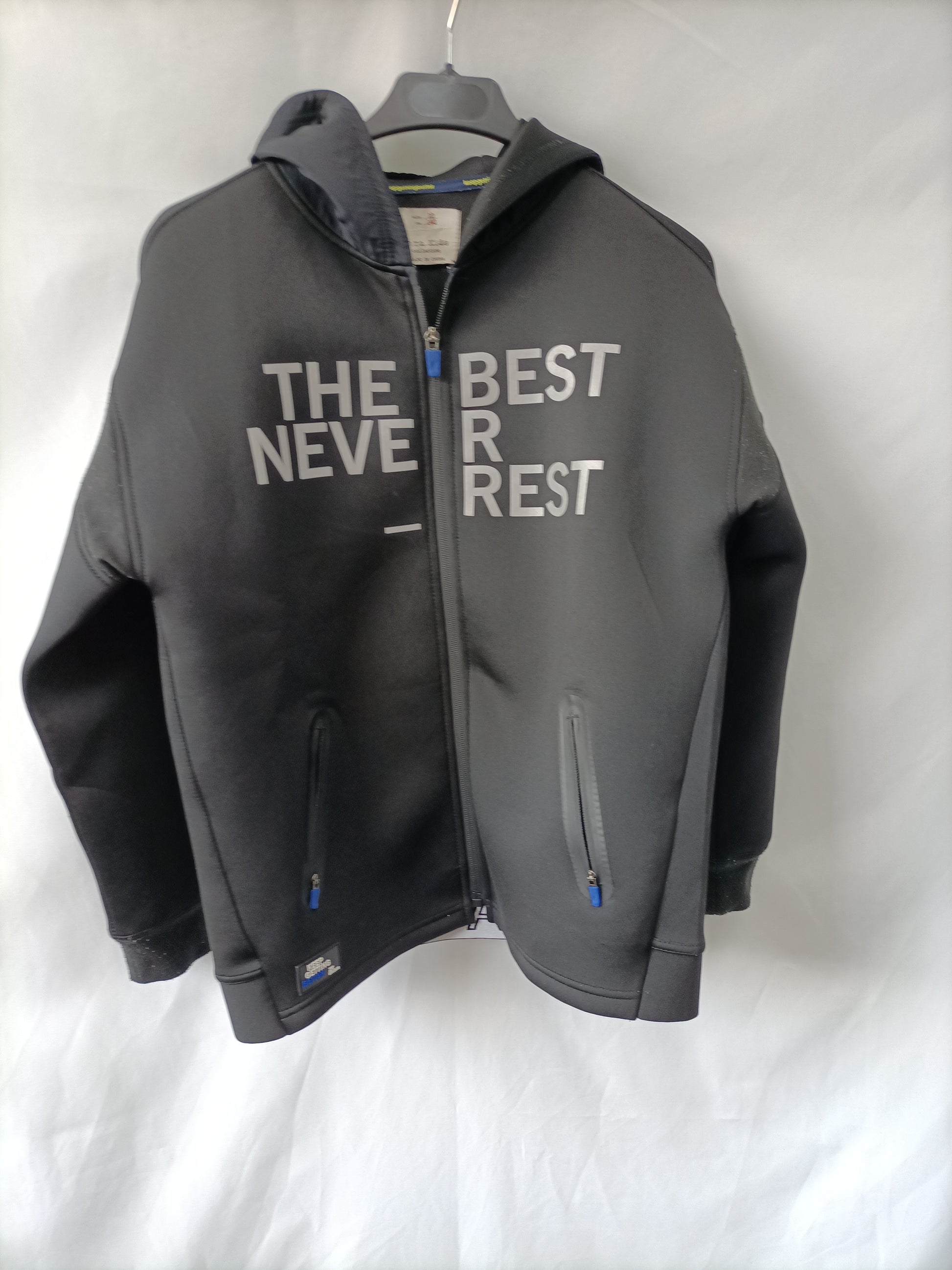 Sudadera negra de neopreno con detalles en blanco y capucha impermeable. largo 60 cm