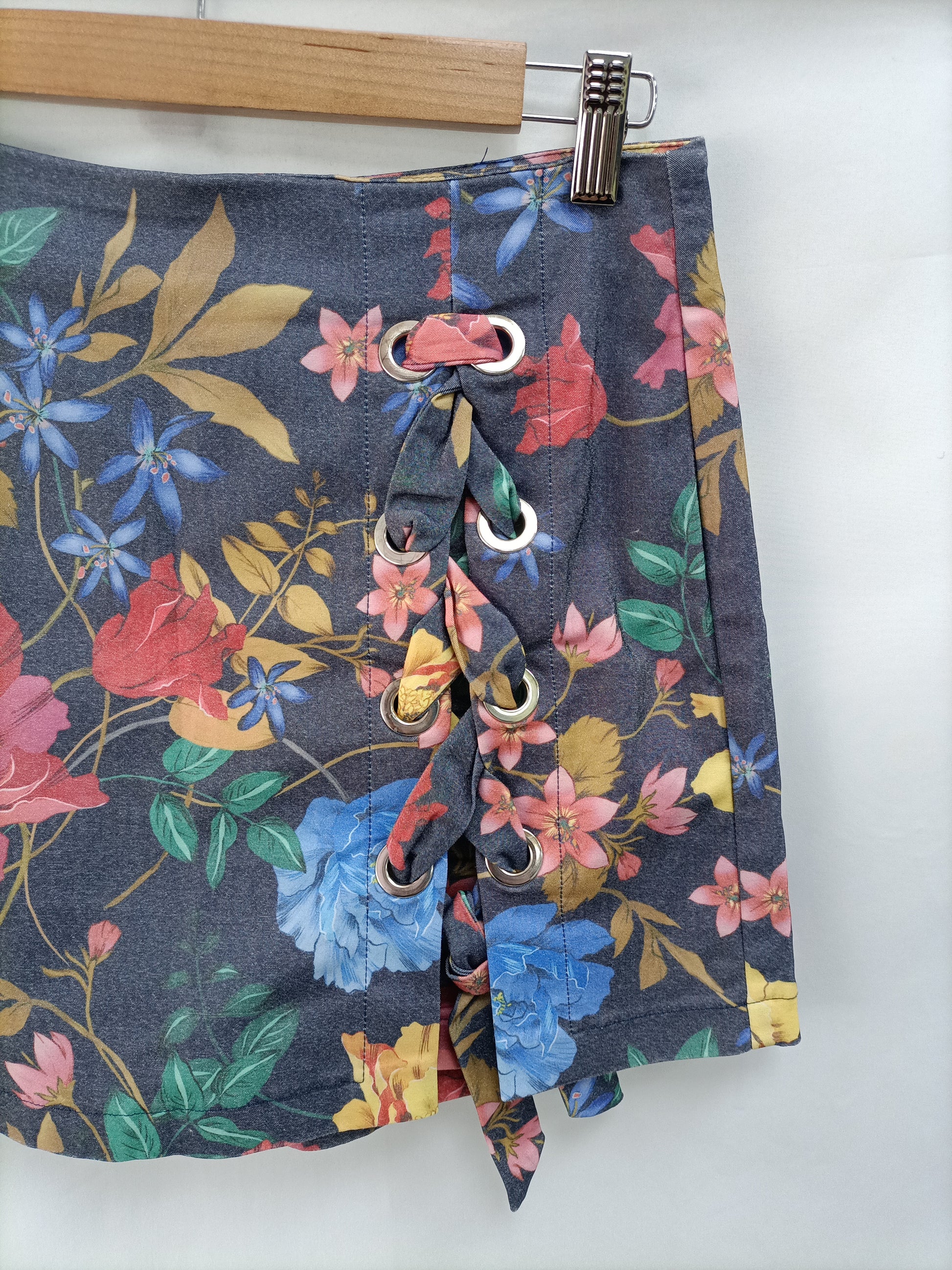 Falda pantalón gris efecto desgastado con flores. Cruzada con detalle de trenza lateral. No elástica. Cintura 38 cm largo 39 cm