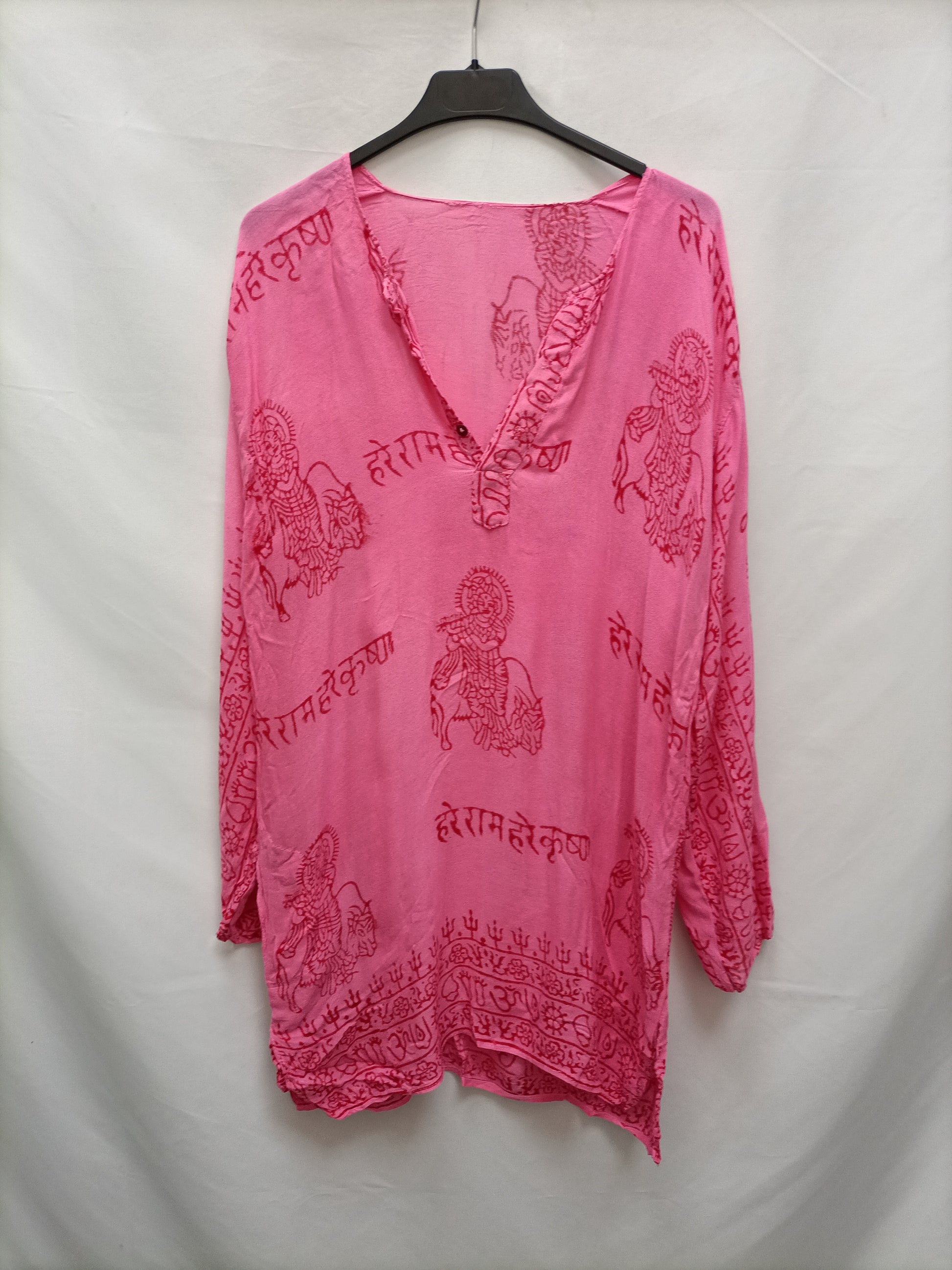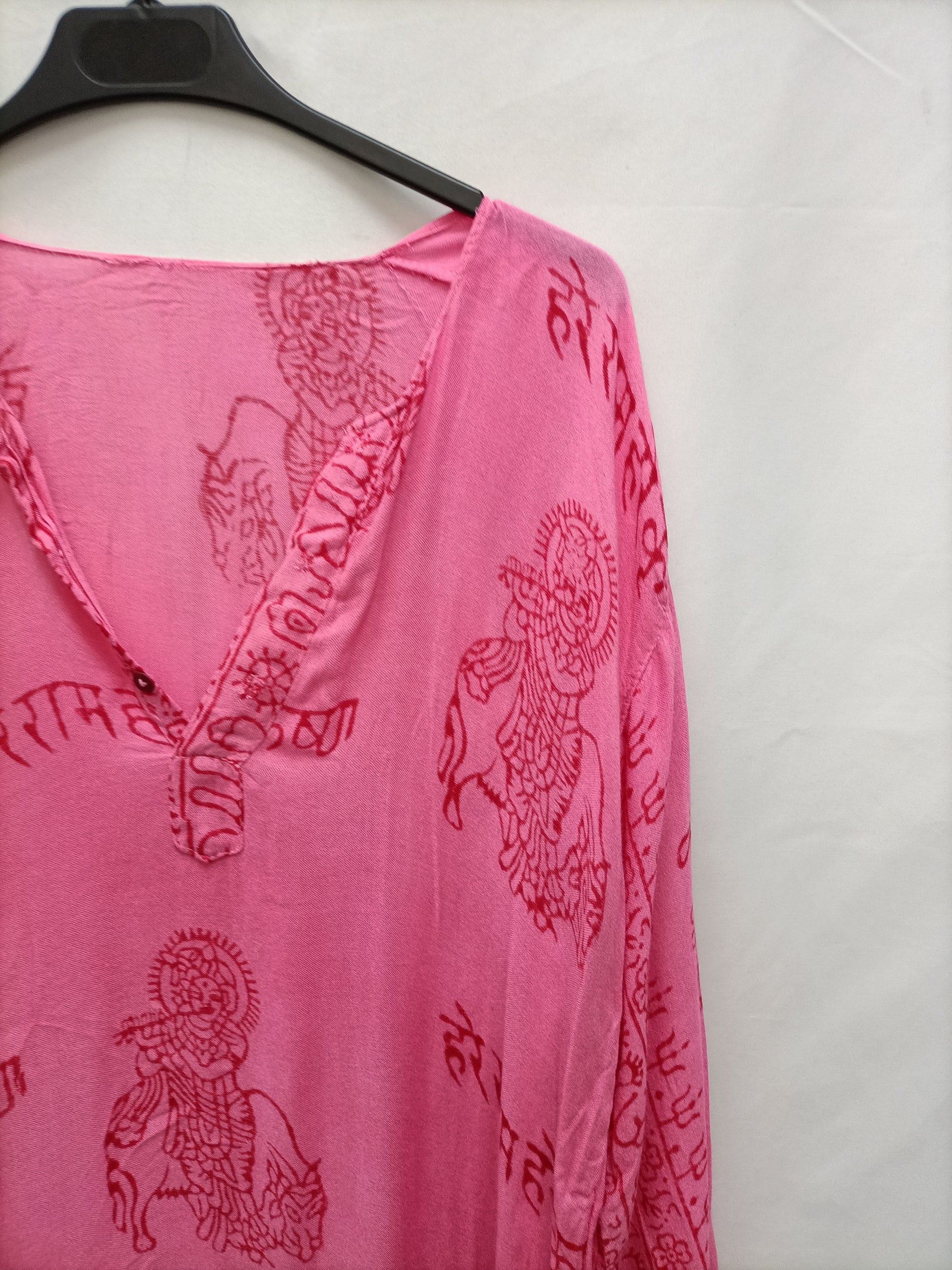 Vestido corto rosa fluido estilo ibicenco estampado. No elástico. De sisa a sisa 57 largo 81 cm.