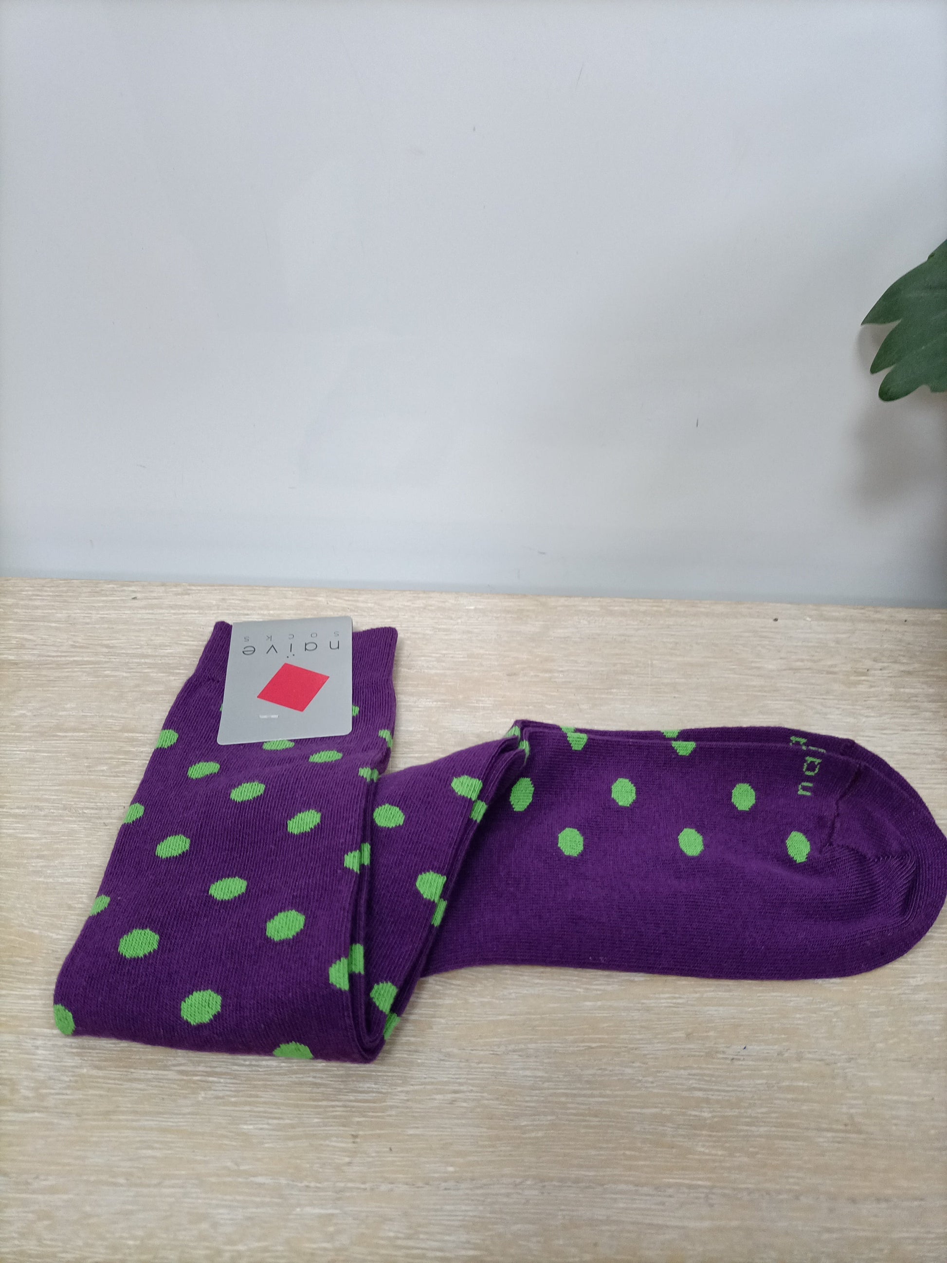 Calcetín alto (hasta la rodilla) morado con luanares Verdes. Talla 35-40