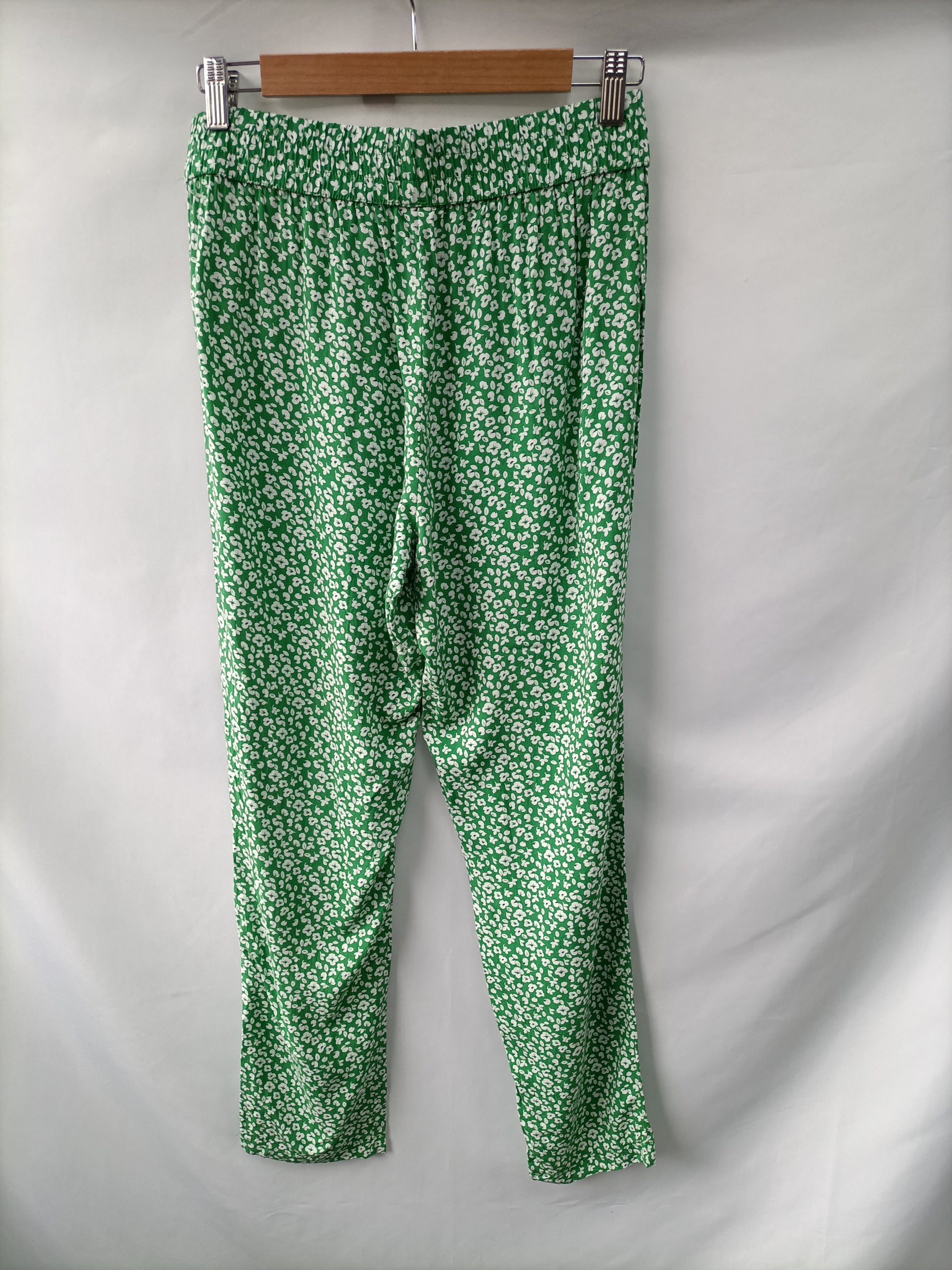 Pantalón fluido verde con florecitas blancas. Cintura elástica. largo 100 cm