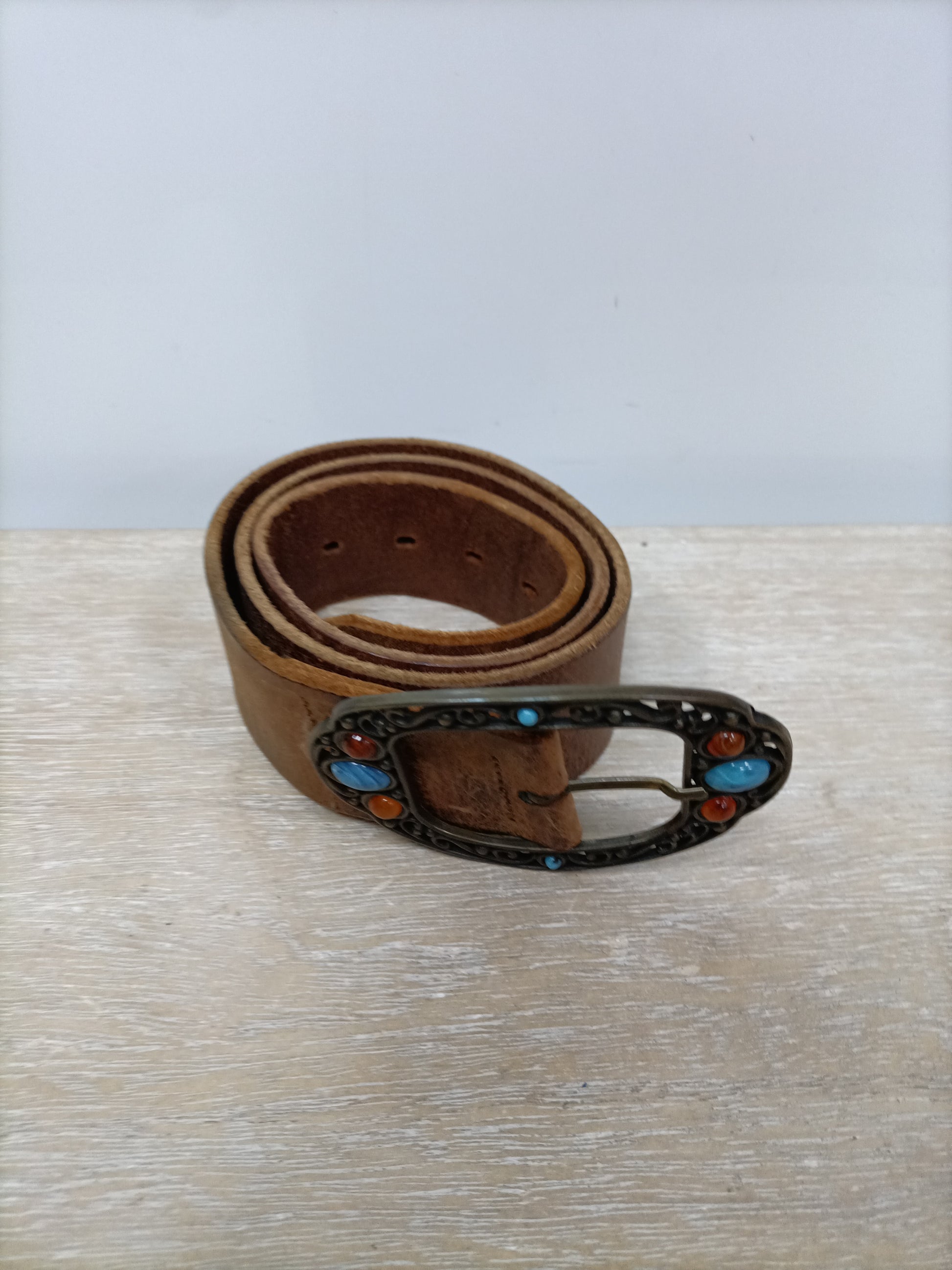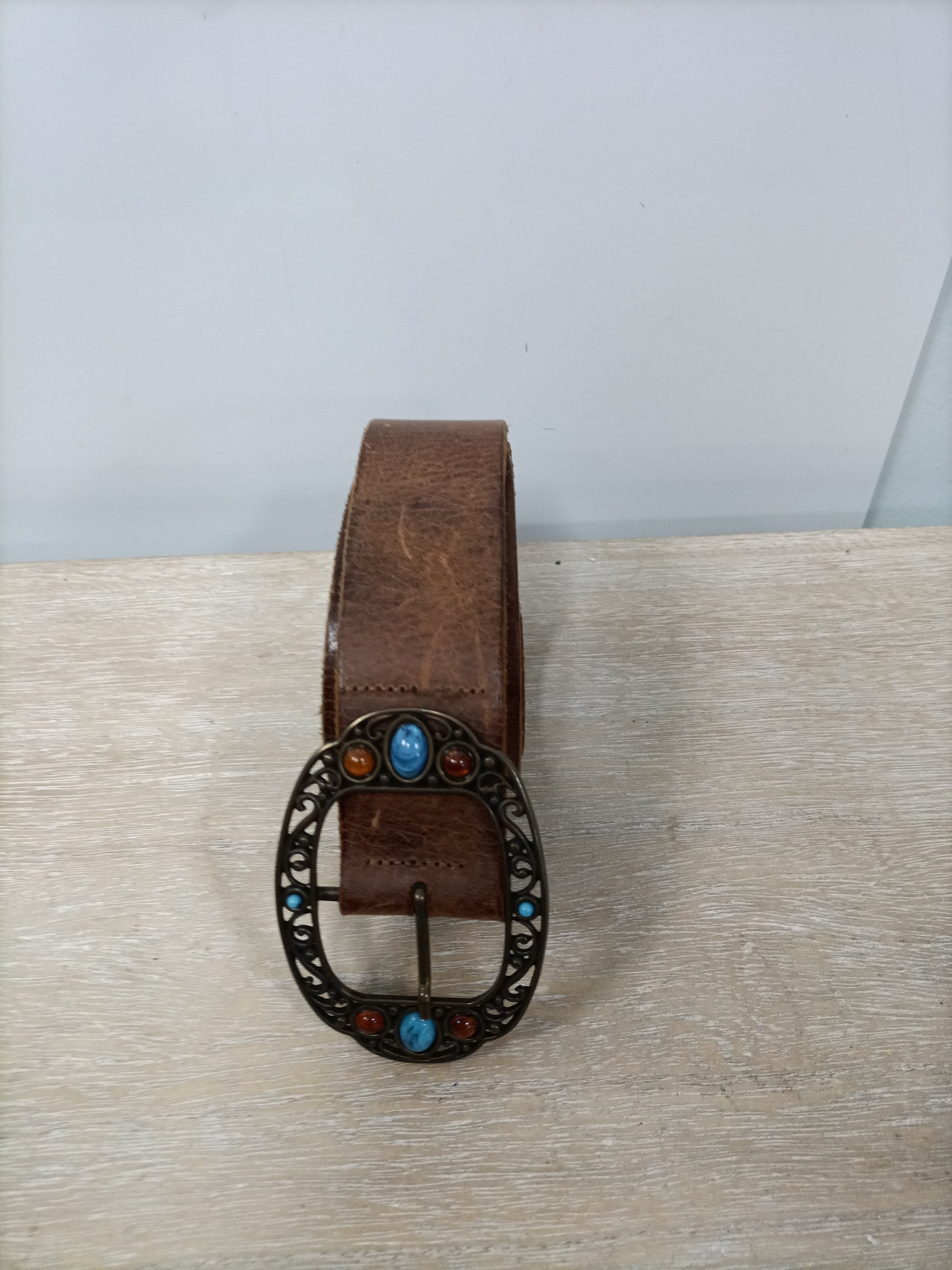 Cinturón de piel marrón con hebilla de abalorios. Largo 103 cm