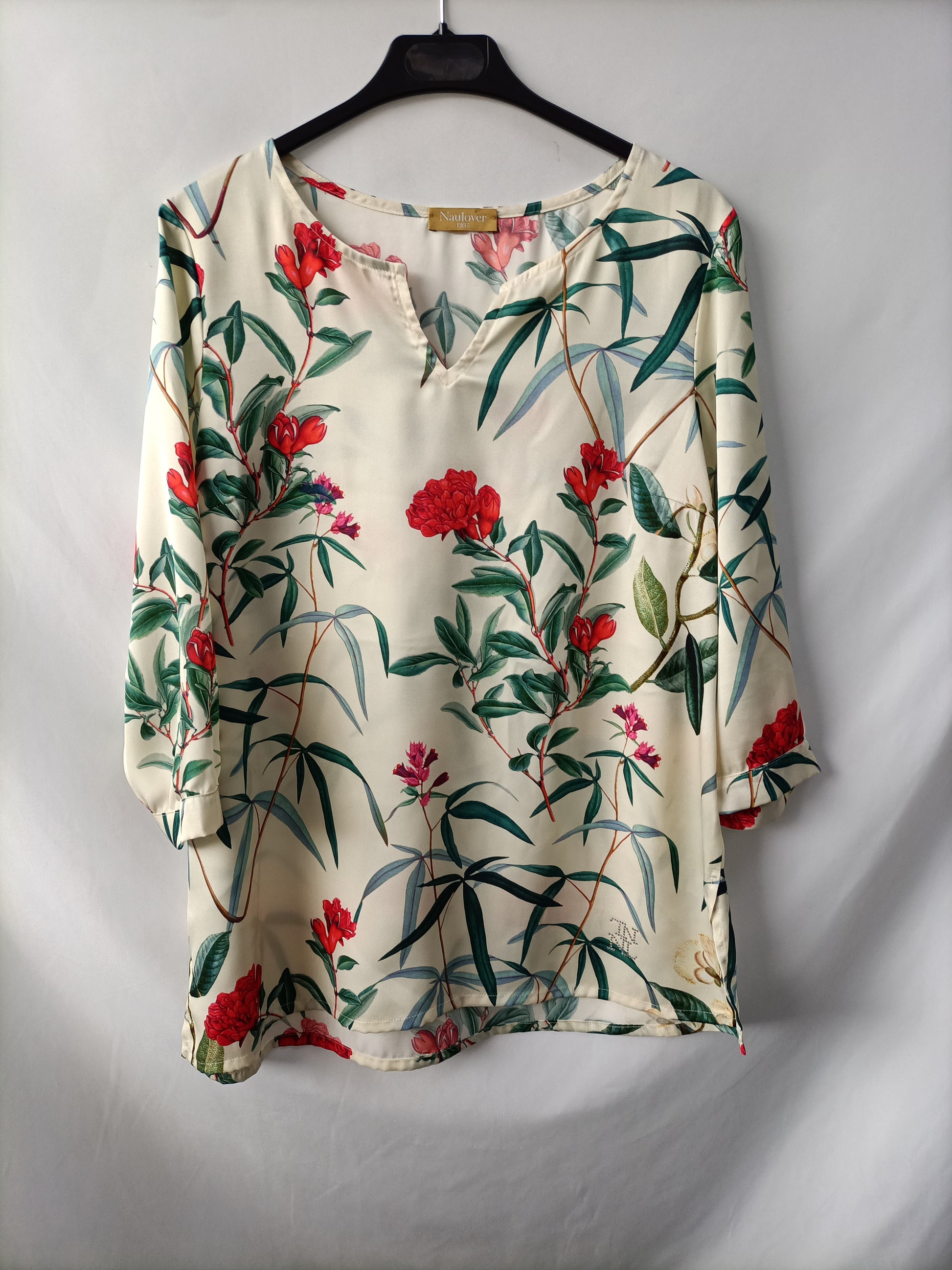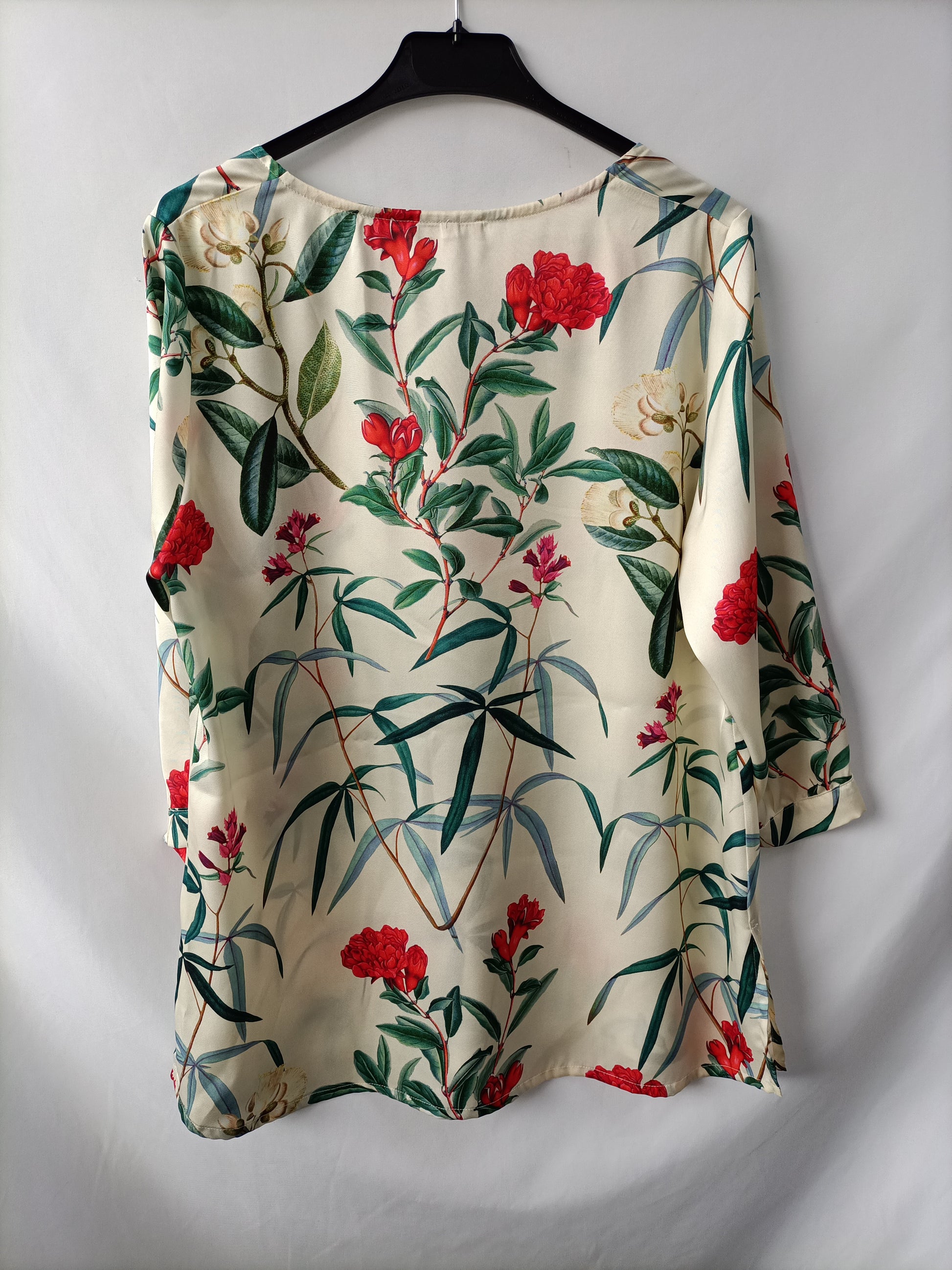 Blusa beige con estampado de flores. De sisa a sisa 51 cm Largo 66 cm.