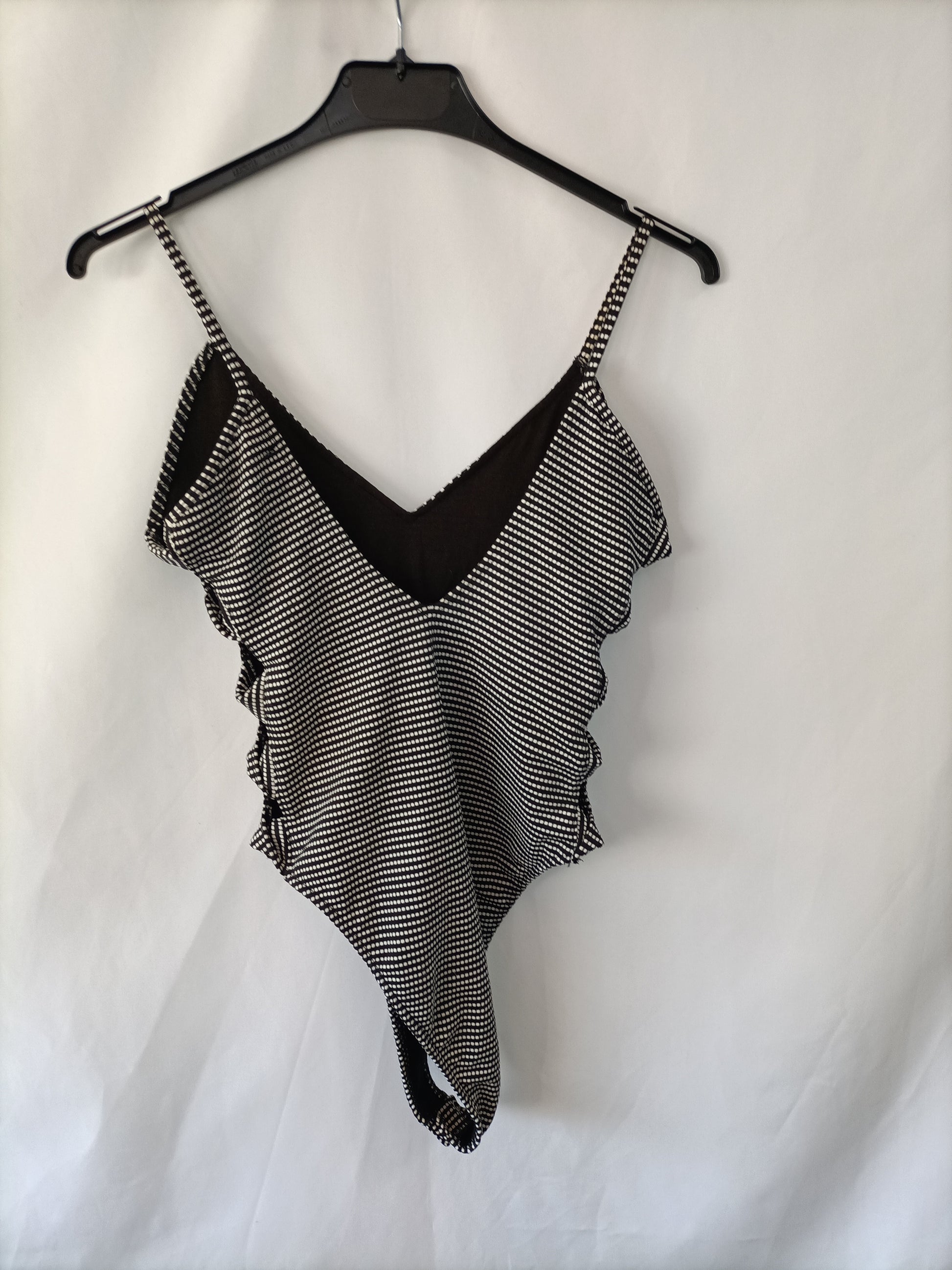 body blanco y negro con textura y aperturas laterales con nudo. elástico. Largo 66 cm