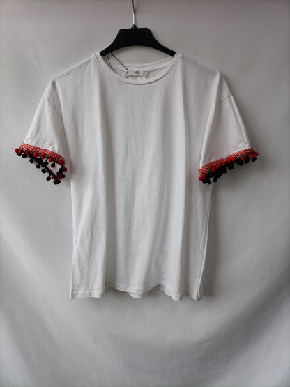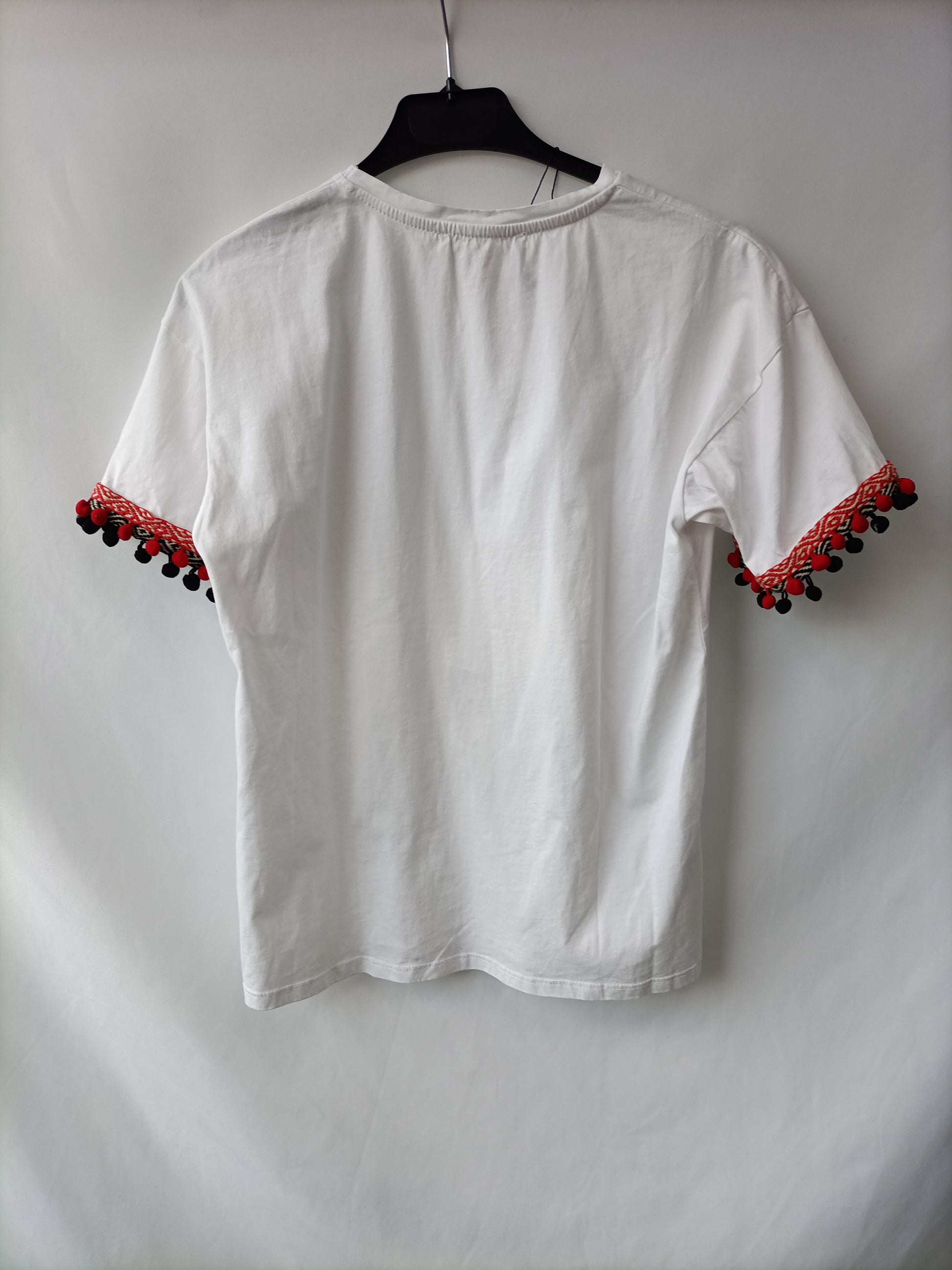 camiseta blanca báisca detalle borlas. Largo 57 cm. 100%algodon