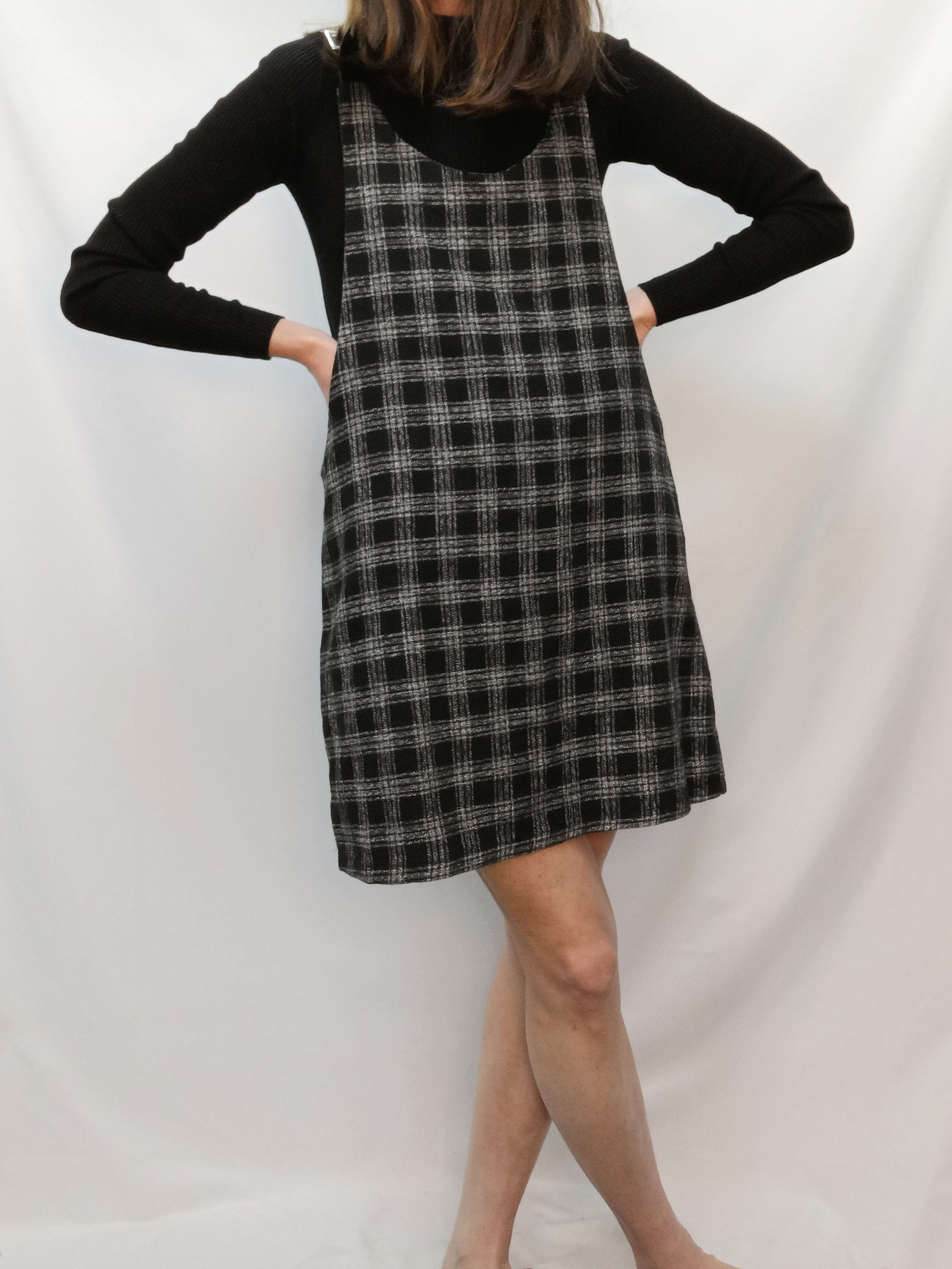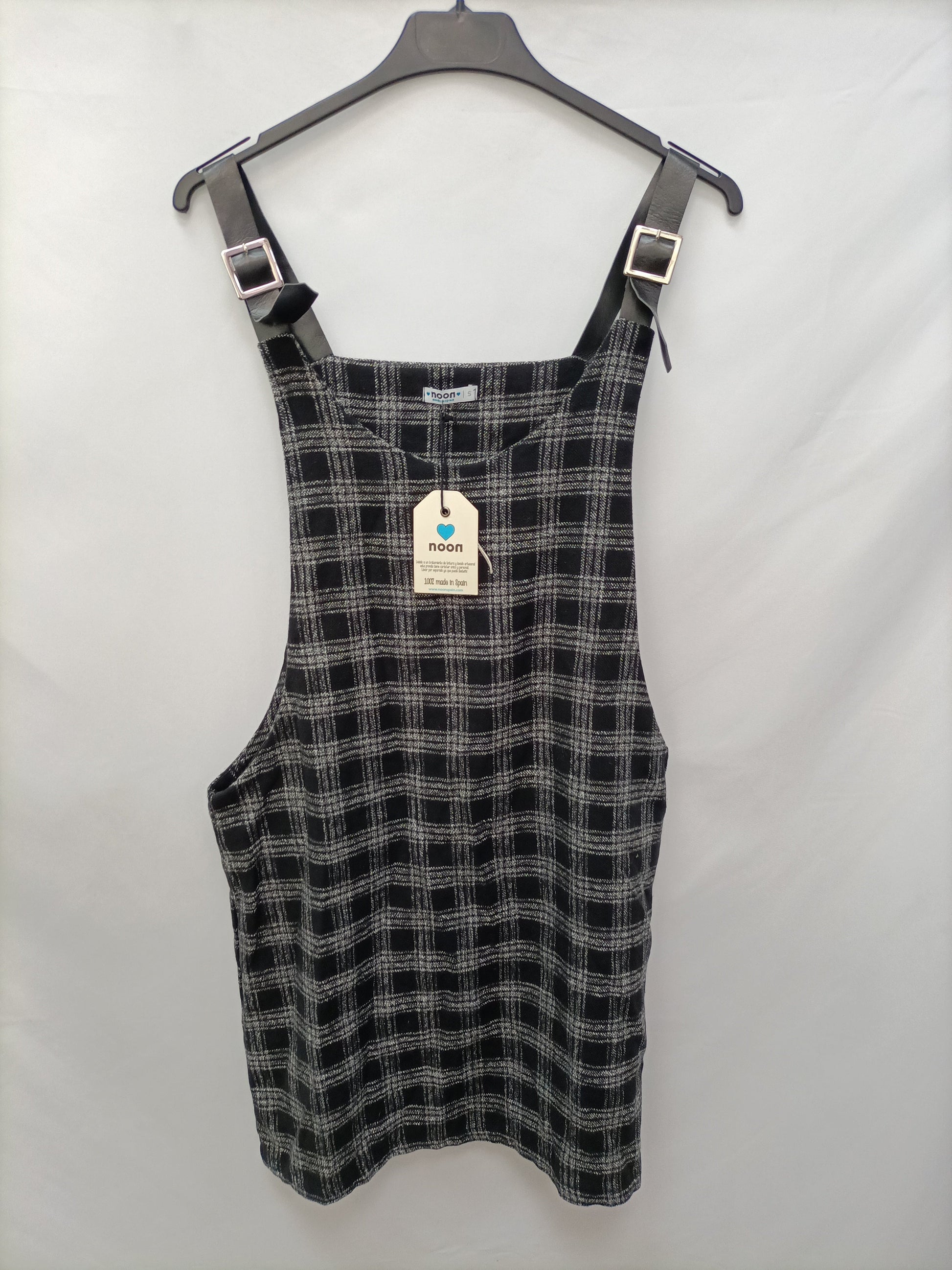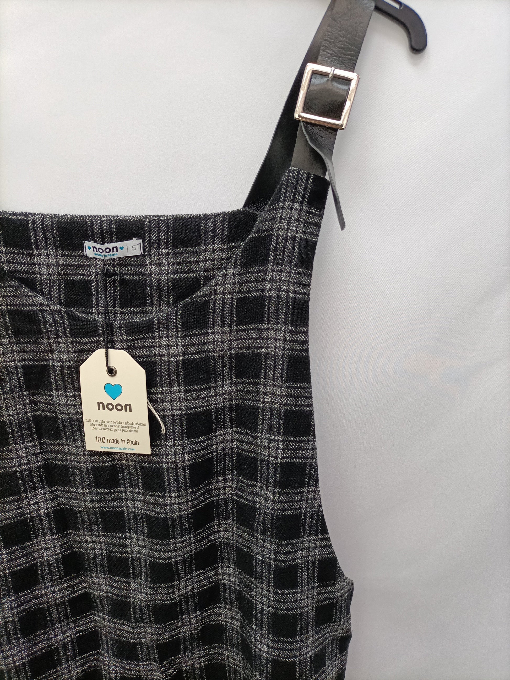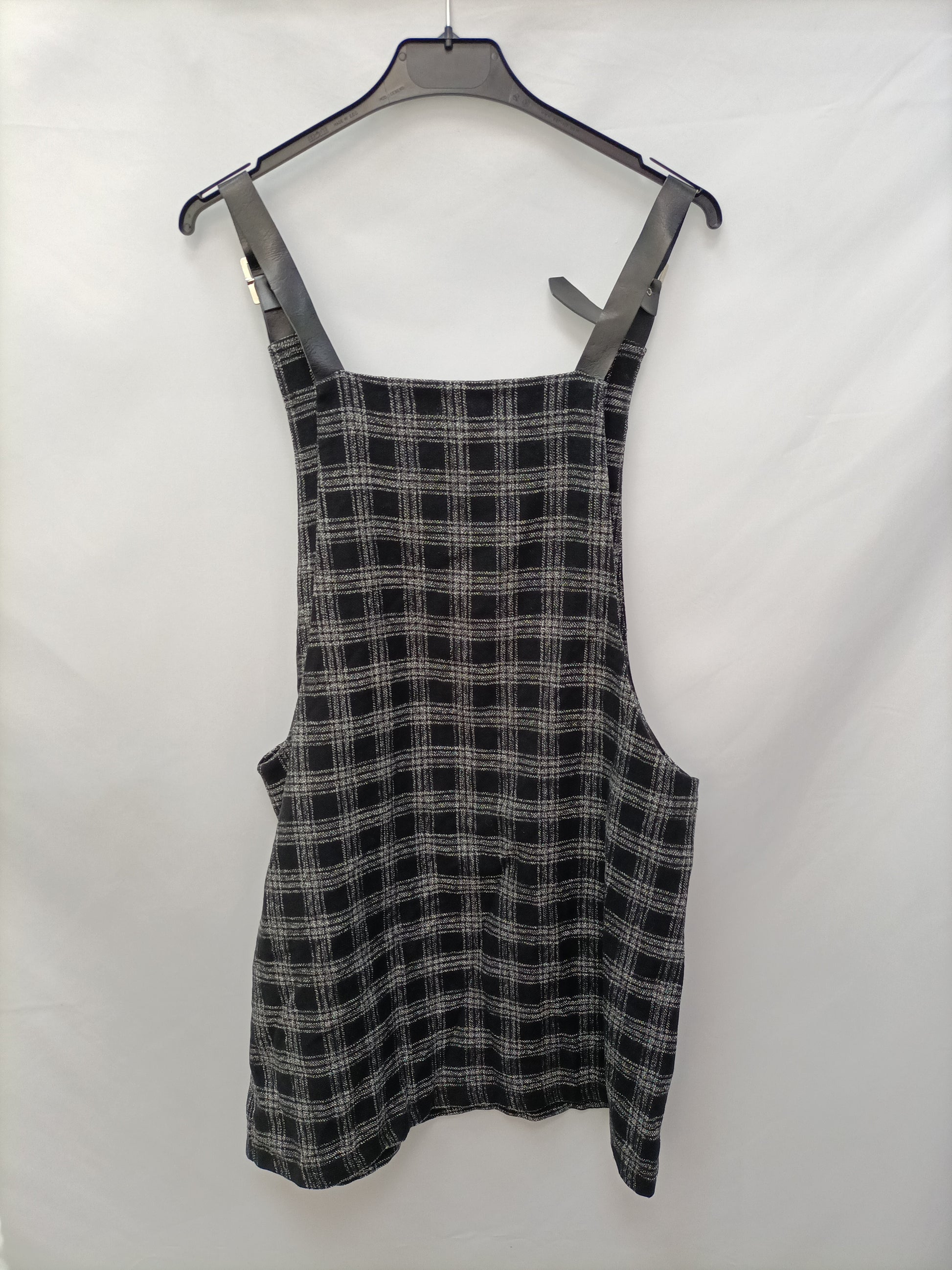 Peto de cuadros blanco y negro con tirante de tres altura. No elástico. Cintura 48 cm largo 85 cm