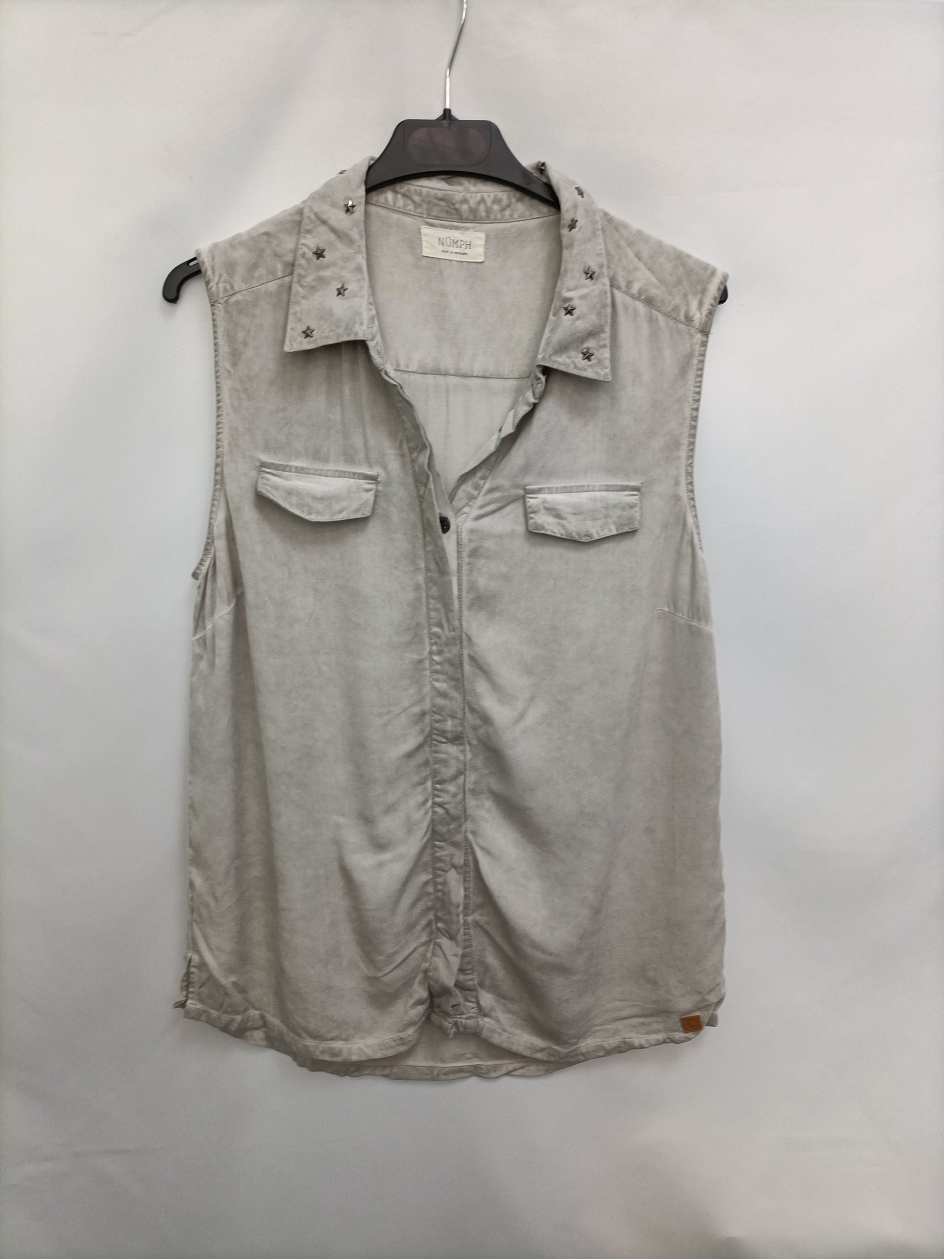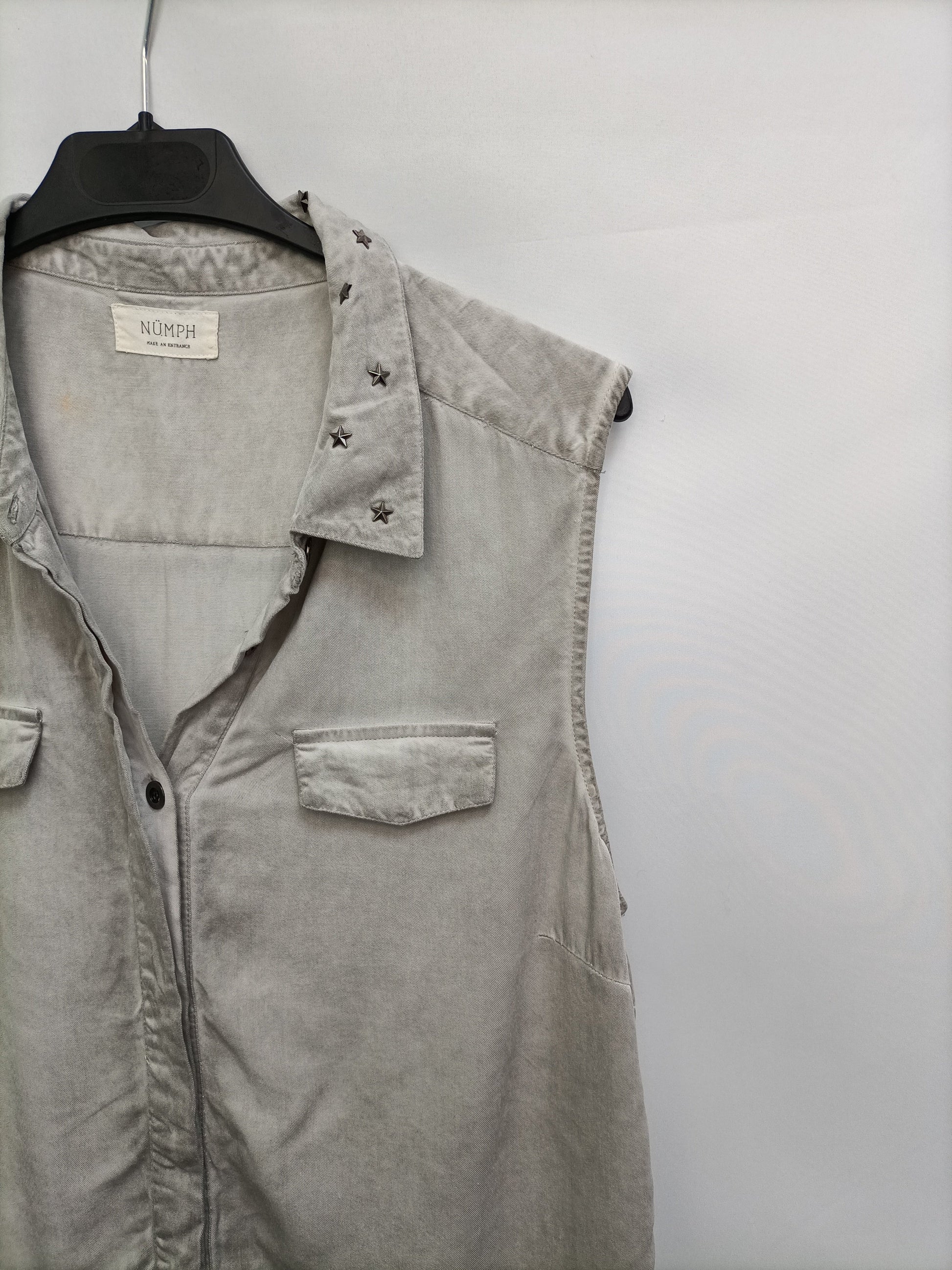 Blusa gris efecto lavado con tachuelas de estrellas plateadas en el cuello. De sisa a sisa 52 cm largo 70 cm