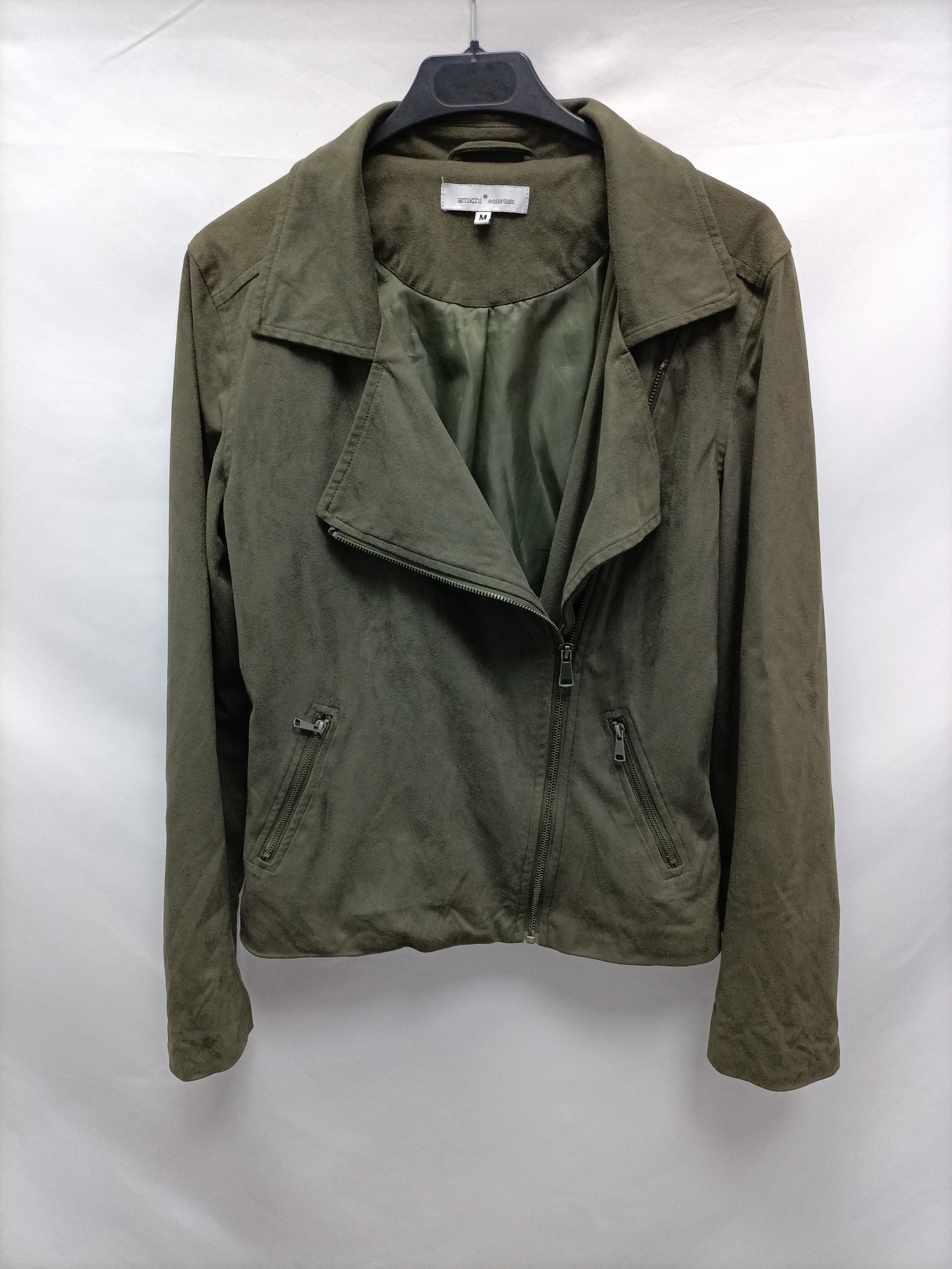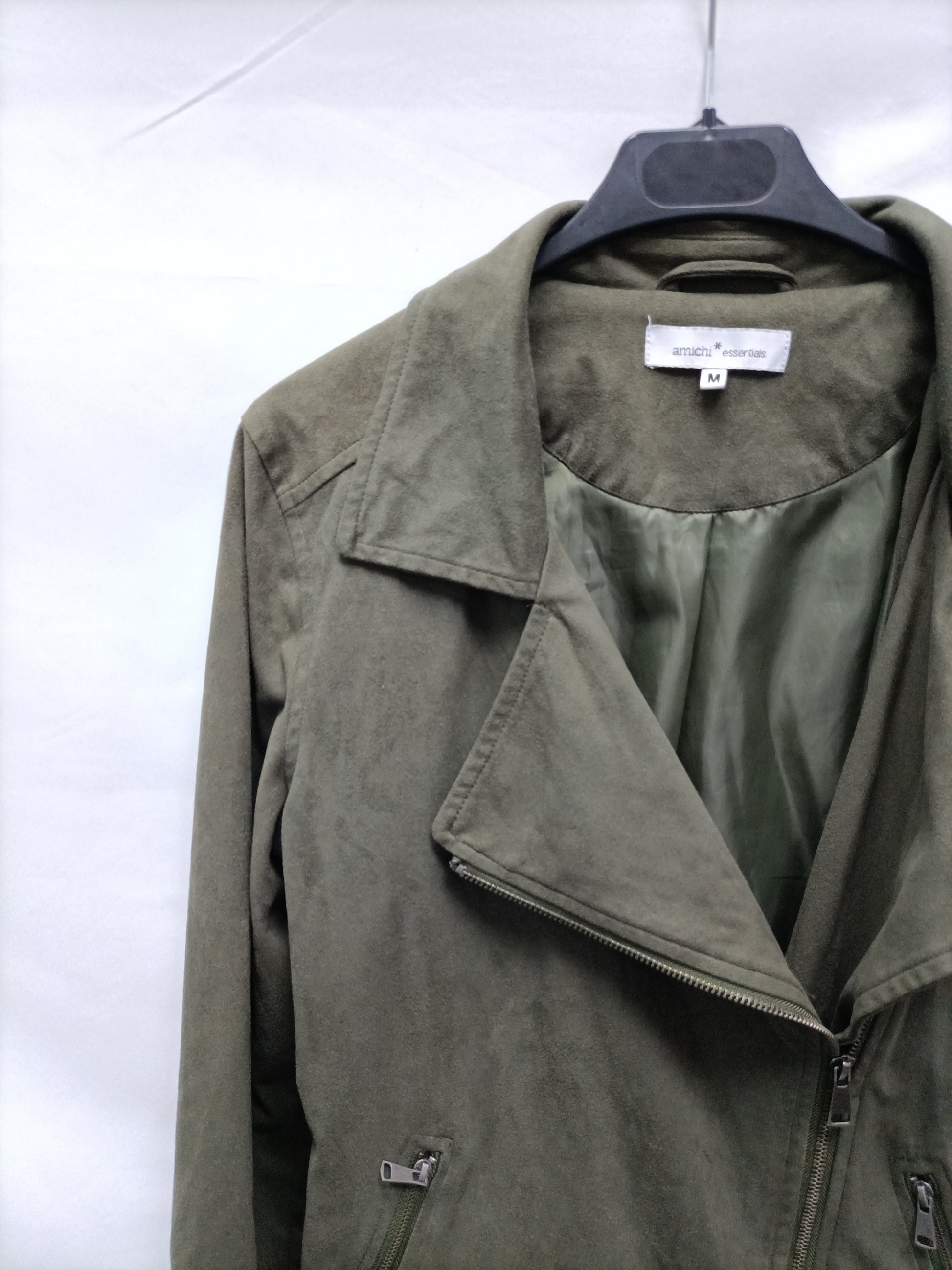 Cazadora verde de antelina con cremallera. Fluida y fina. Semielástica. De sisa a sisa 47 cm Largo 59 cm