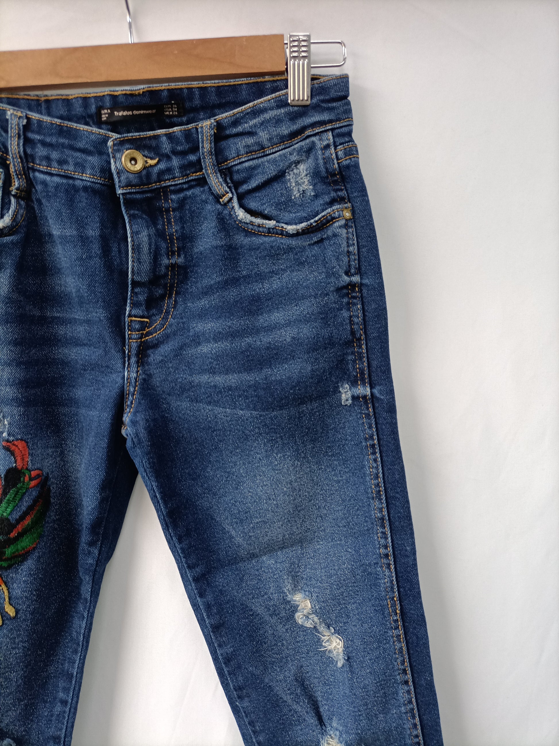 Pantalón recto vaquero oscuro bordes. No elástico. Cintura 34 cm Largo 78 cm