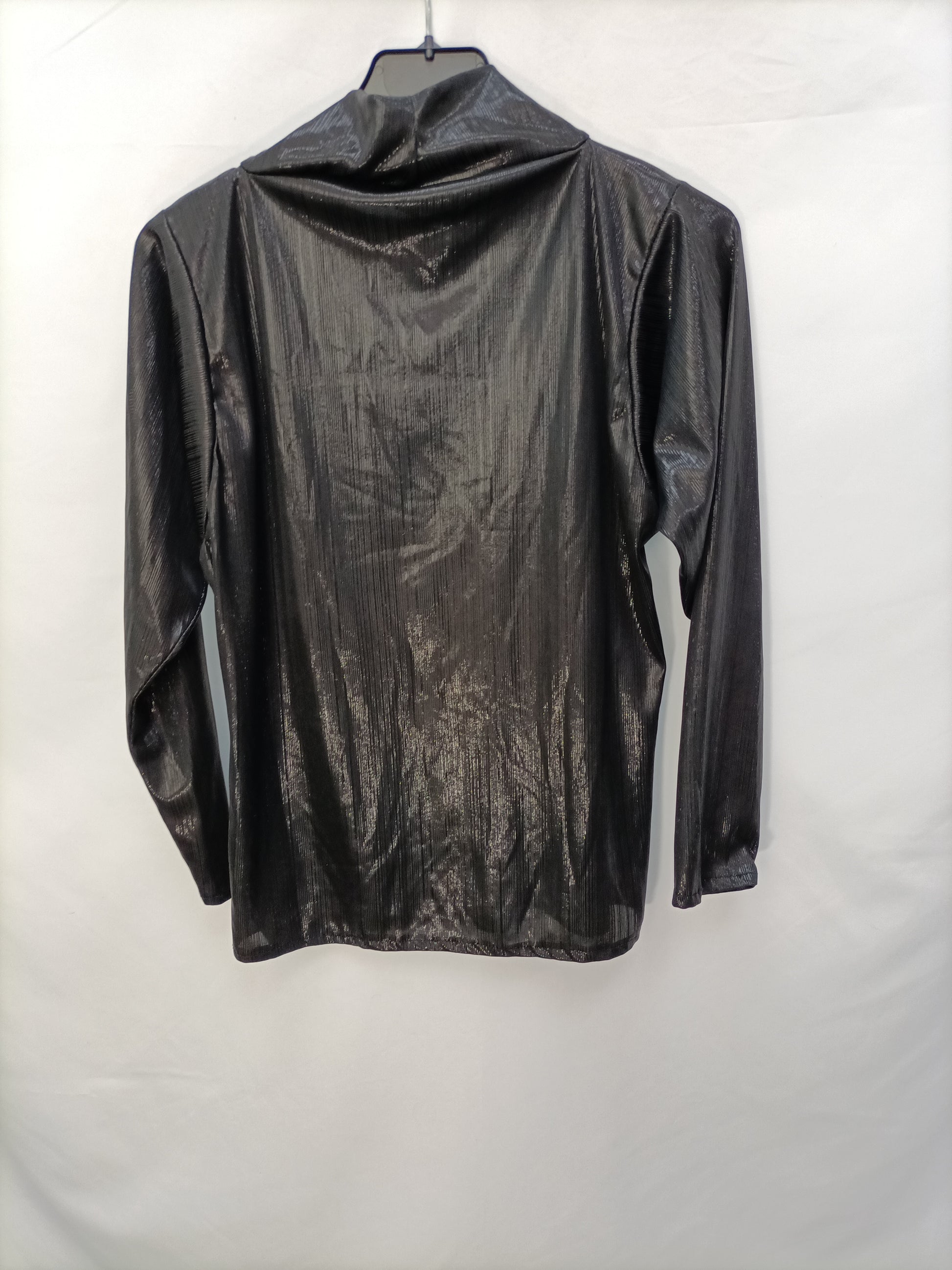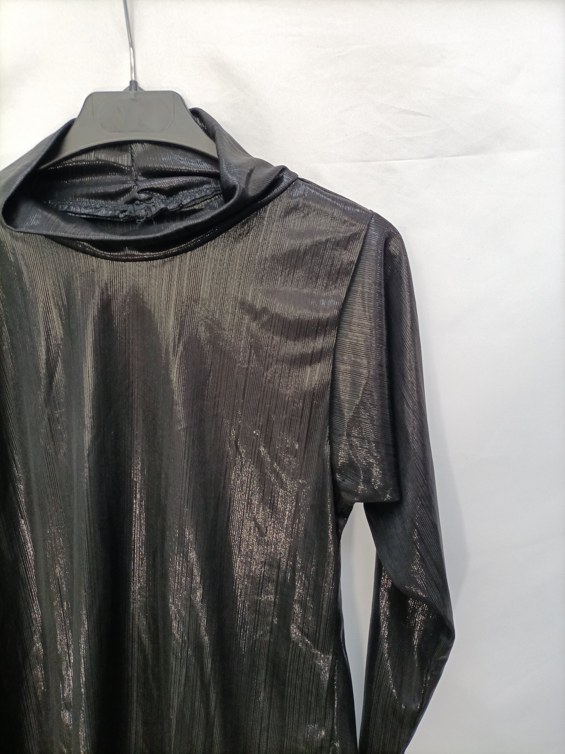 Top negro de tejido brillante. Elastico y cuello perkins. Largo 58 cm