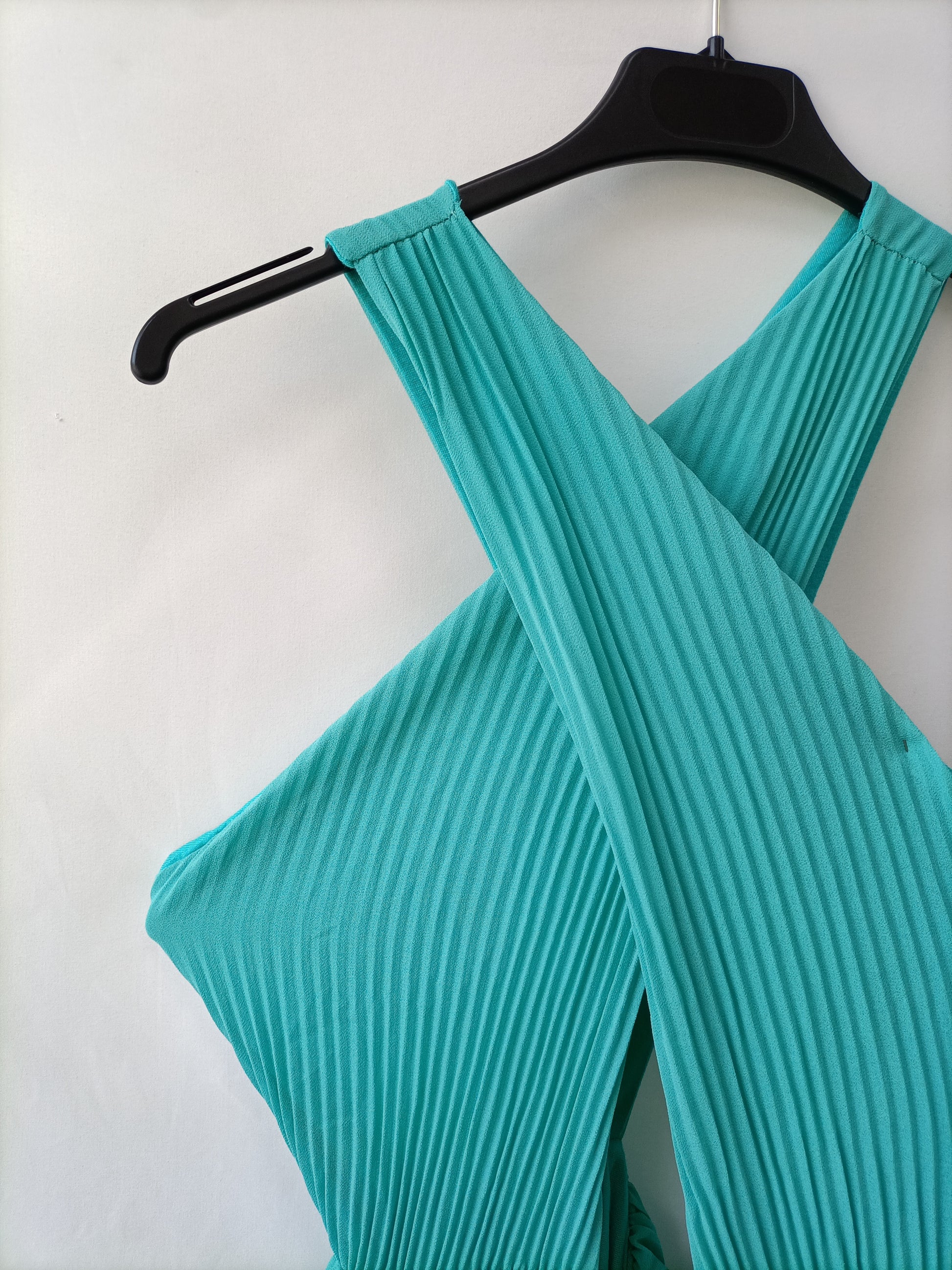 NUEVO CON ETIQUETA. Vestido midi/largo plisado verde con escote y espalda cruzado. Elastico. Largo 133 cm