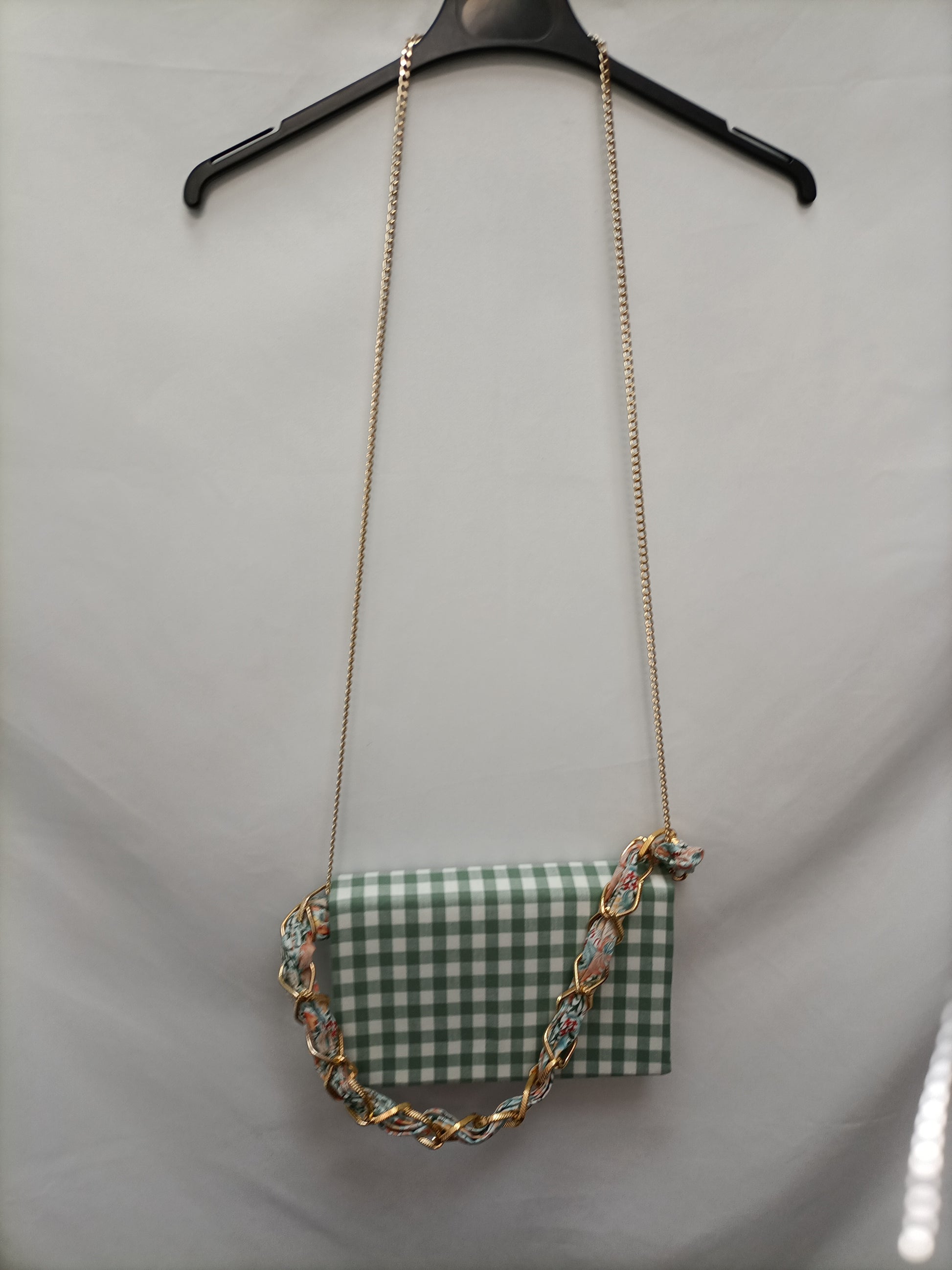 Bolso de cuadros vichi blanco y verde con cadena larga dorada y cortita trenzada con tira de flores. Rijido. 26x17x 5 cm