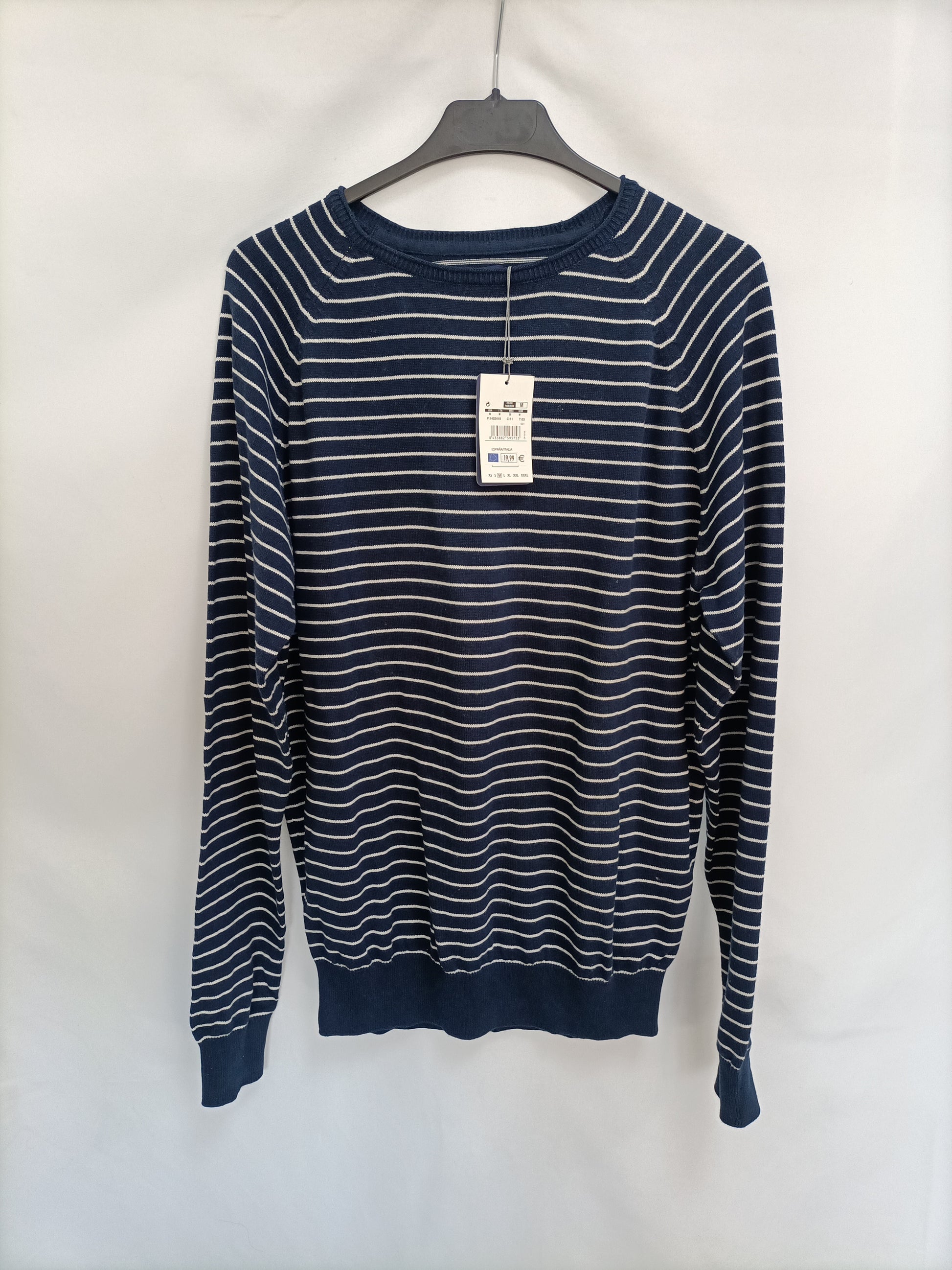 NUEVO CON ETIQUETA. Jersey azul con rayas blancas. Elastico. Largo 66 cm