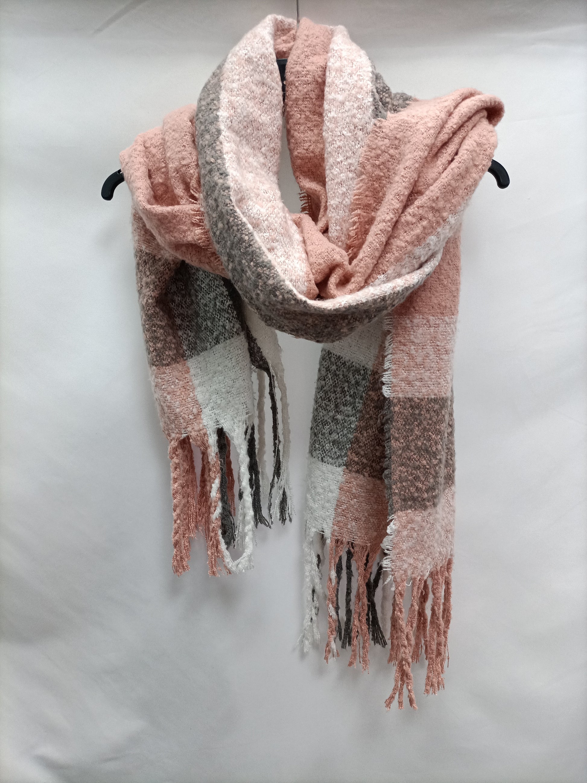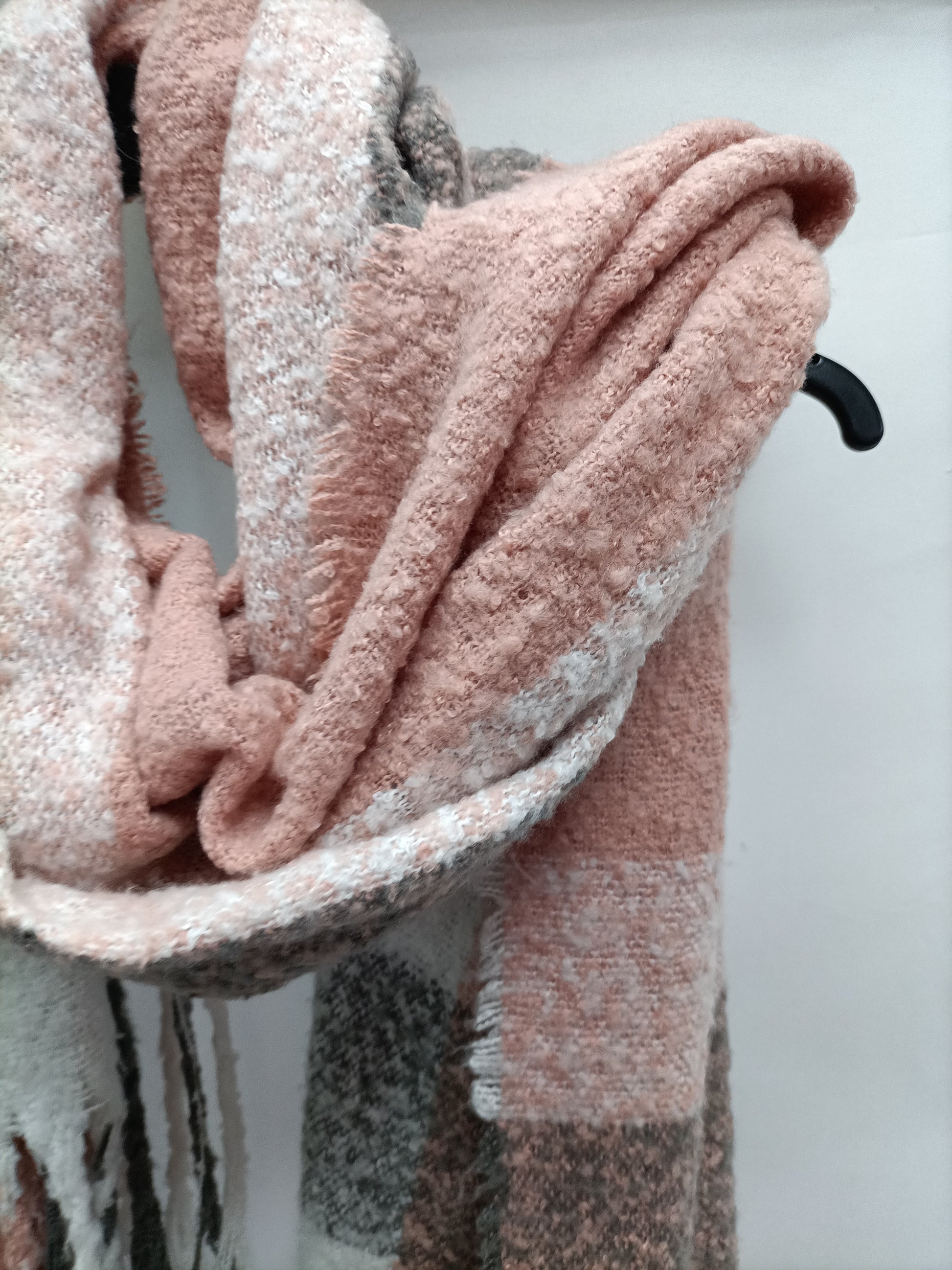Bufanda de de cuadros en tonos grises, blancos y rosas. Gordita.