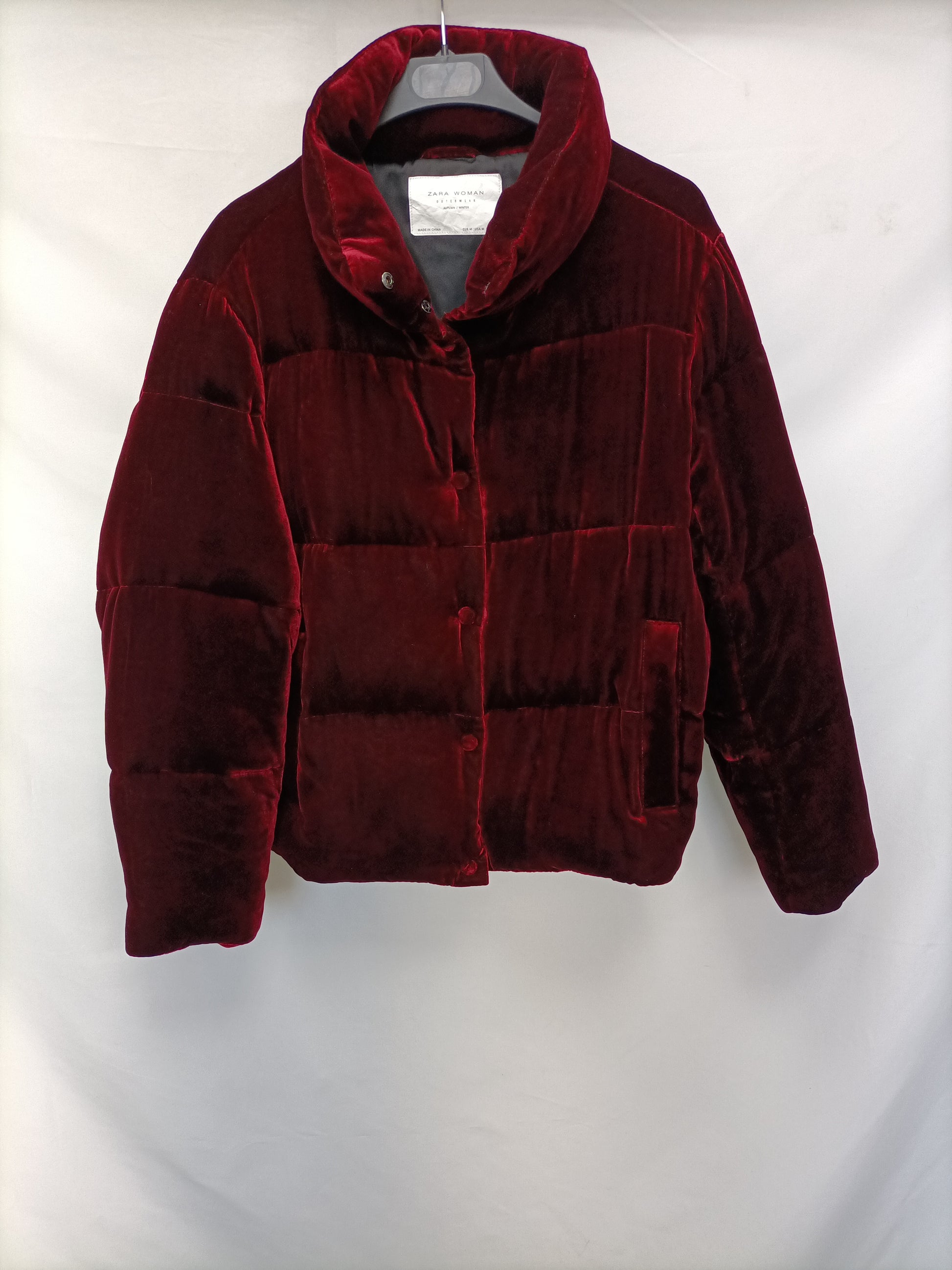 Plumas cortito de terciopelo burdeos. No pesa. Es abrigoso. Se abrocha con botones de clip. De sisa a sisa 60 cm largo 66 cm