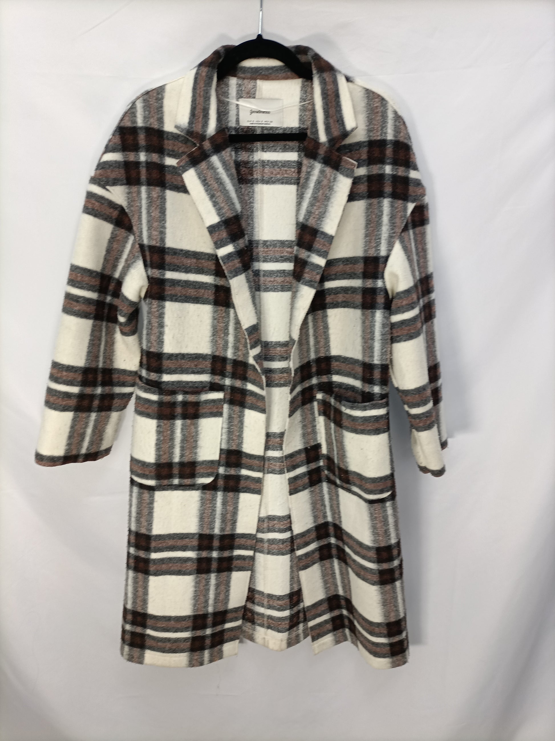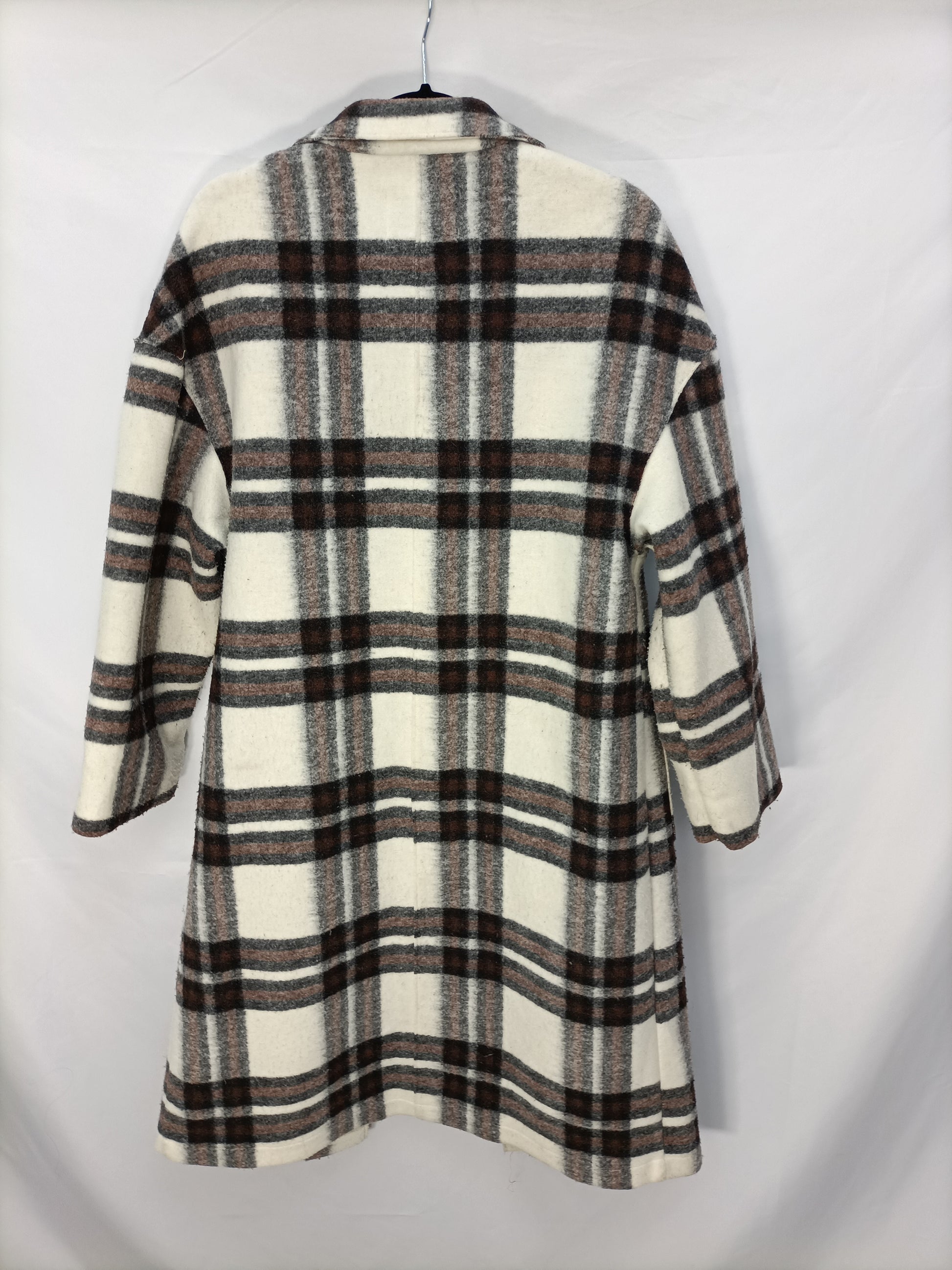 Abrigo largo de cuadros en tono beige y marrón. No se abrocha. No elástico. De sisa a sisa 56 cm Largo 113 cm
