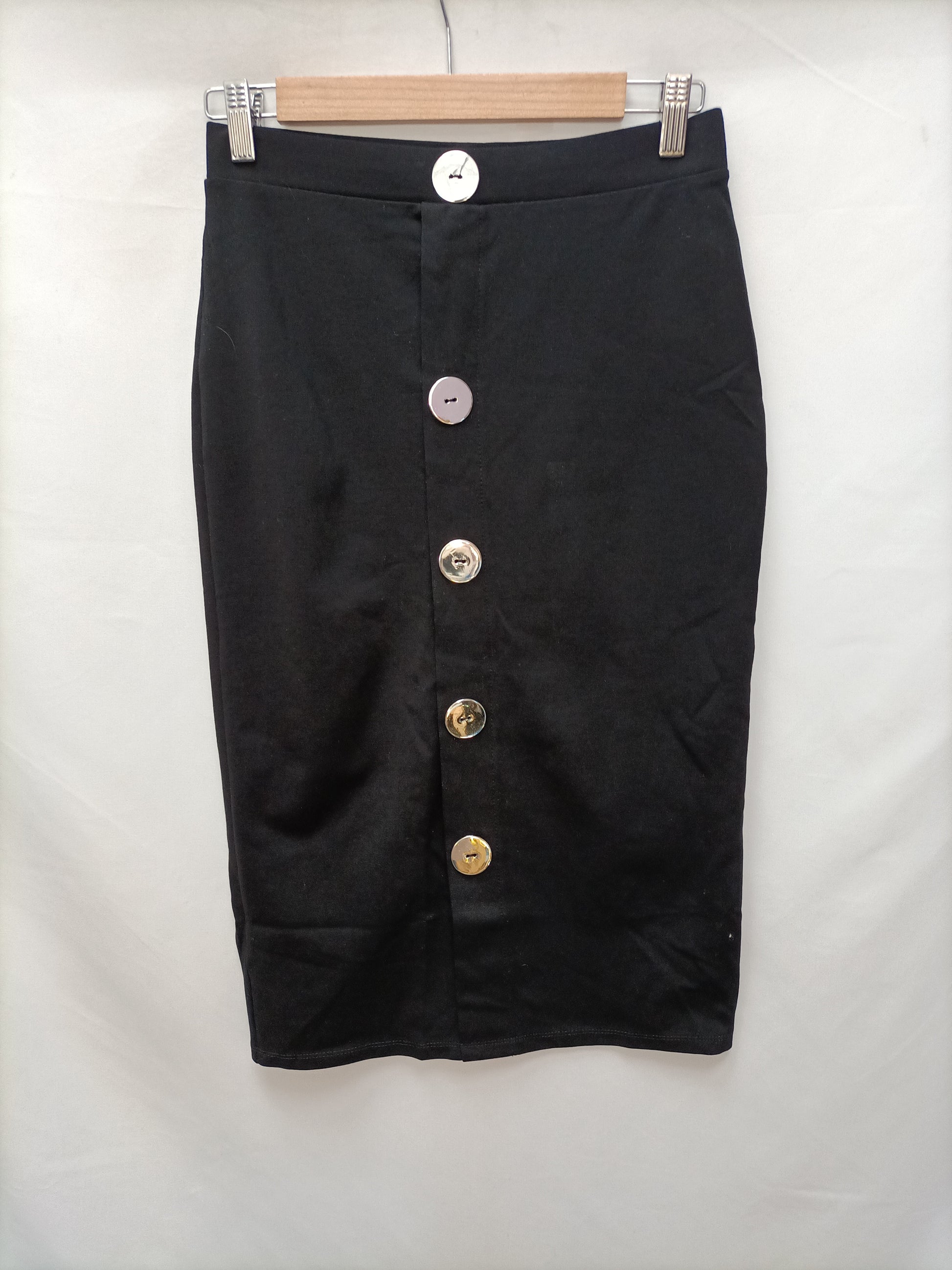 Falda negra modo de tejido elástico con detalle de botones delanteros. Largo 69 cm.
