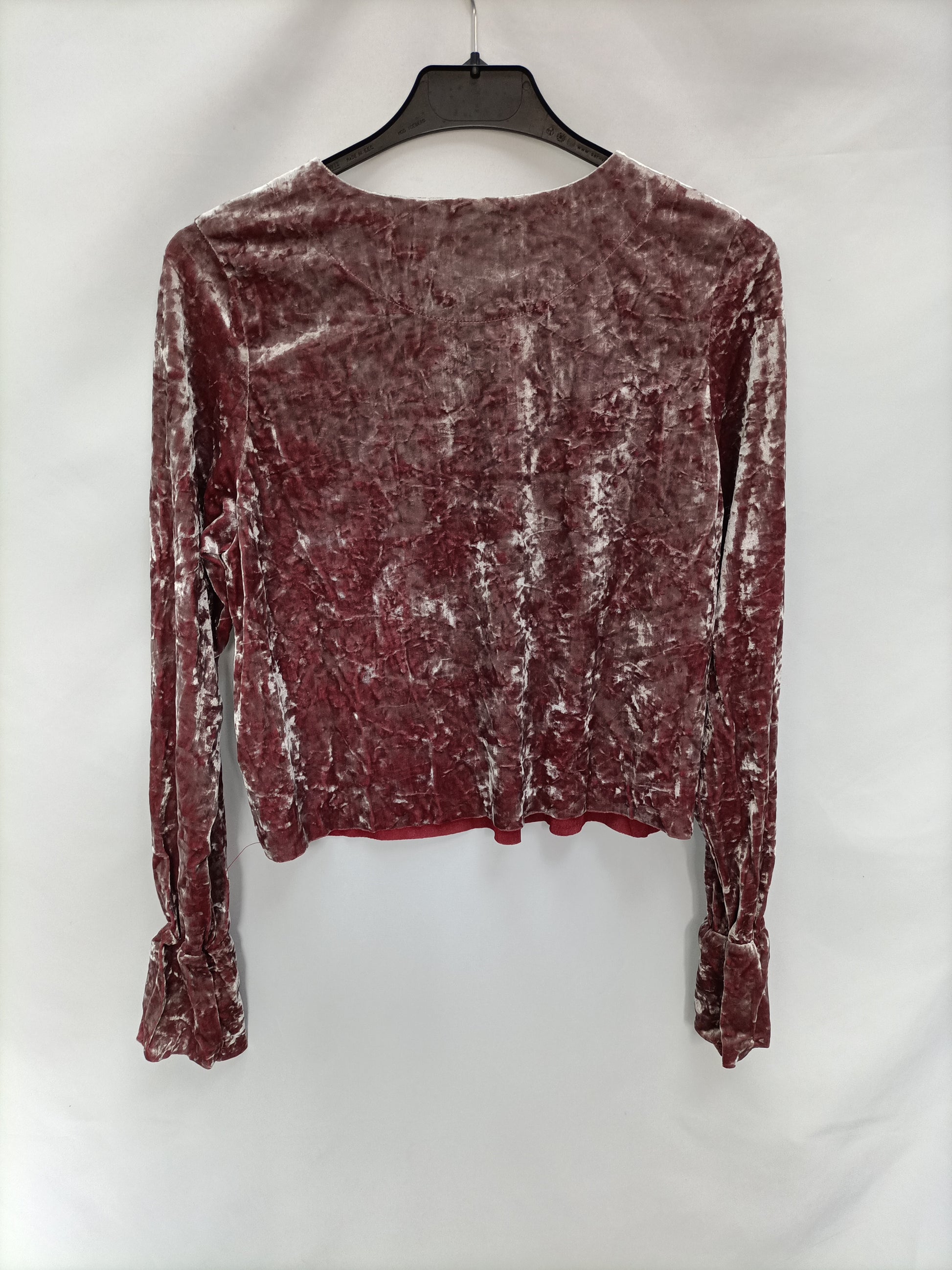 Top corto de terciopelo rosa con elástico en la muñecas haciendo efecto volante. Fluida y Elastica. Largo 44 cm