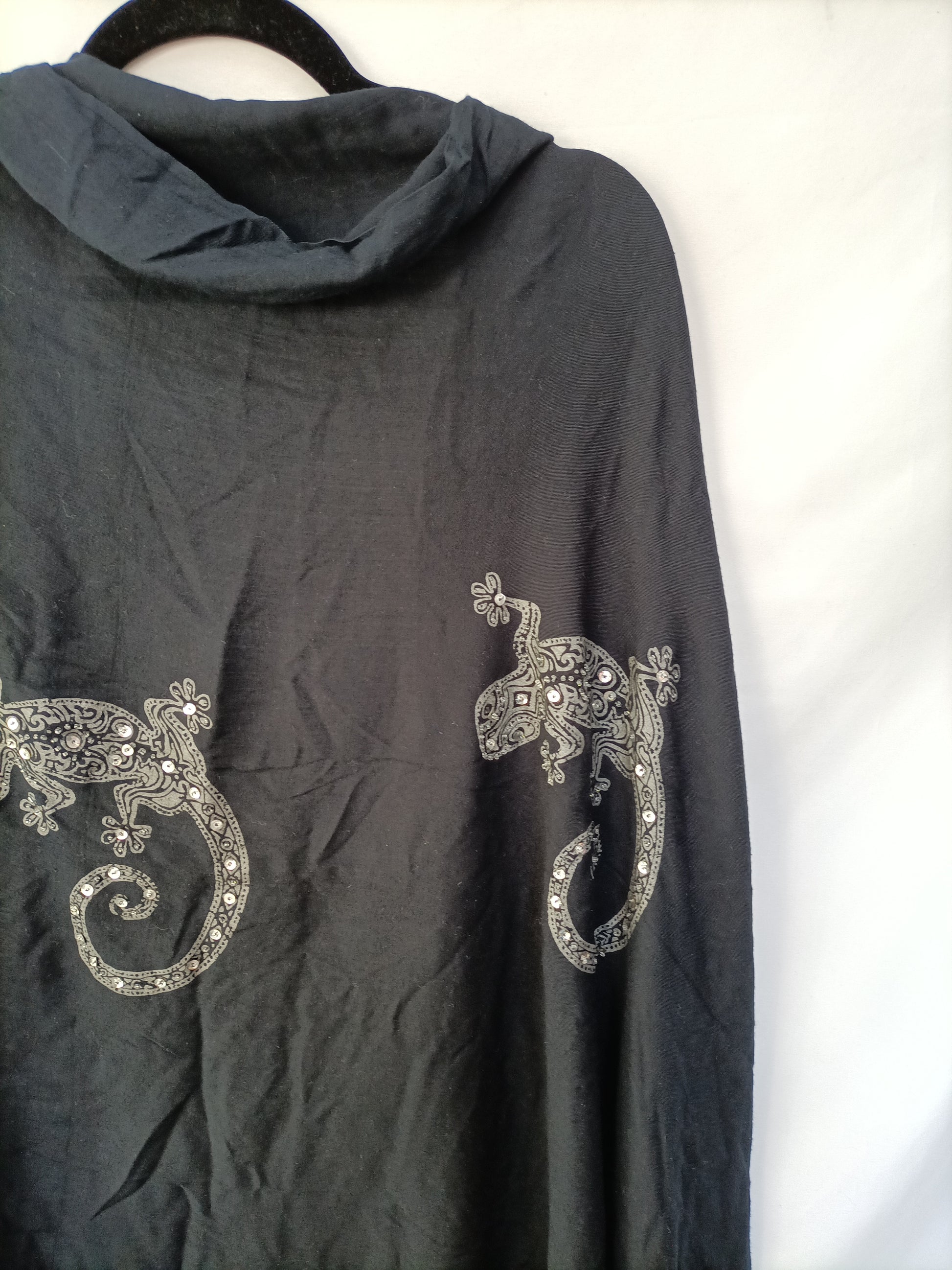 Fular negro oversized con estampado de lagartijas con pedrería. Fluido y finito.