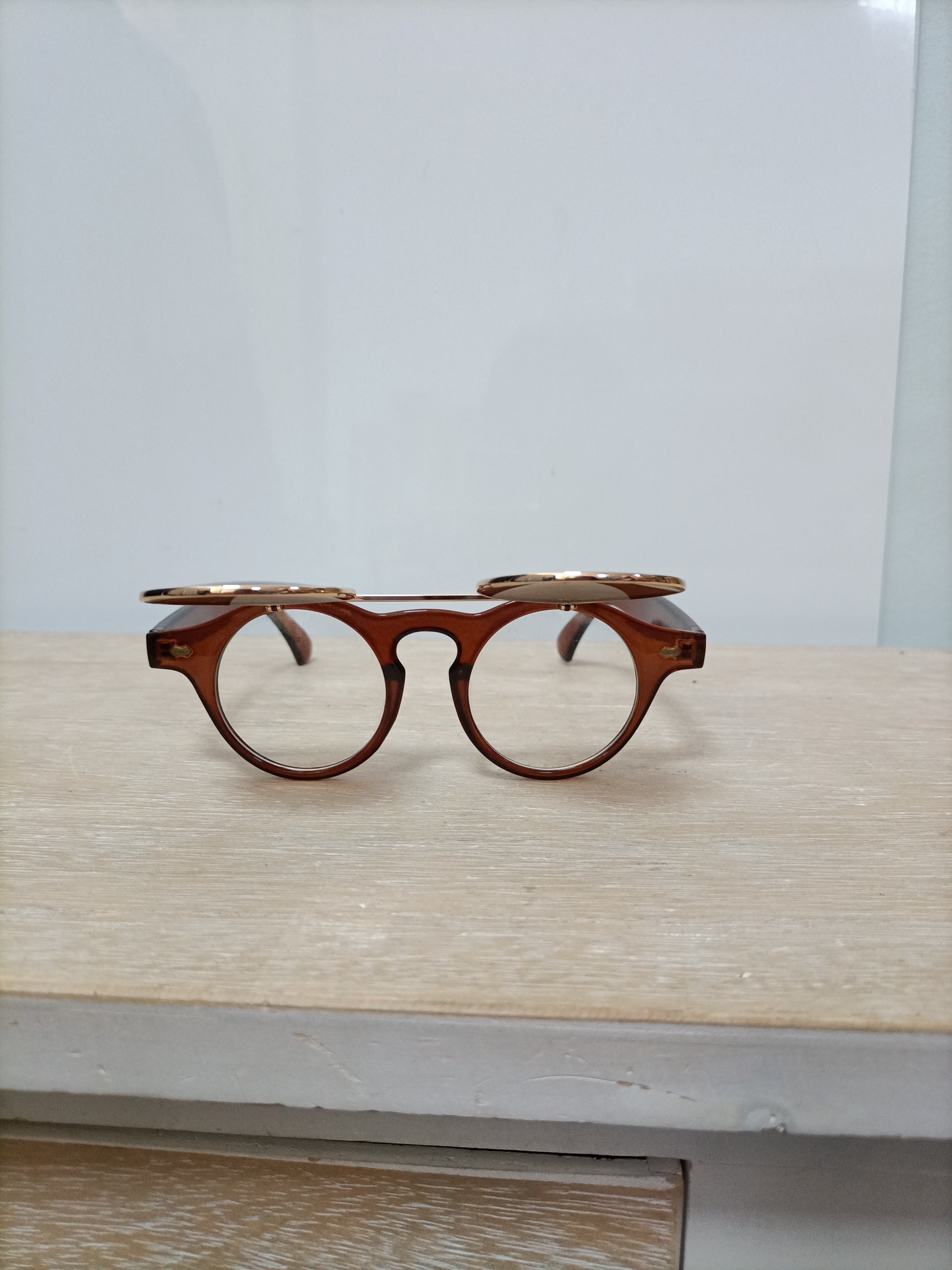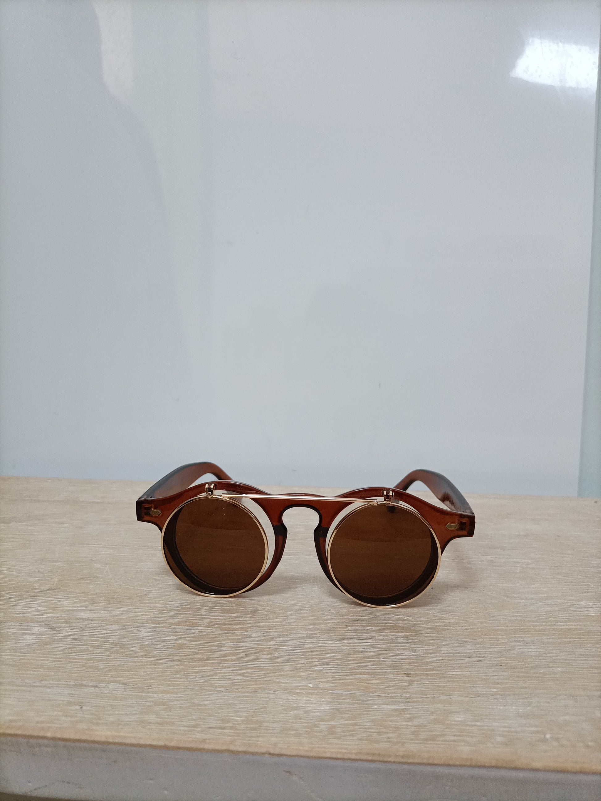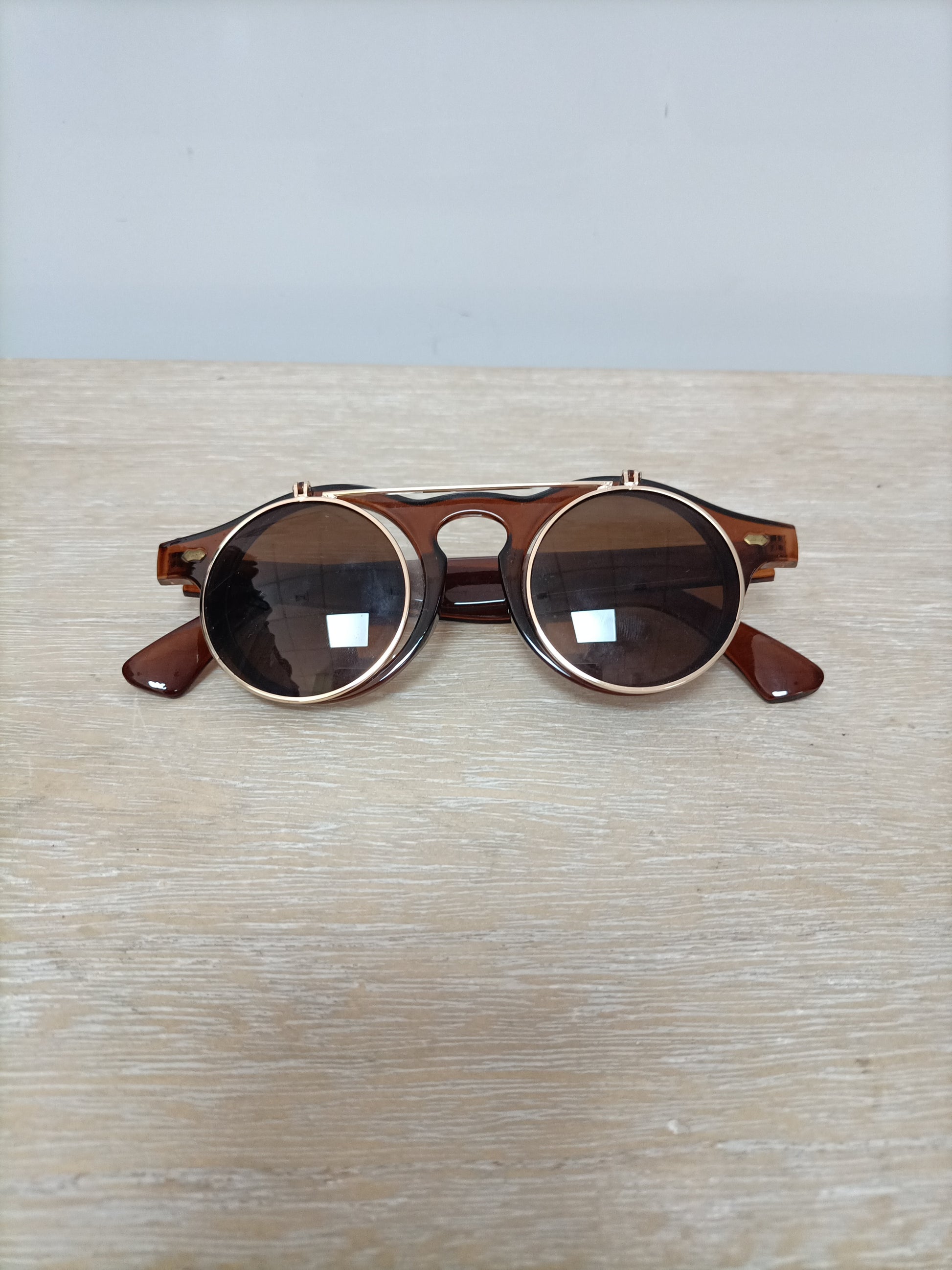 Gafas redondas marrones con crital solar levantable.