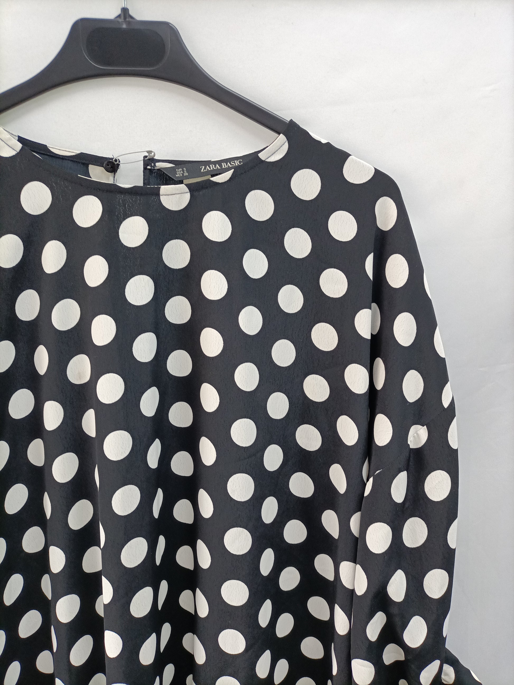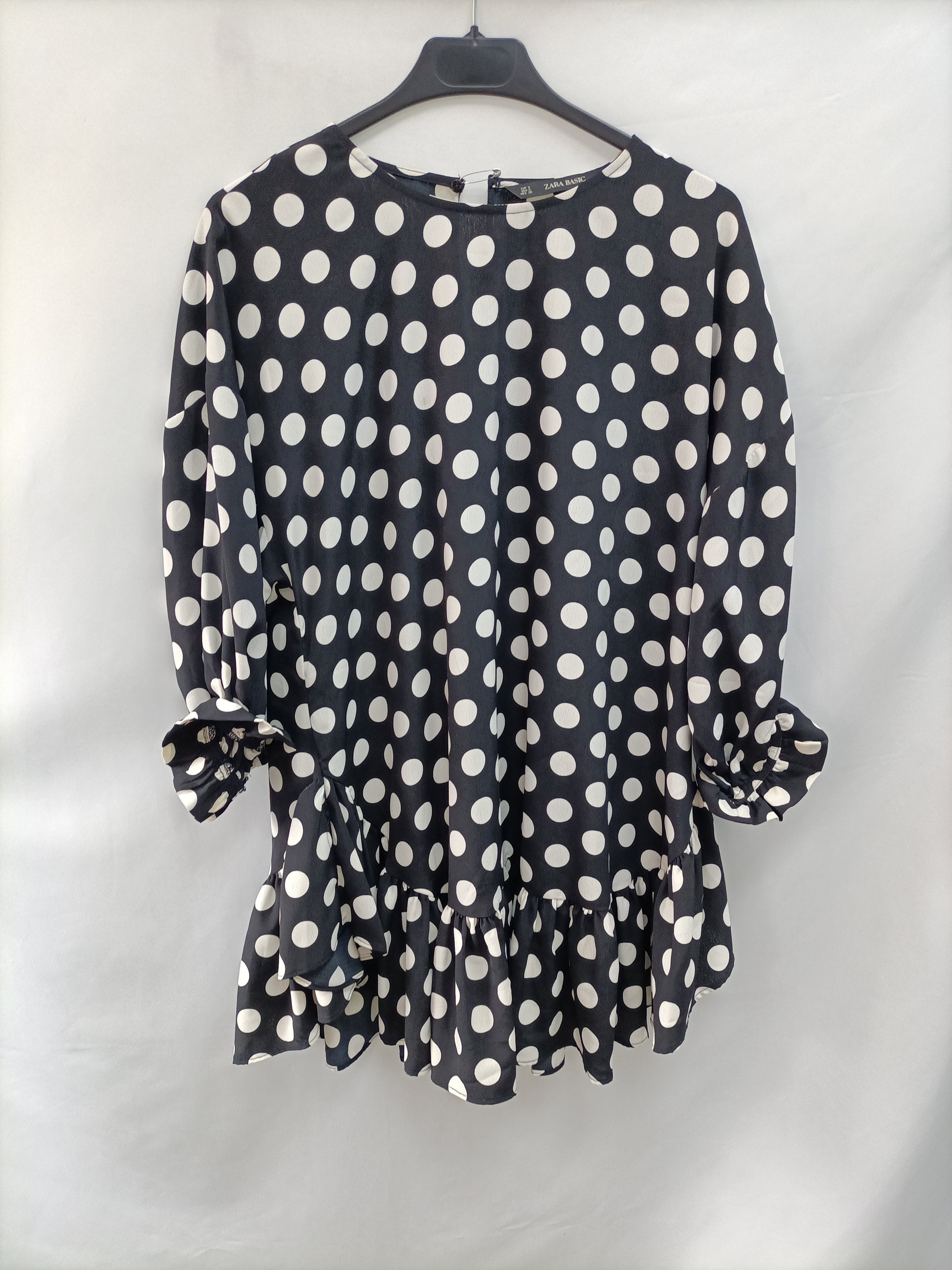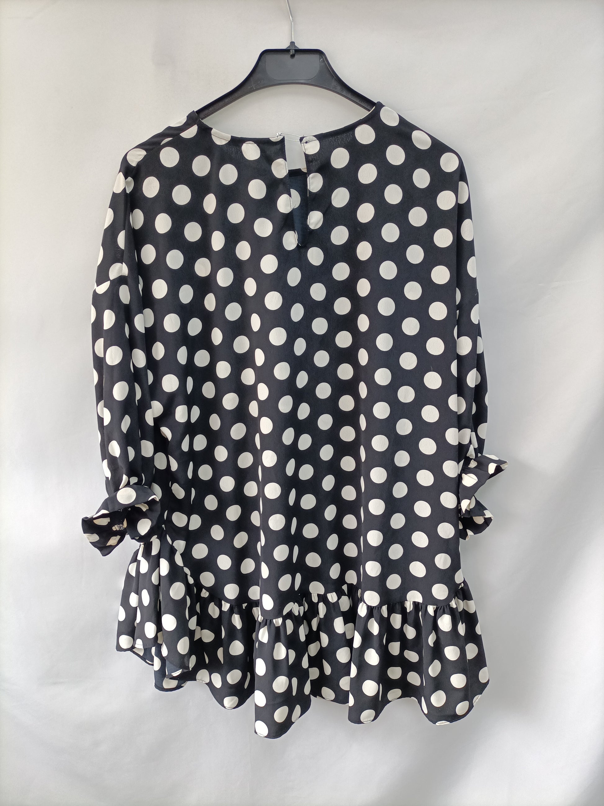Vestido muy cortito negro con lunares blanco y detalle de volantes. Largo 75cm
