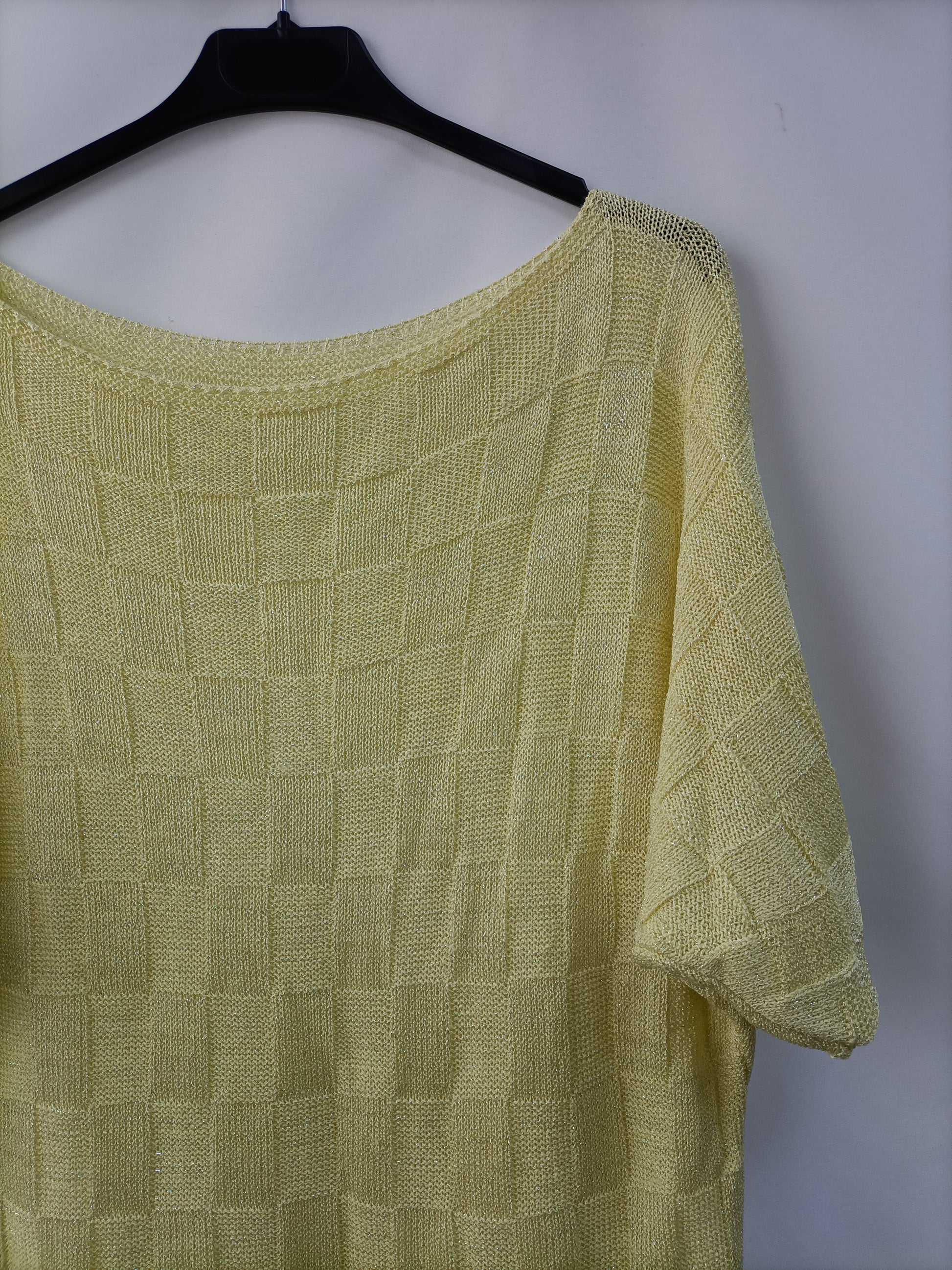 Top de punto amarillo de tejido de cuadros concñ detalle de hilos plateados. Largo 54 cm