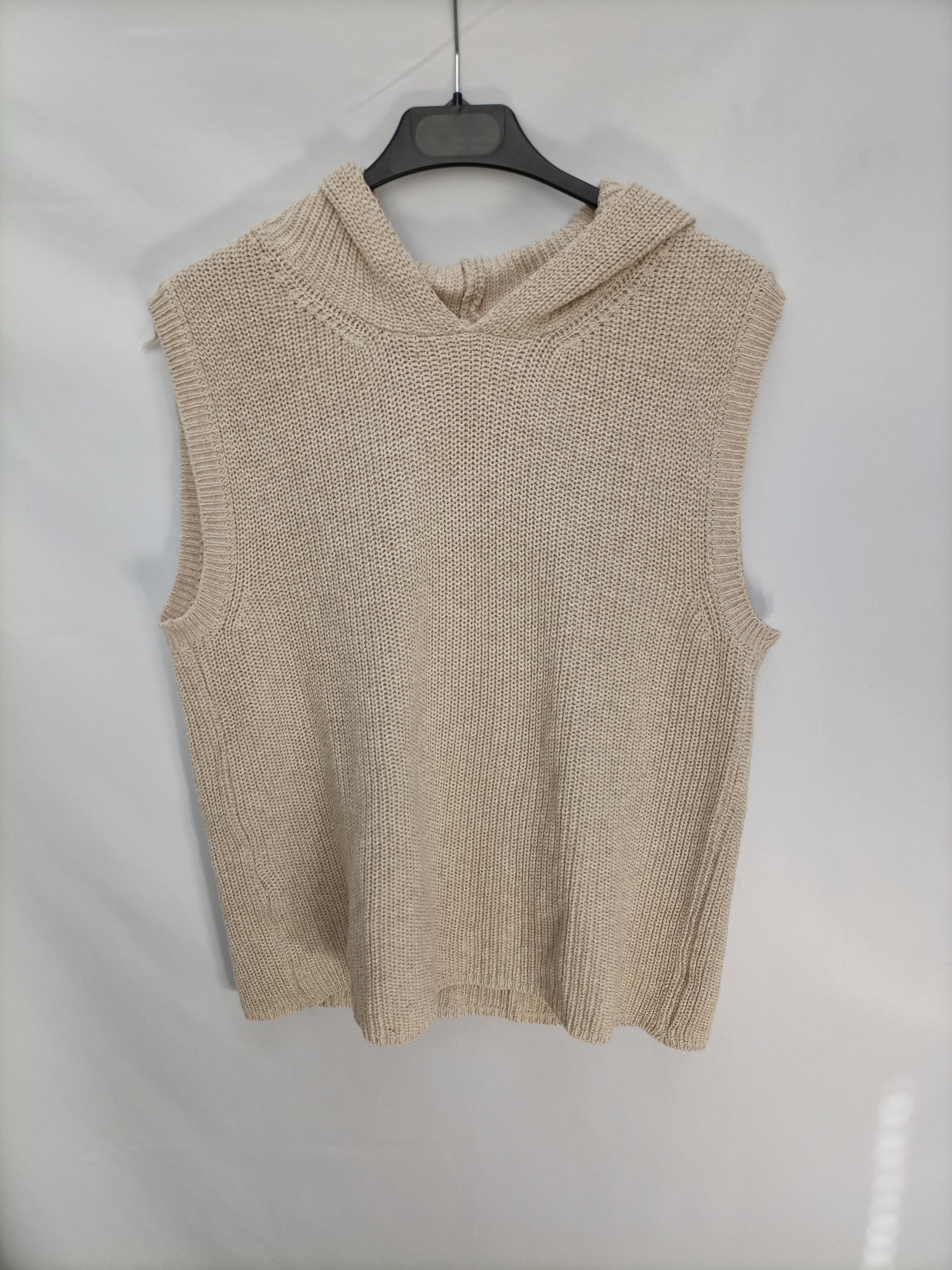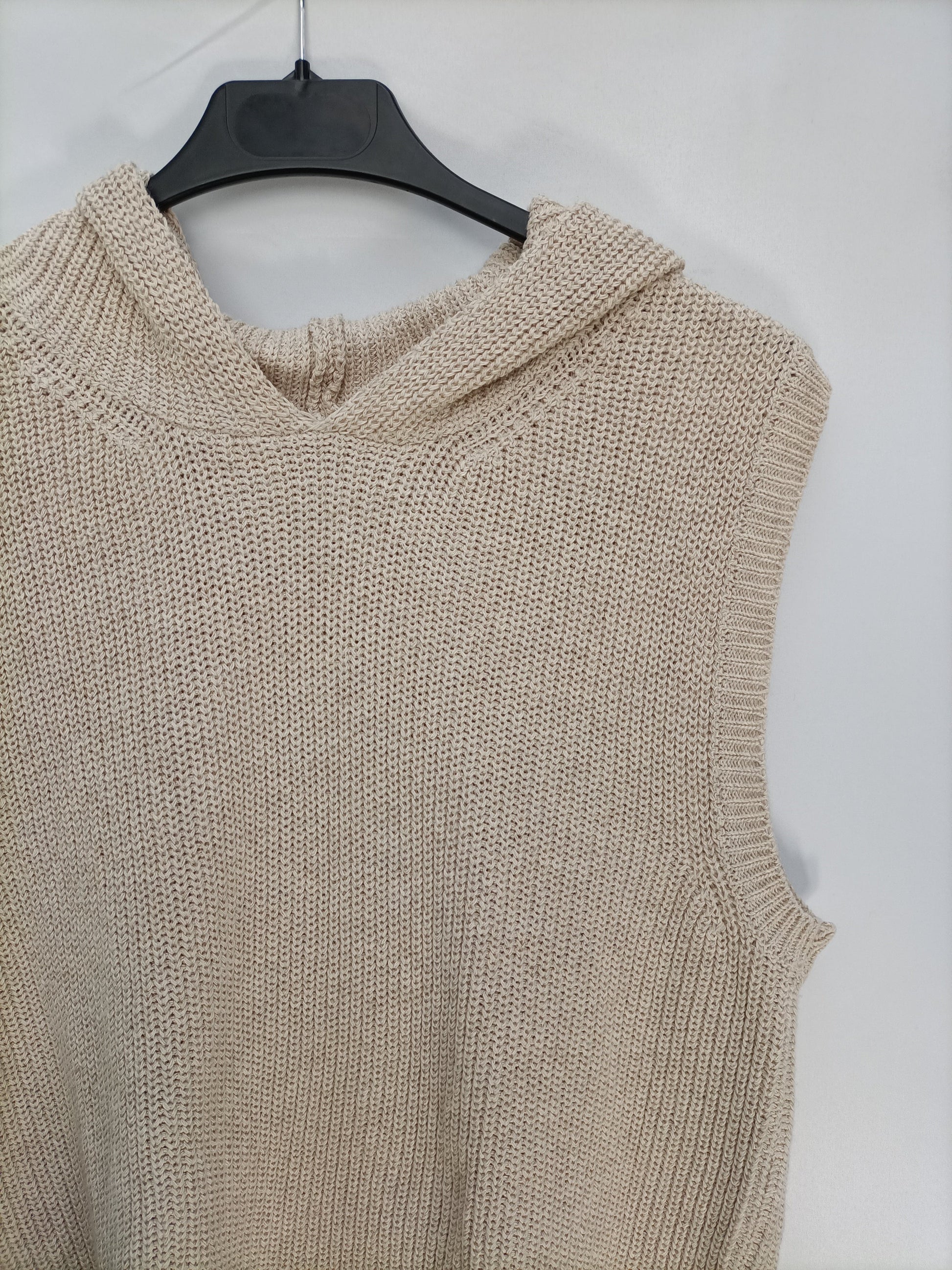 Jersey de punto beige sin mangas con capucha. Elastico. Largo 65 cm