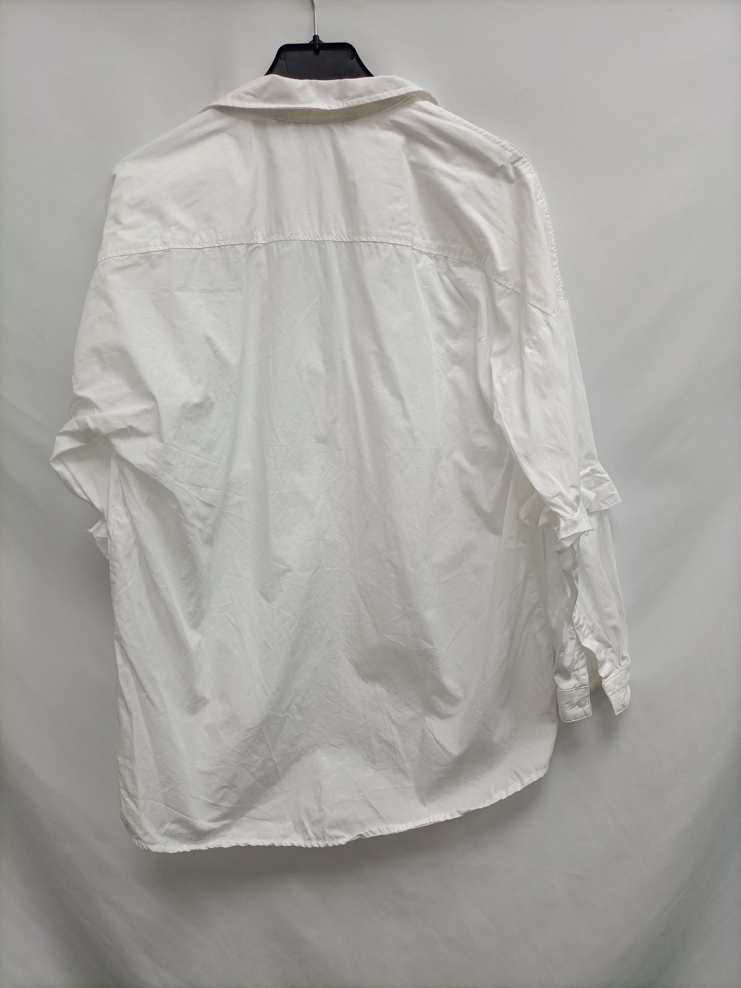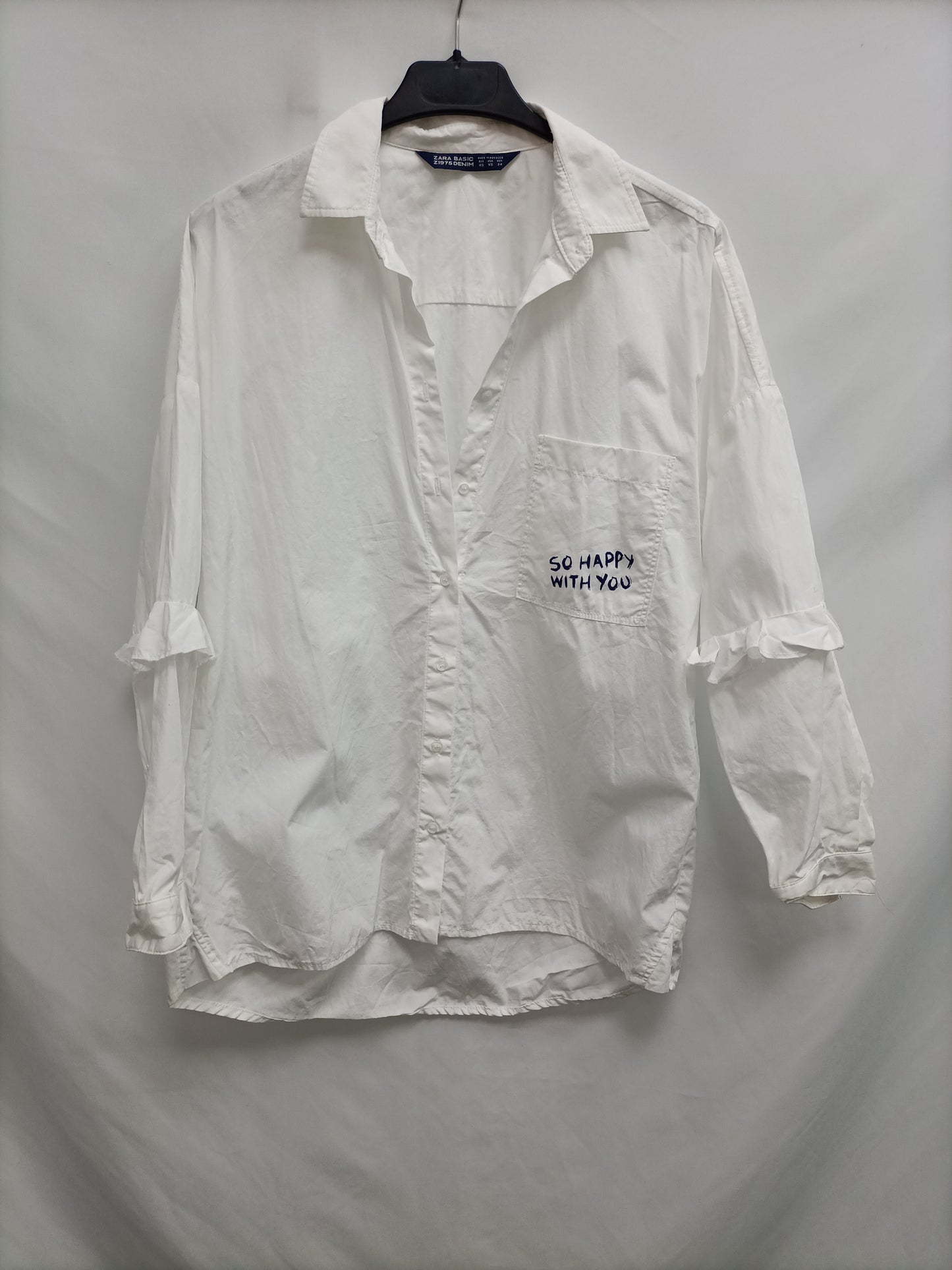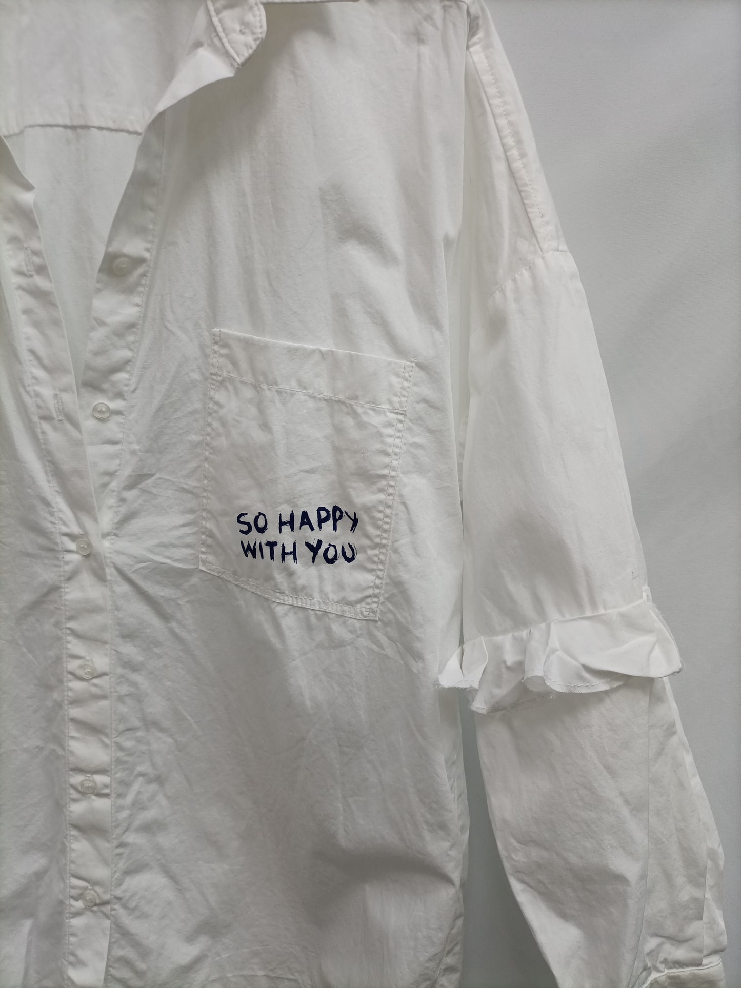 Camisa blanca con detalle de letras y volante en las msngas. No elástica. De sisa a sisa 52 cm Largo 63 cm