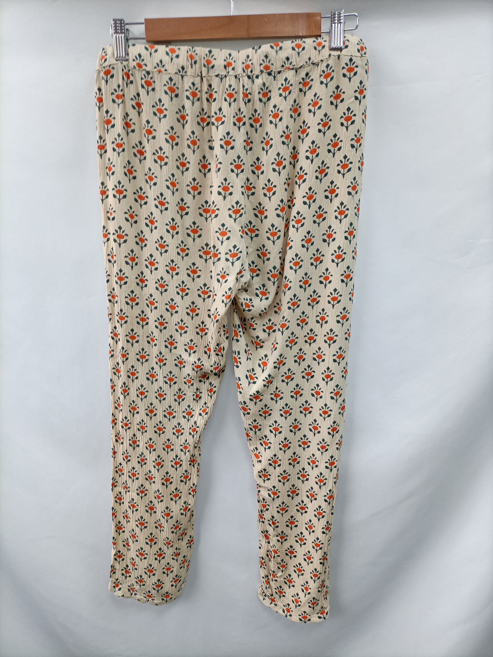 Pantalón fluido beige de flores con tejido estilo plisado. Cintura elástica ajustable con cuerda. largo 92 cm