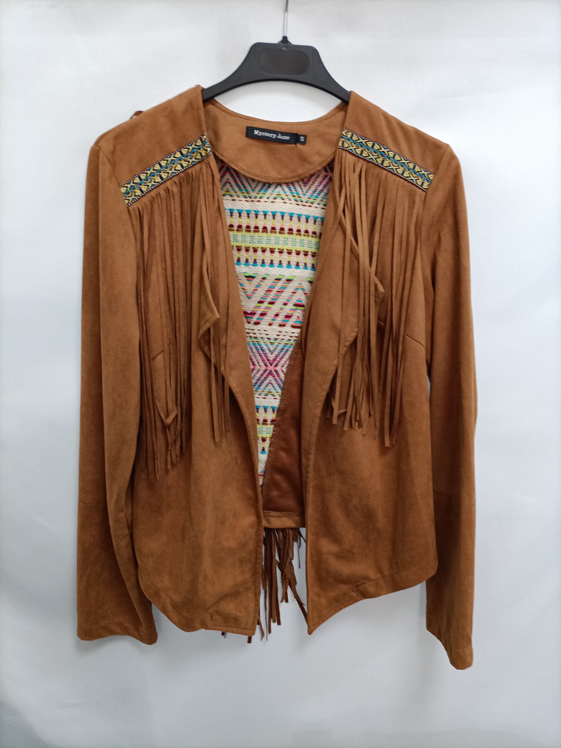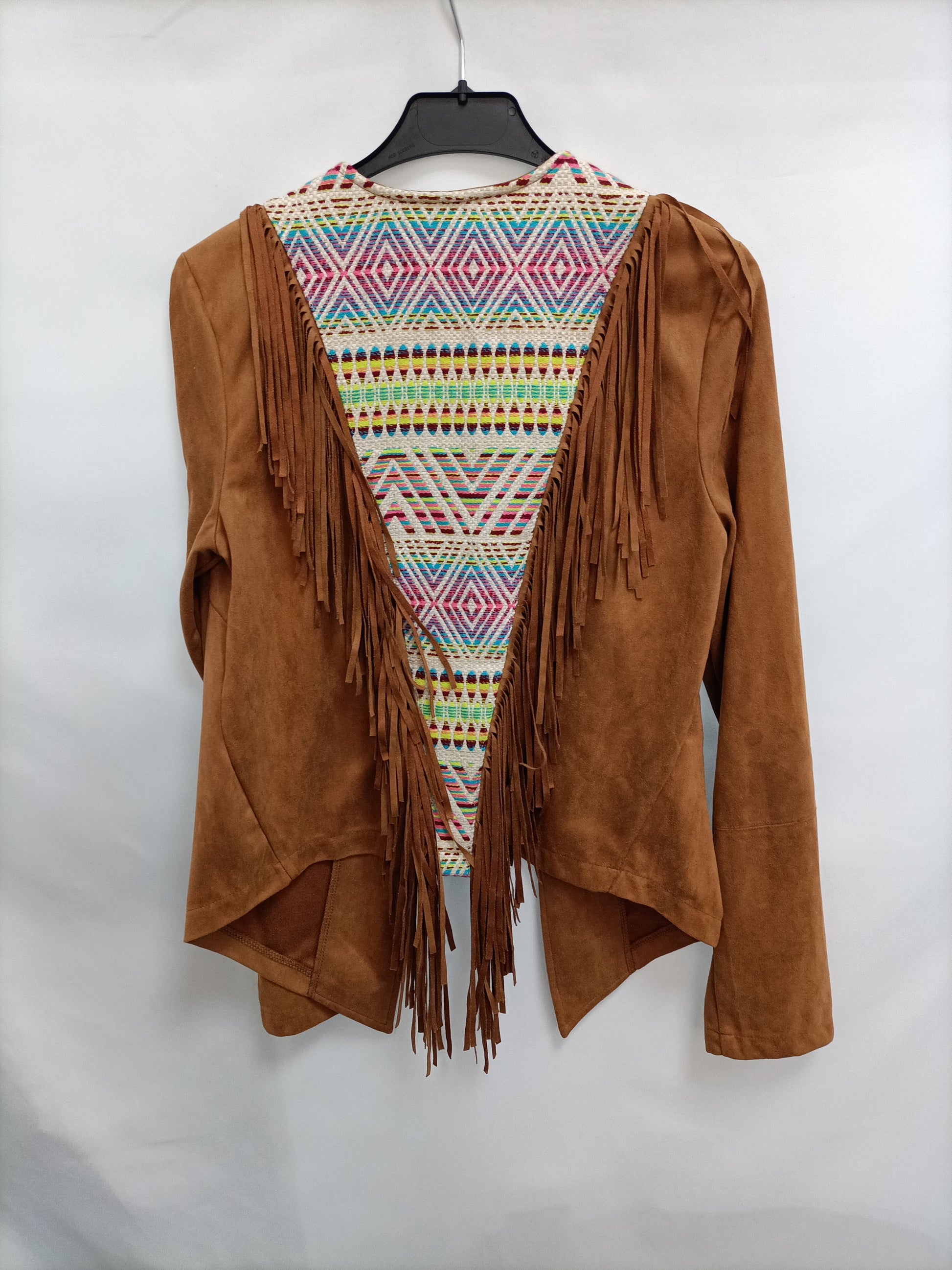 Chaqueta de antelina marrón con flecos detalle étnico en la espalda. Semielastica. De sisa a sisa 47 cm Largo 48 cm