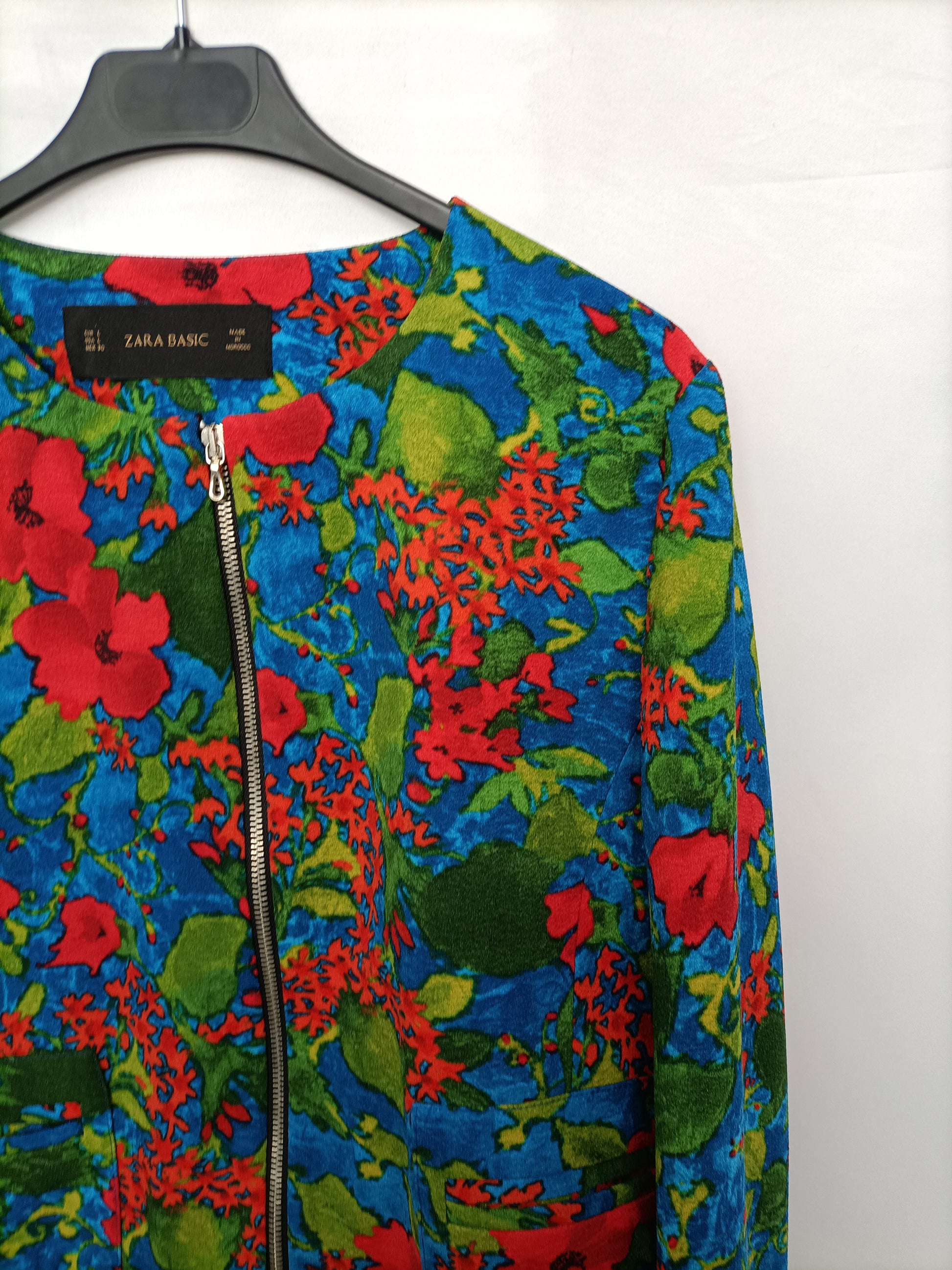Chaqueta azul turquesa con flores verdes y rojas. Se abrocha con cremallera. De sisa a sisa 48 cm Largo 46 cm